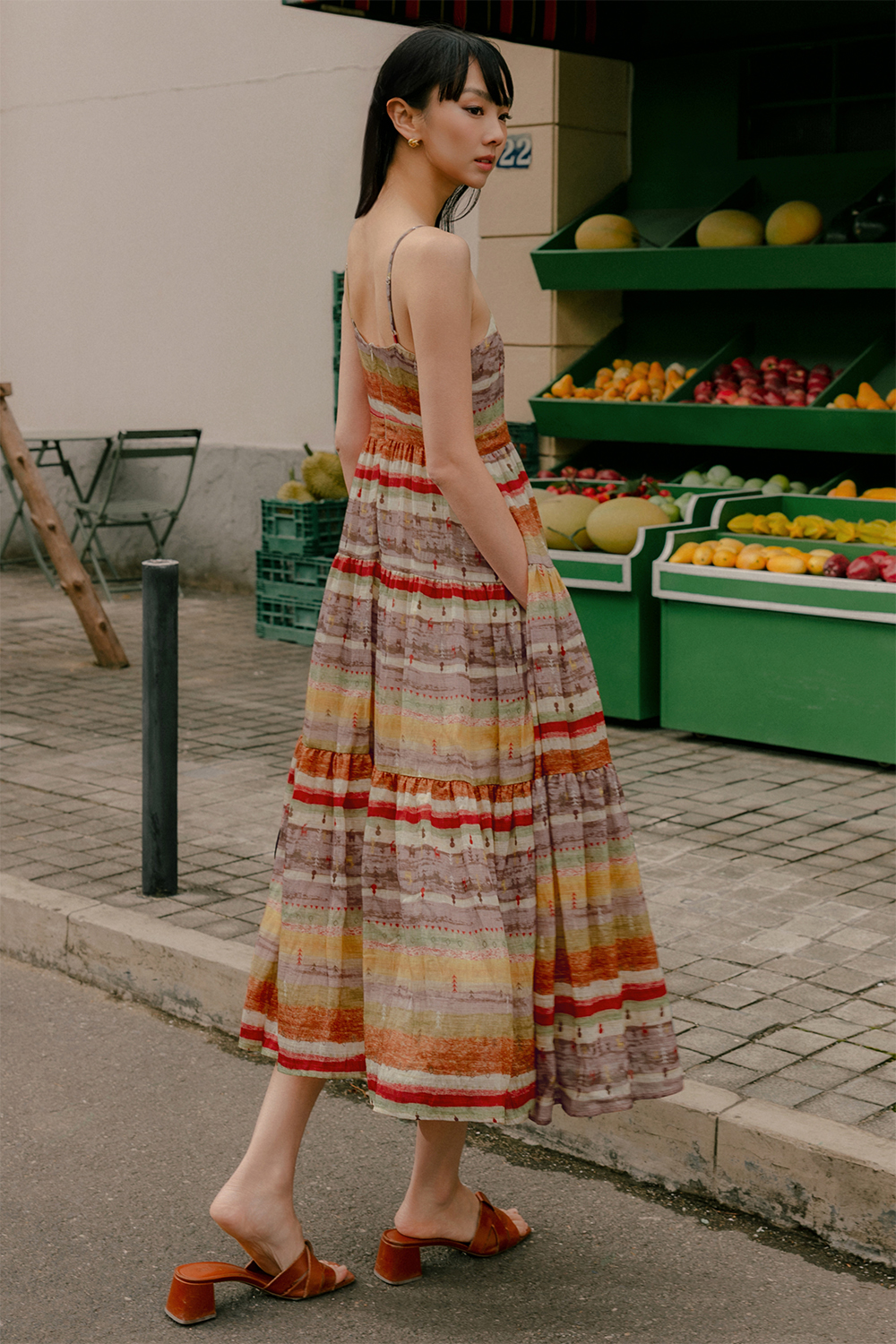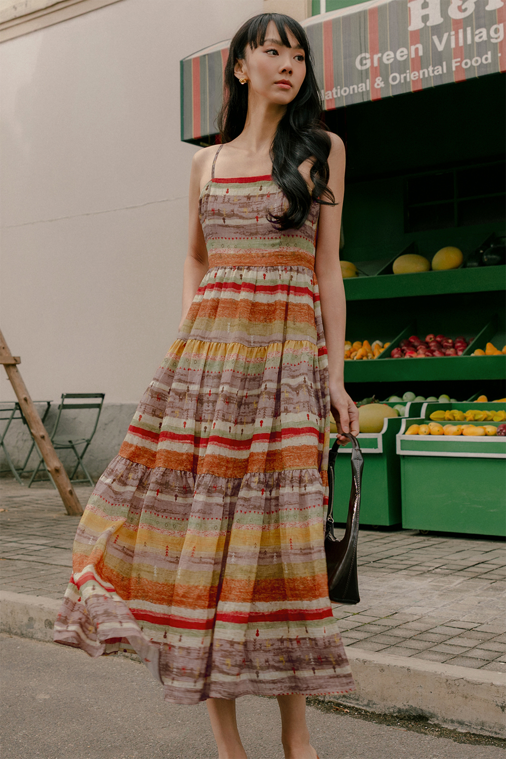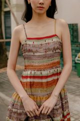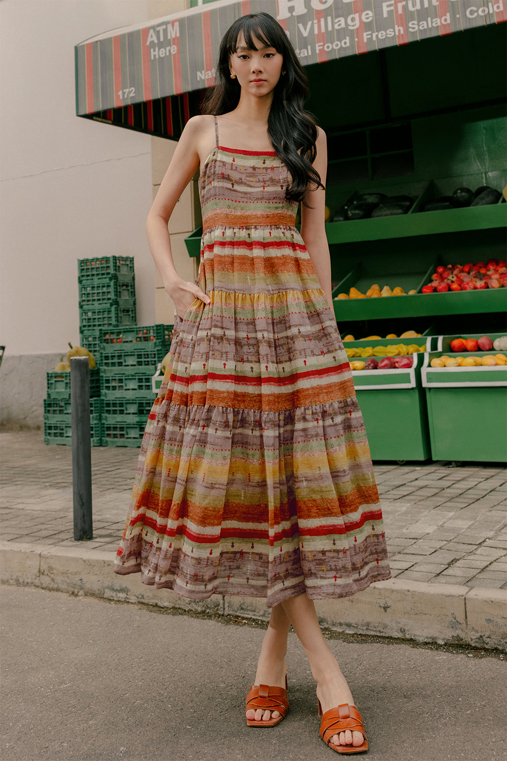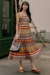 Adjustable shoulder straps. Full circle tiered skirting.