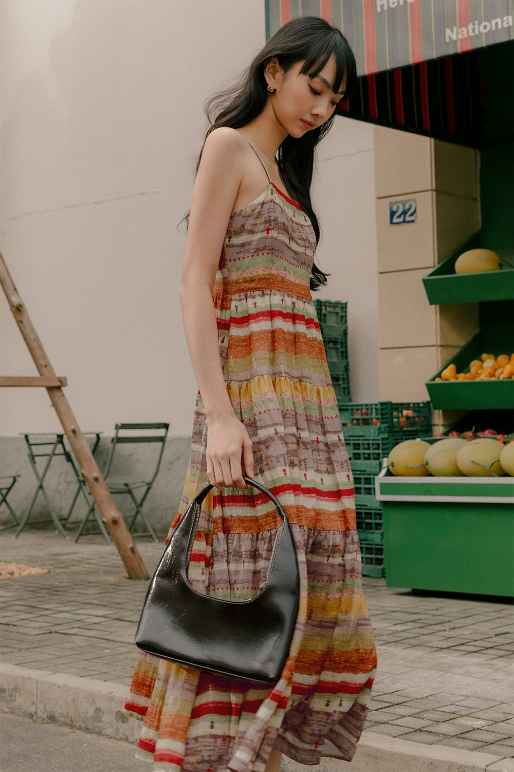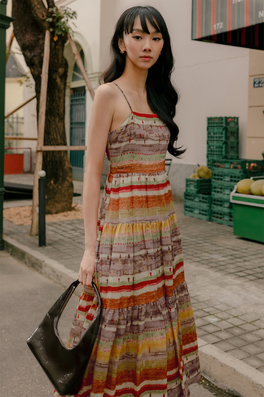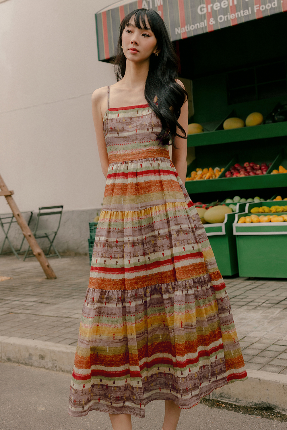 Adjustable shoulder straps. Full circle tiered skirting.