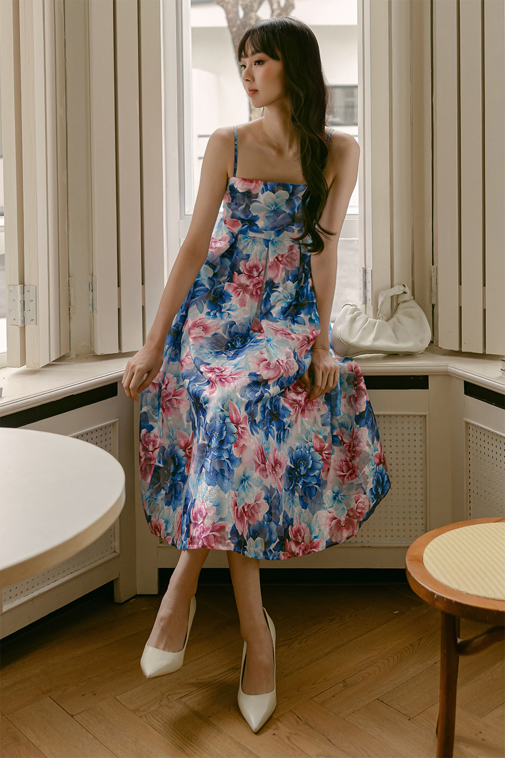 Box pleat full circle skirting with functional side pockets.
