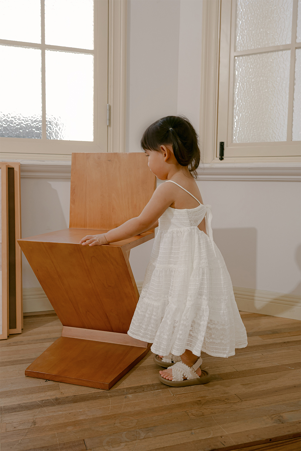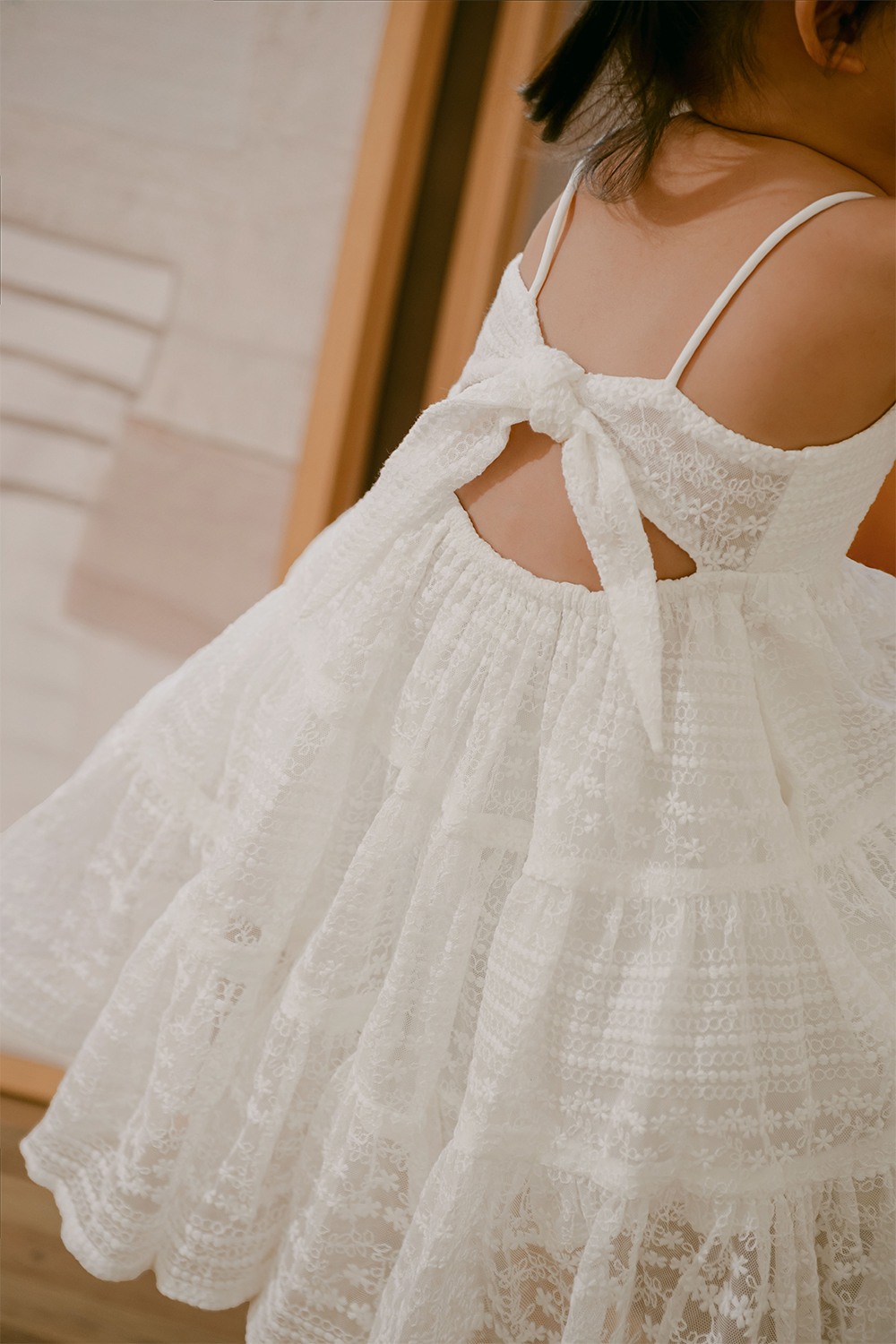Functional tie back details with elastic waistband at back.