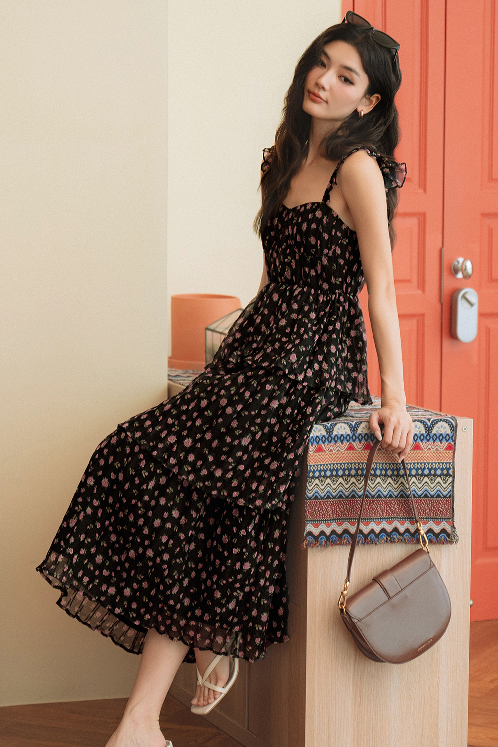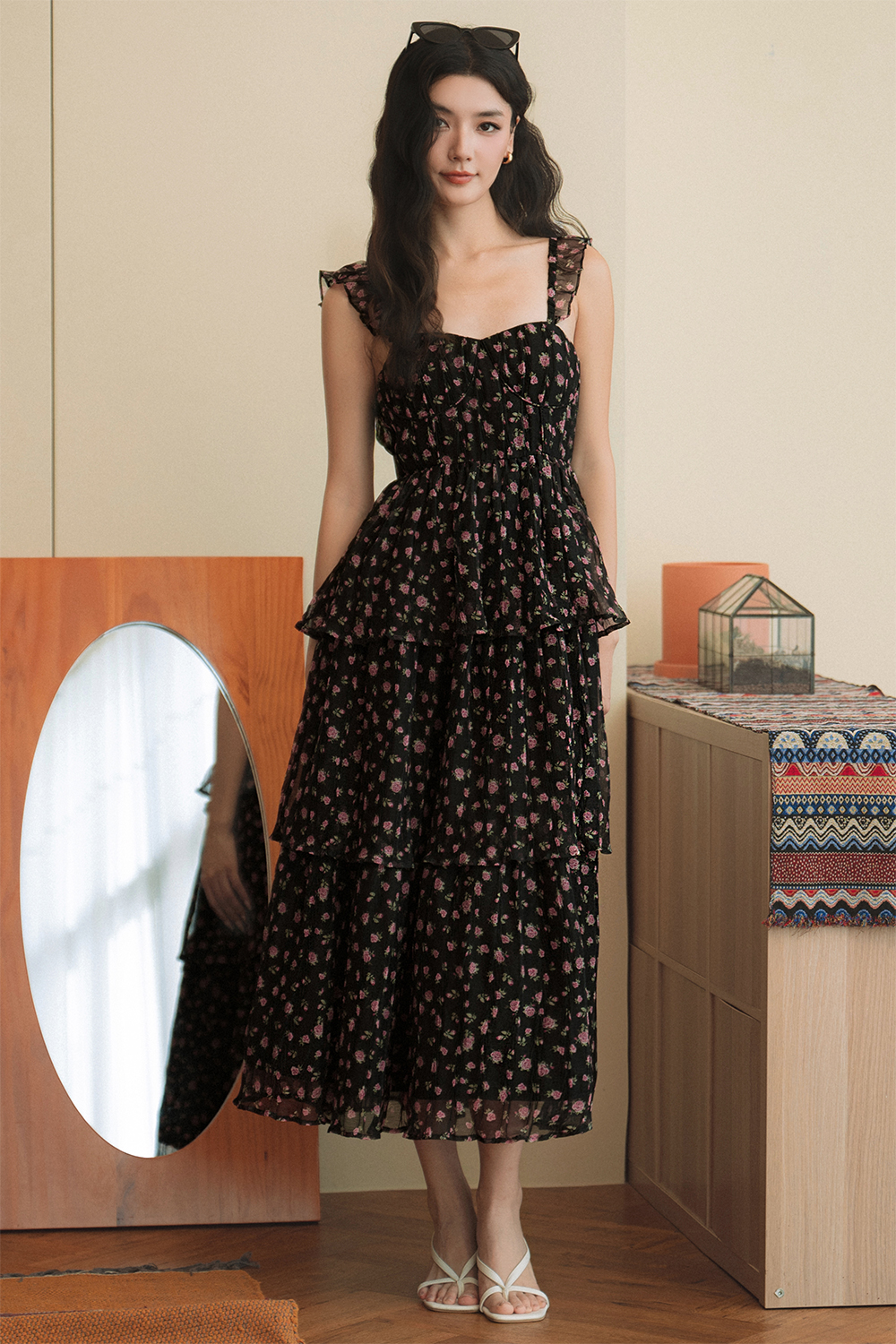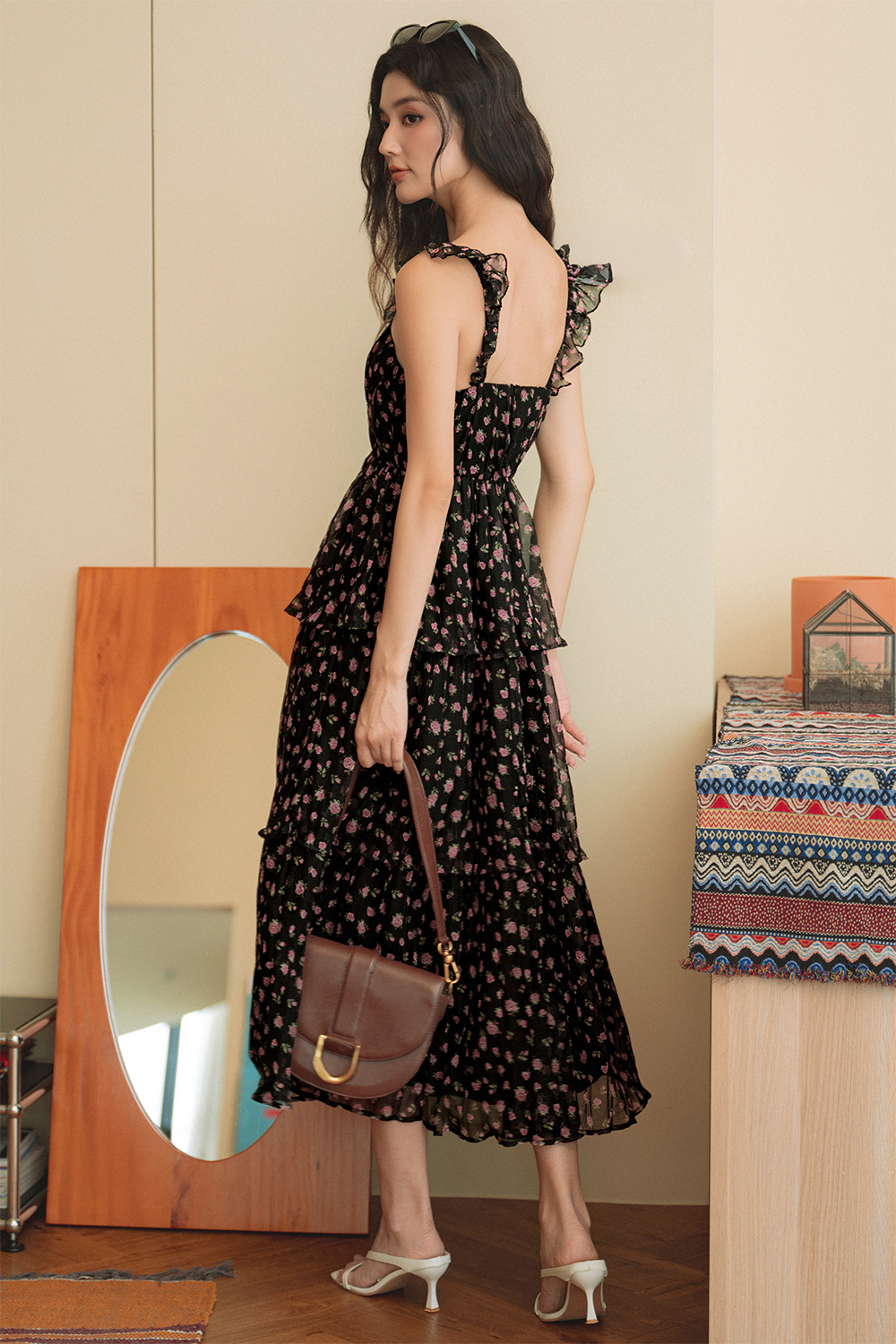 Elastic flutter ruffled details at shoulder straps. Tiered skirting.