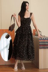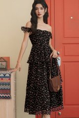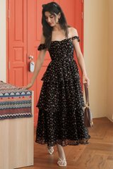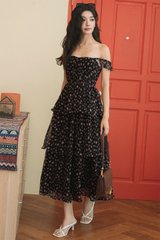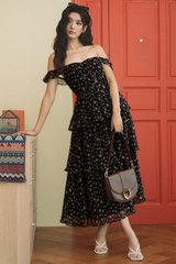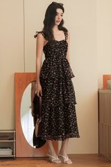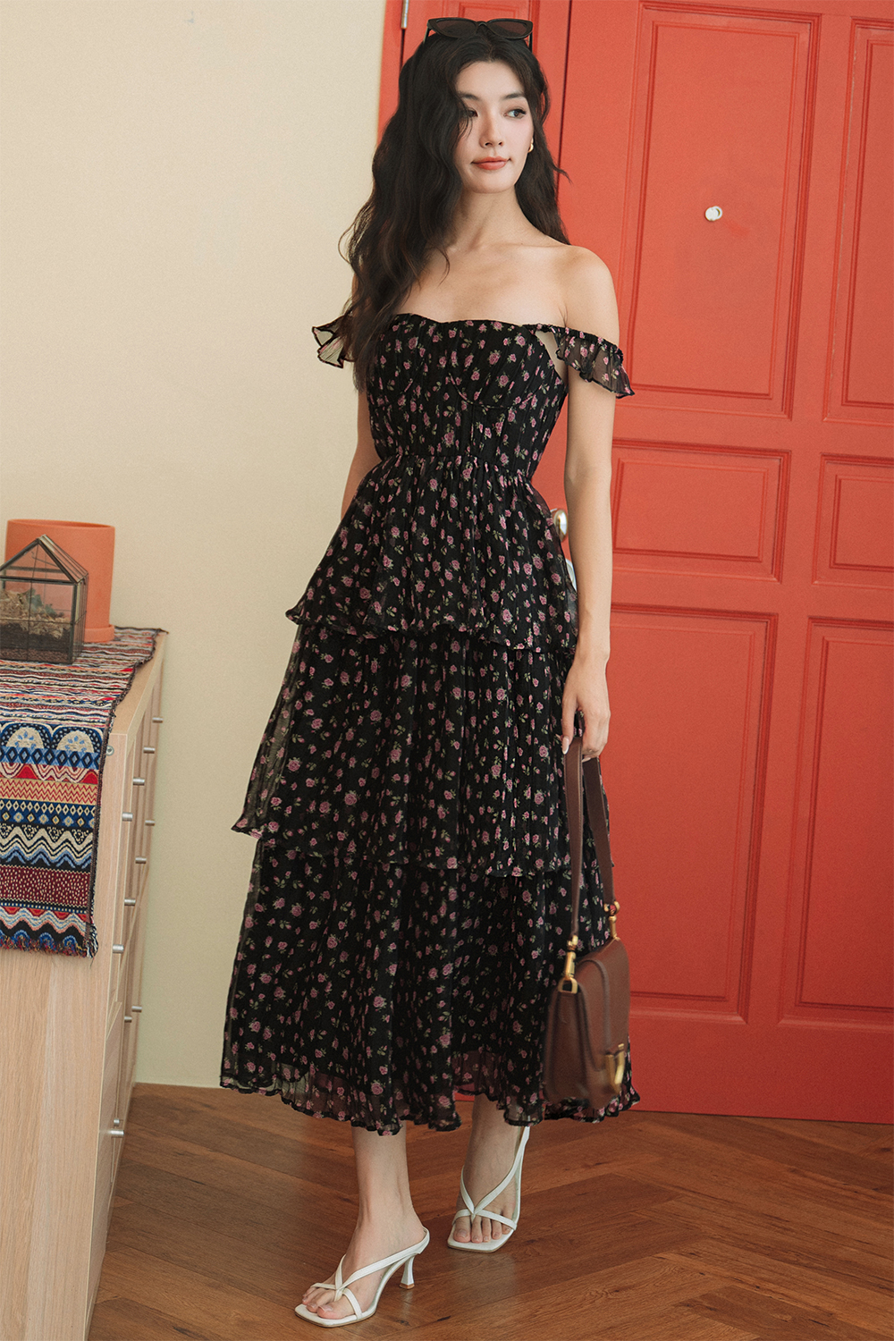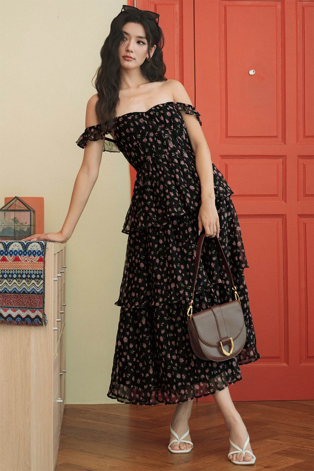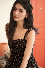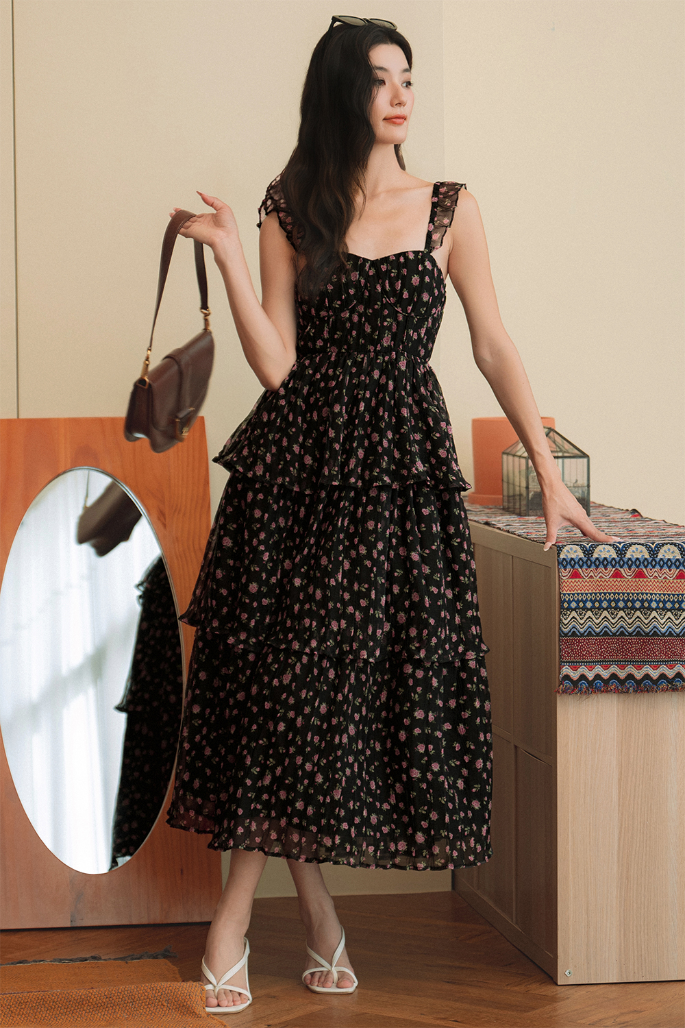 Elastic flutter ruffled details at shoulder straps. Tiered skirting.