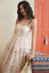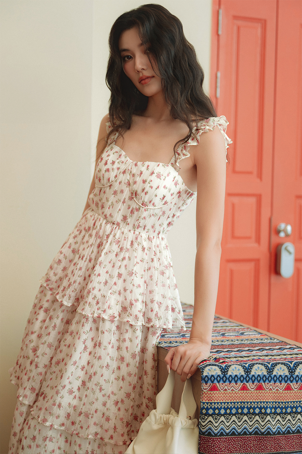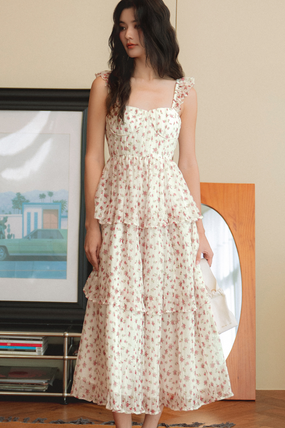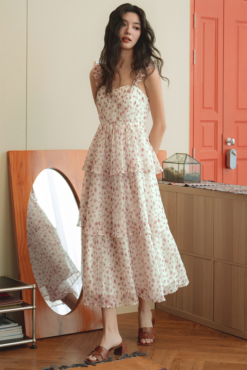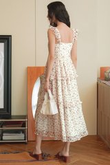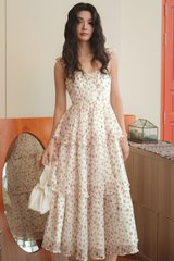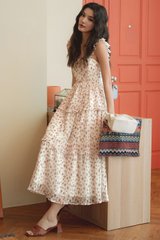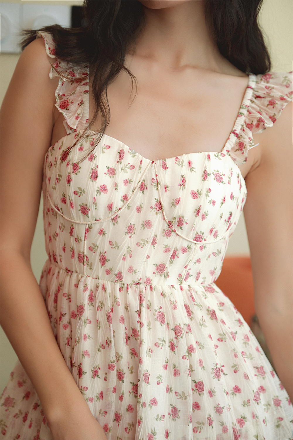 Elastic flutter ruffled details at shoulder straps. Tiered skirting.