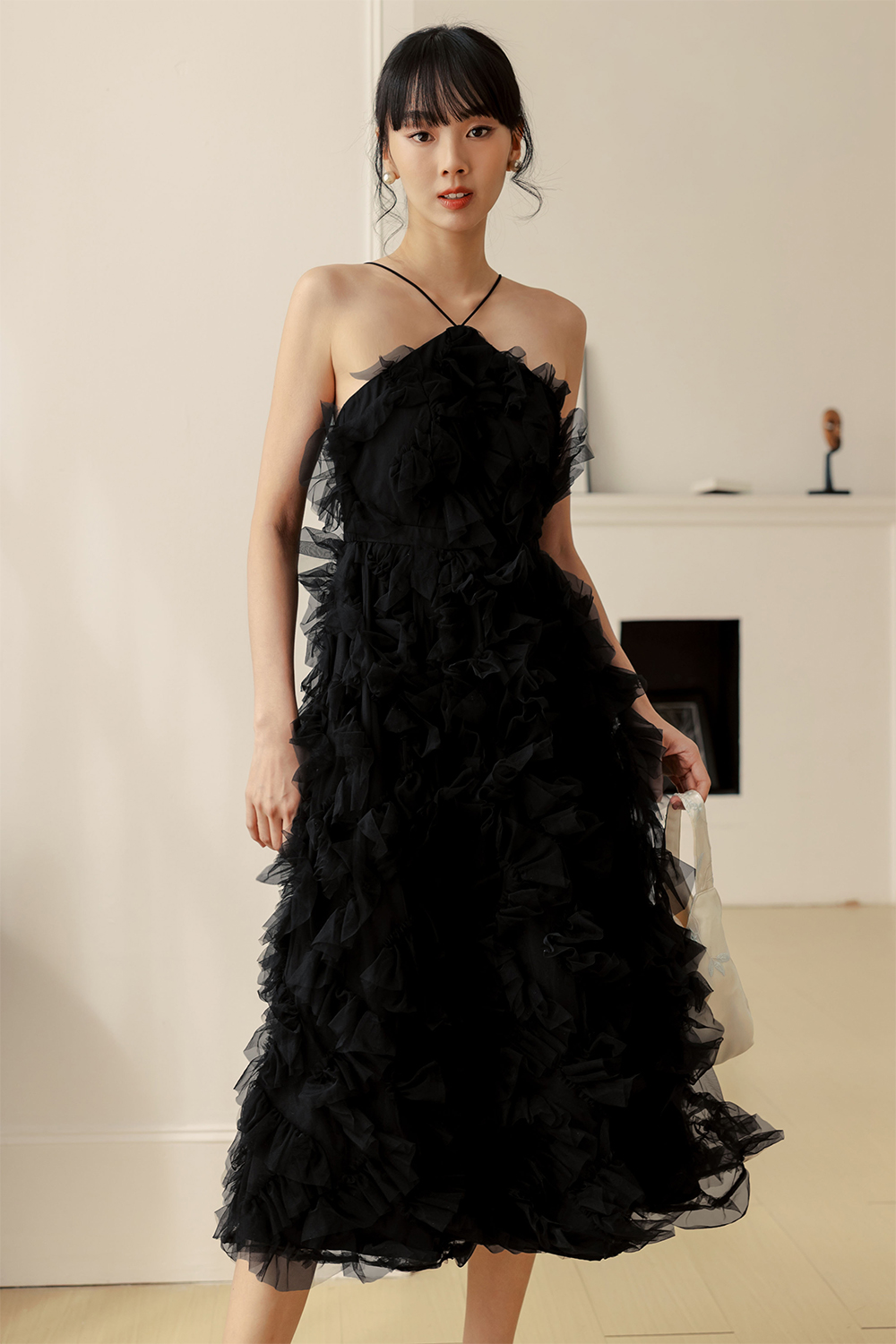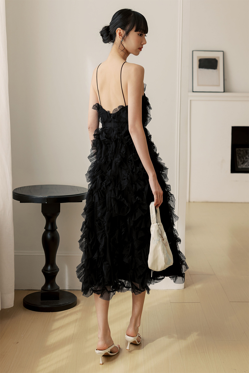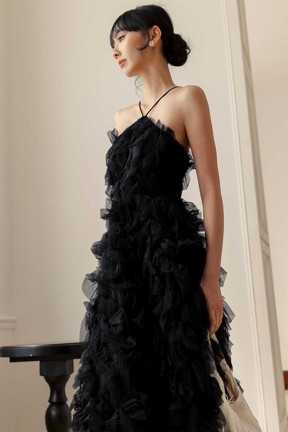 Features cascading 3D mesh tulle ruffling details on fabric.