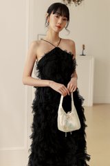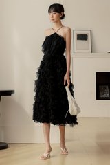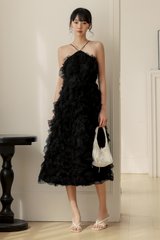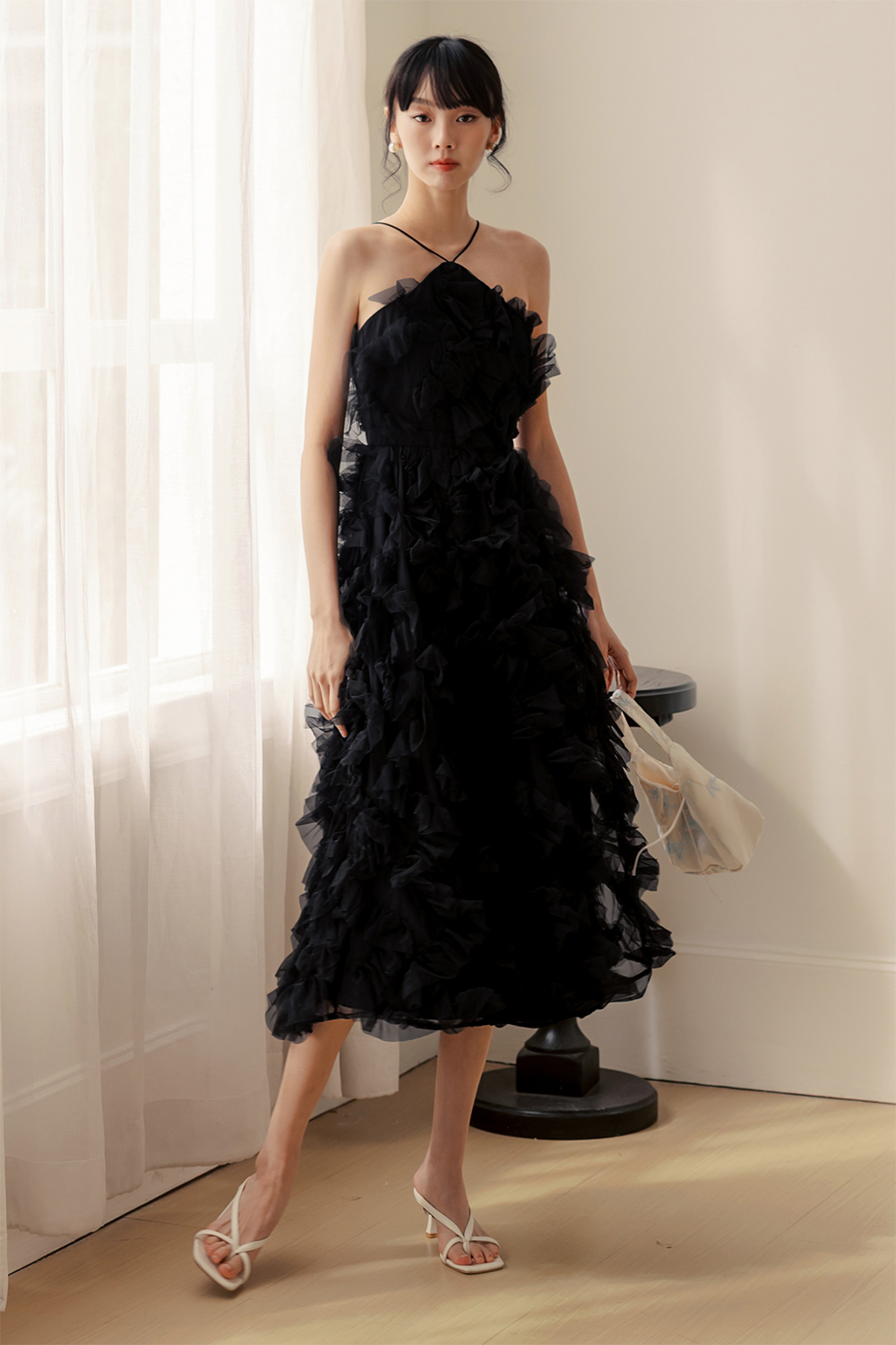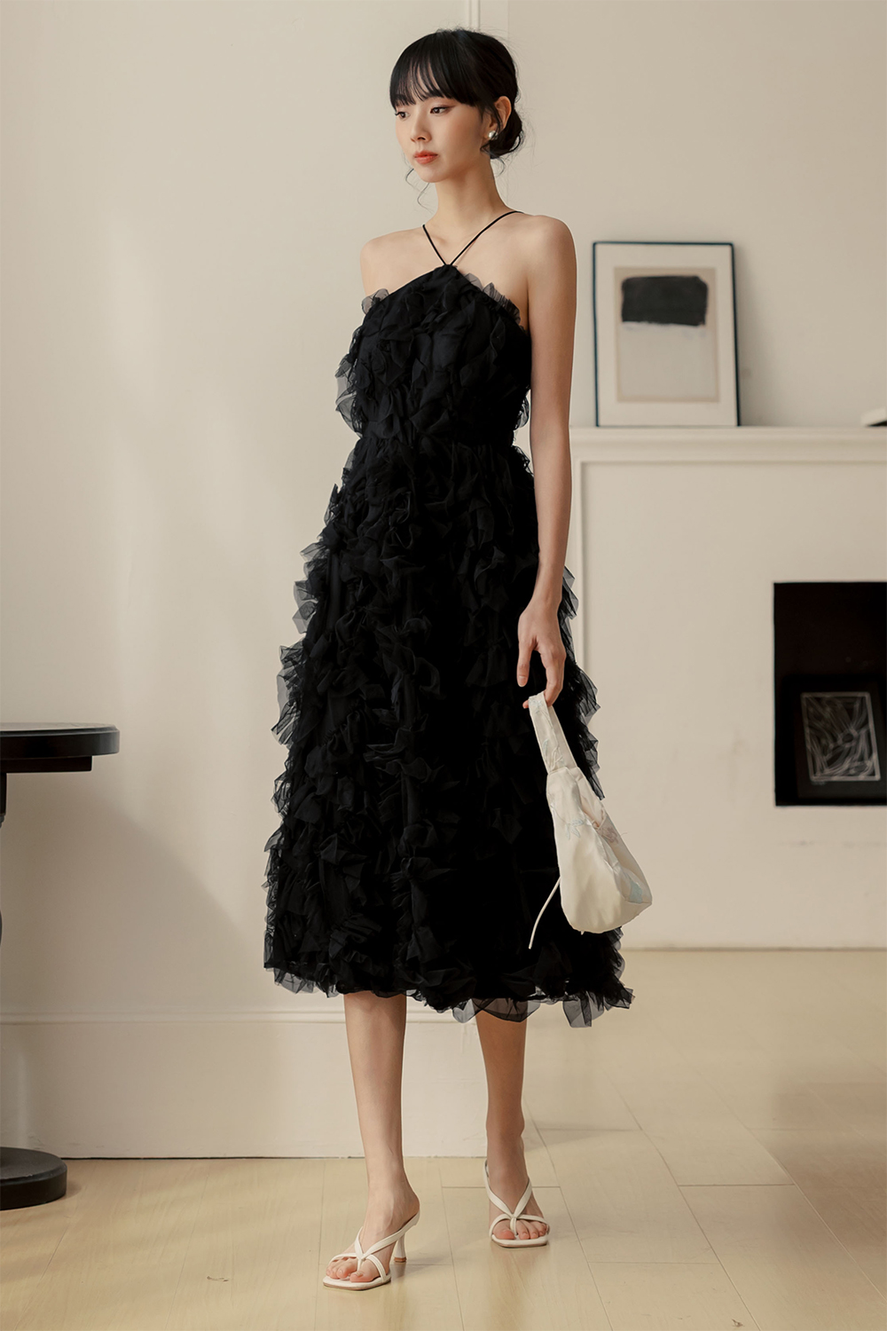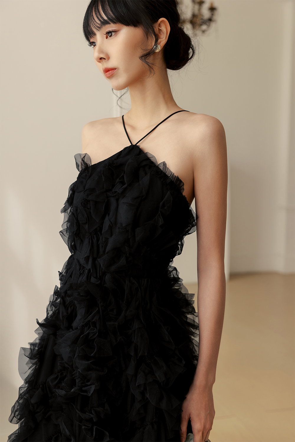 Features cascading 3D mesh tulle ruffling details on fabric.