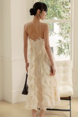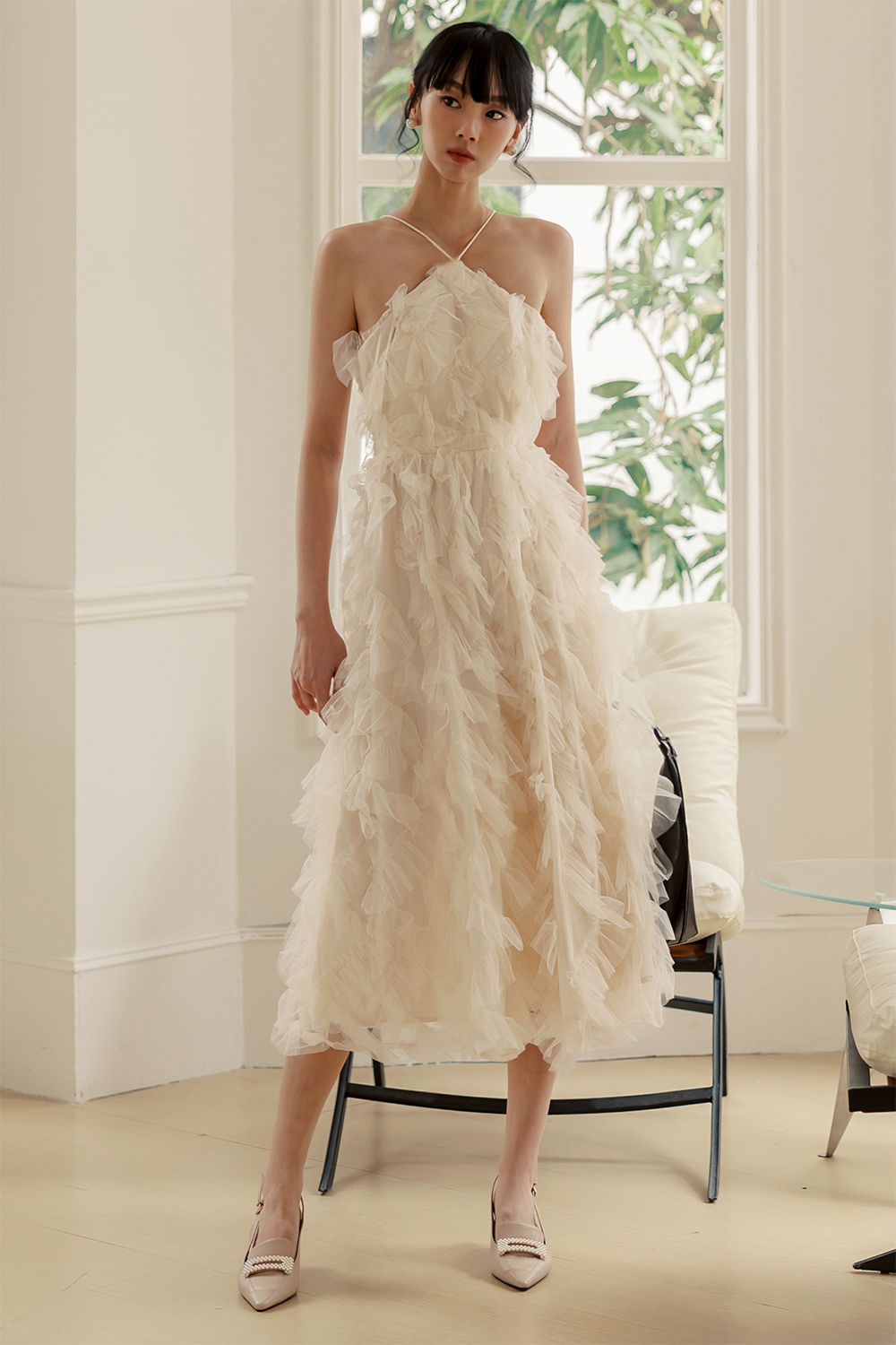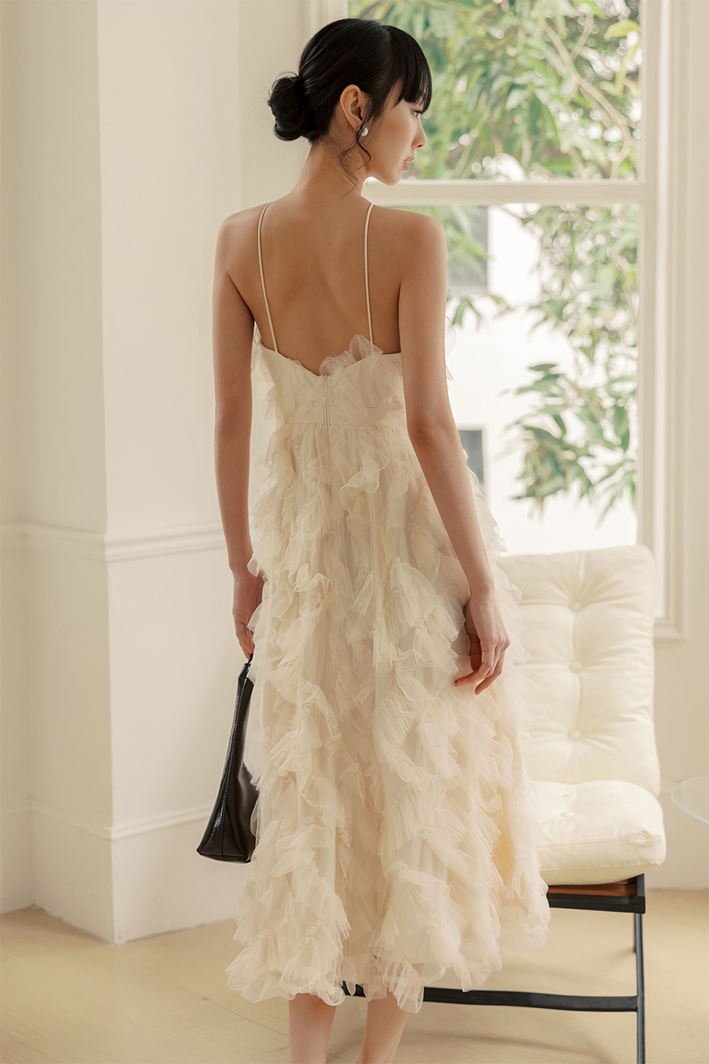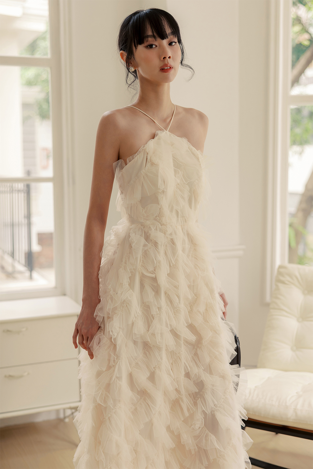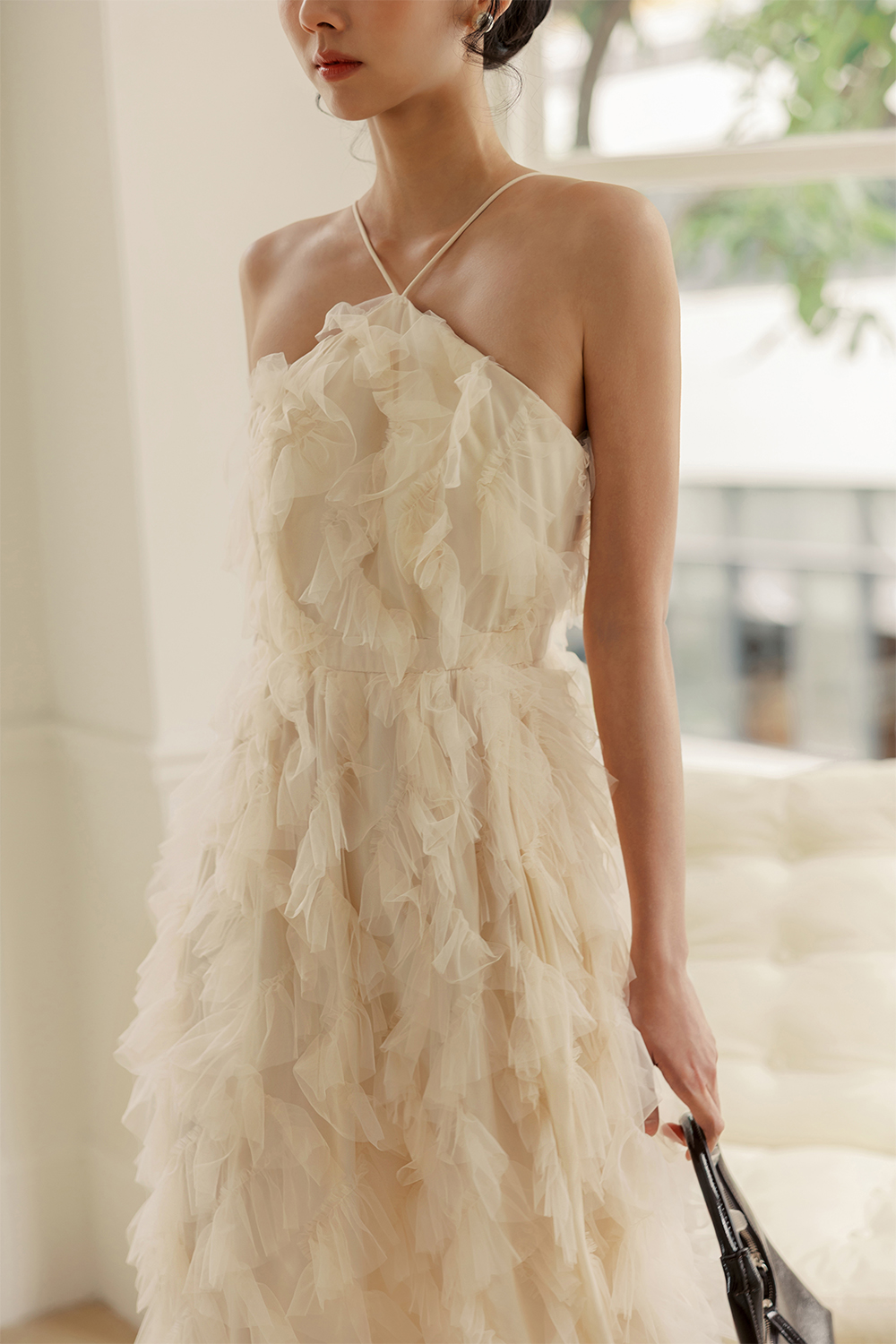 Features cascading 3D mesh tulle ruffling details on fabric.