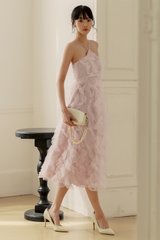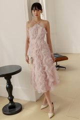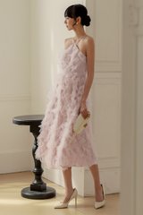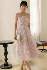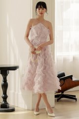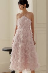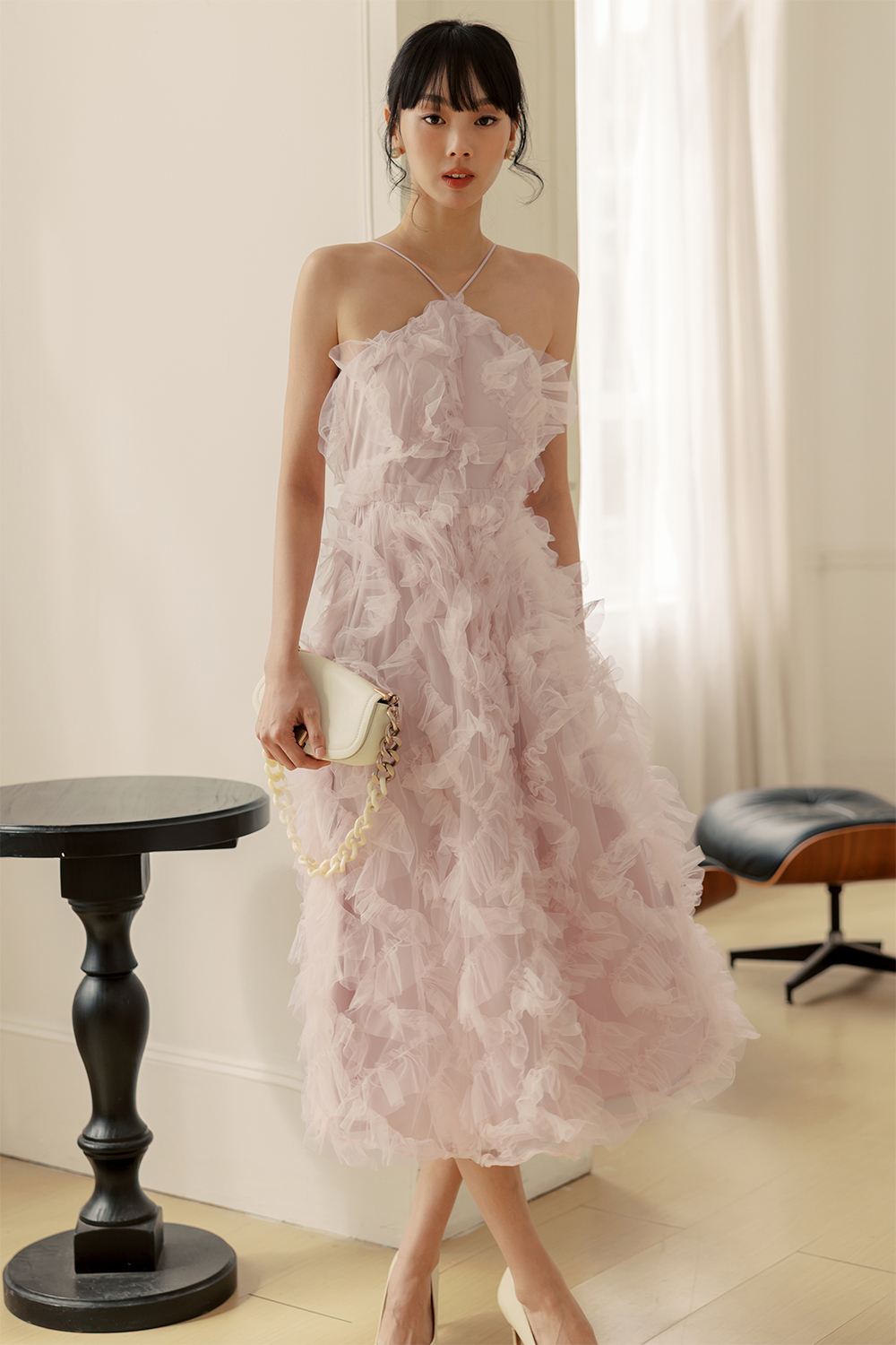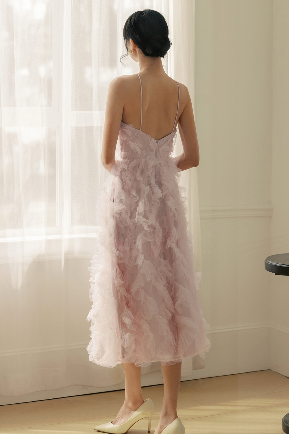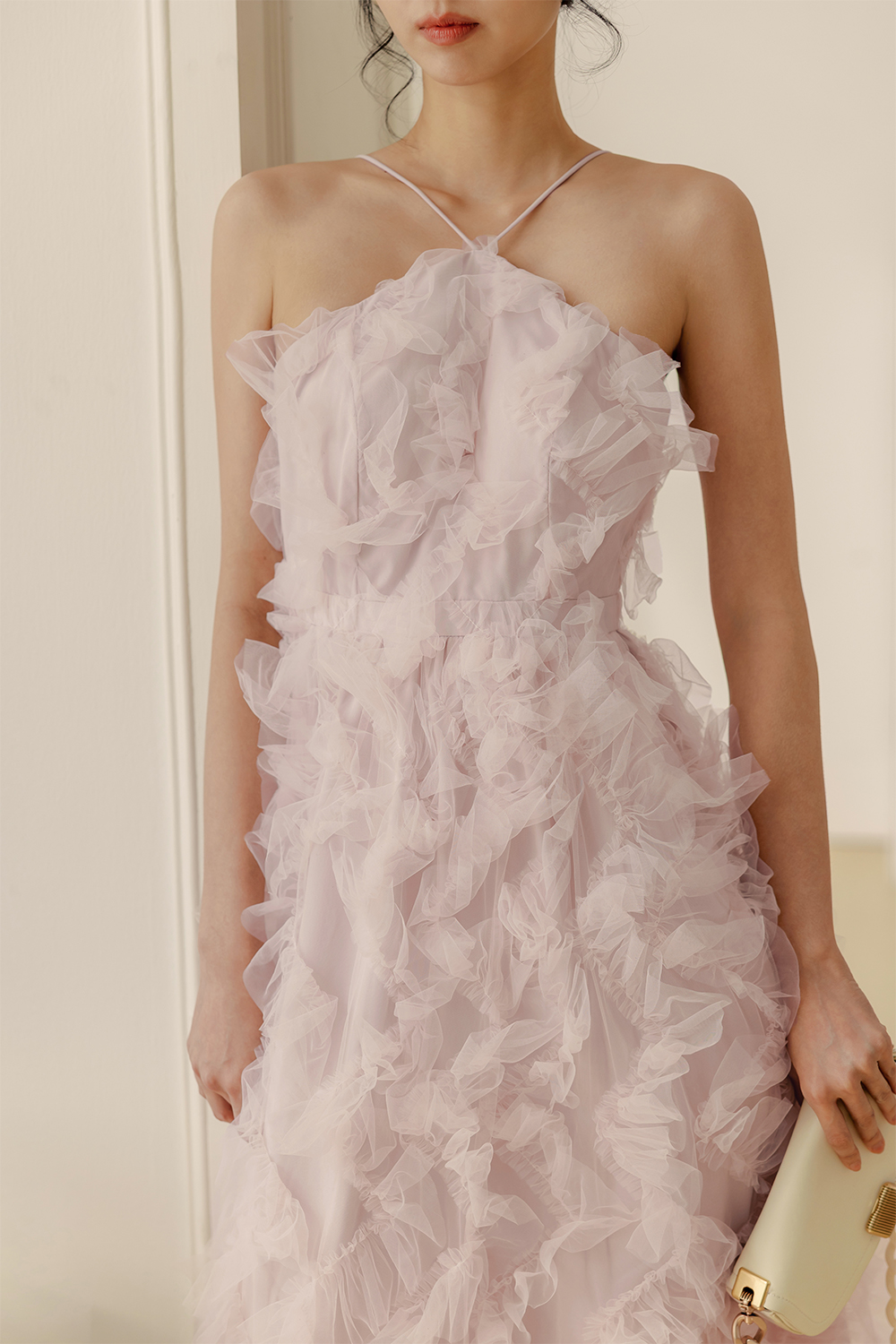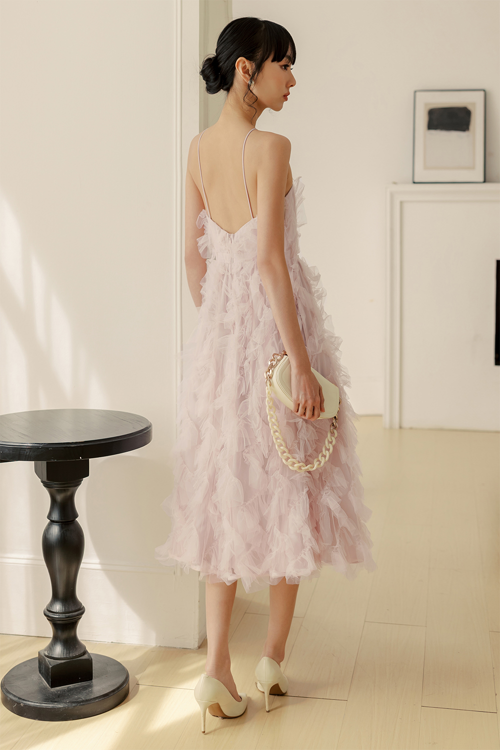 Features cascading 3D mesh tulle ruffling details on fabric.