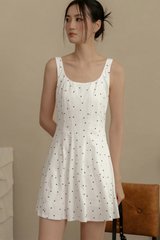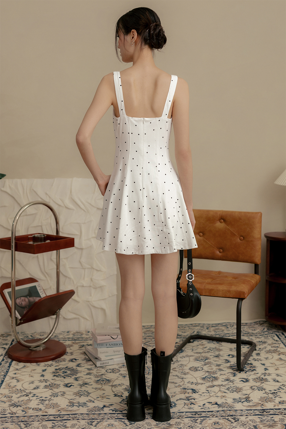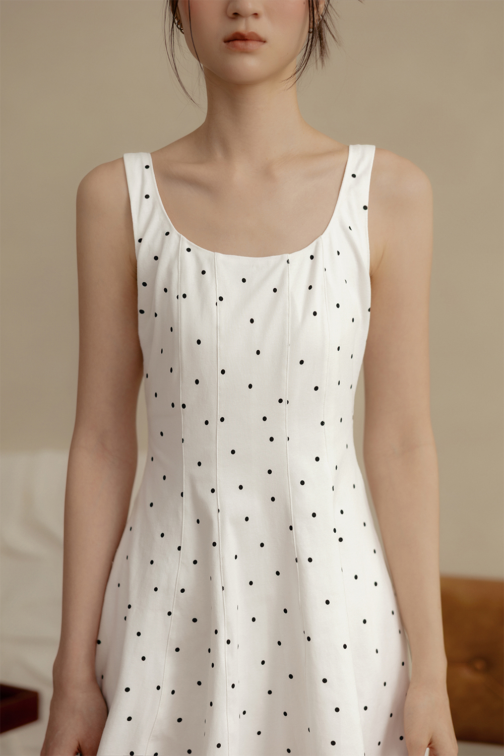 Wide scooped neckline in front with paneling details down main bodice to skirting.