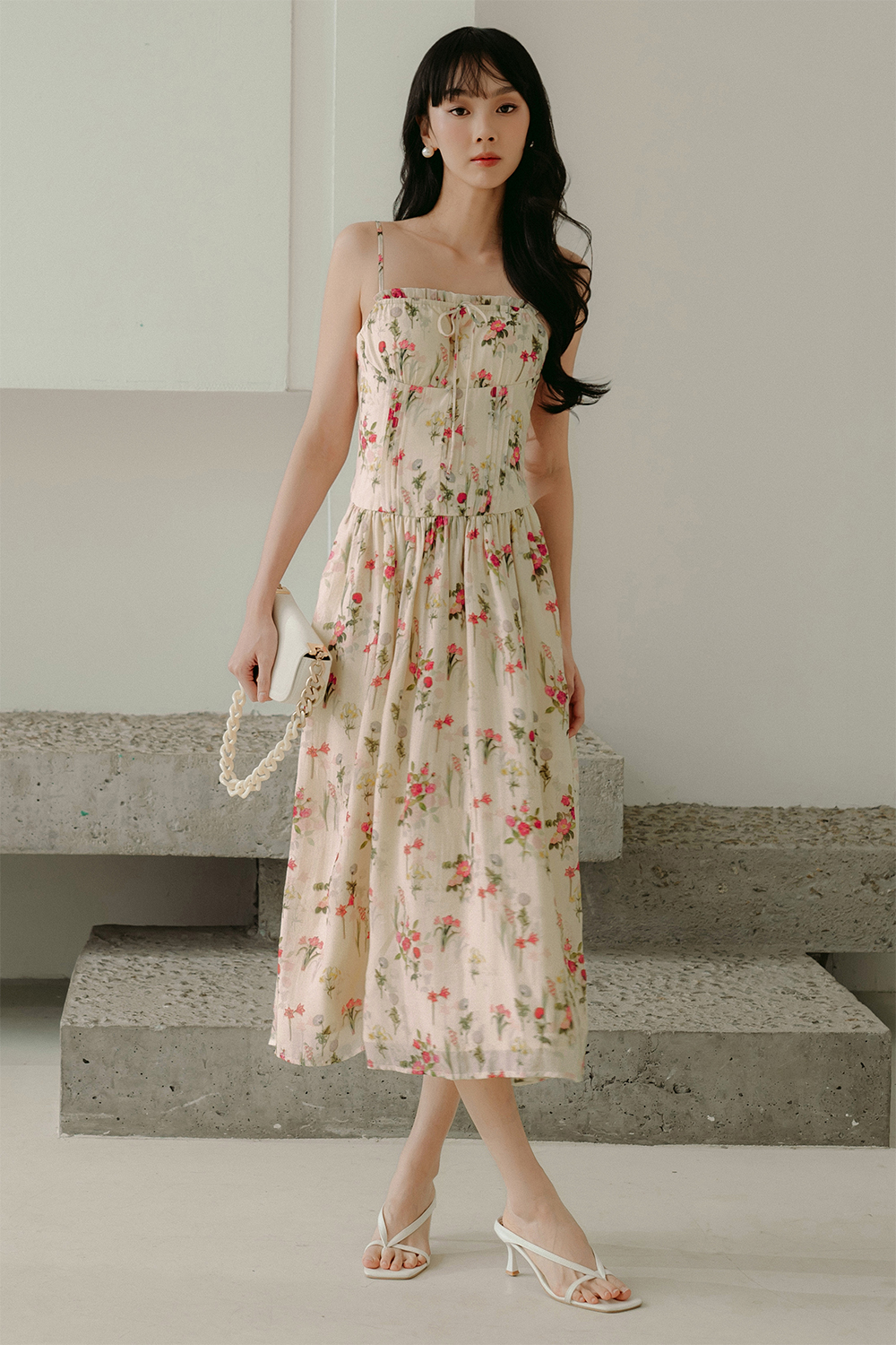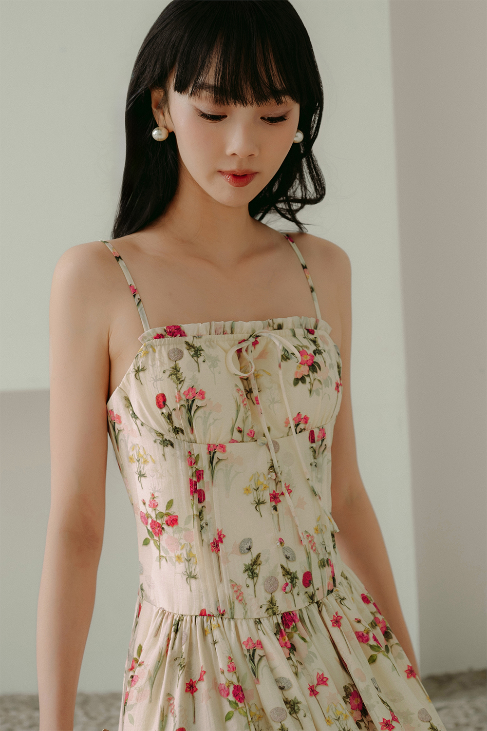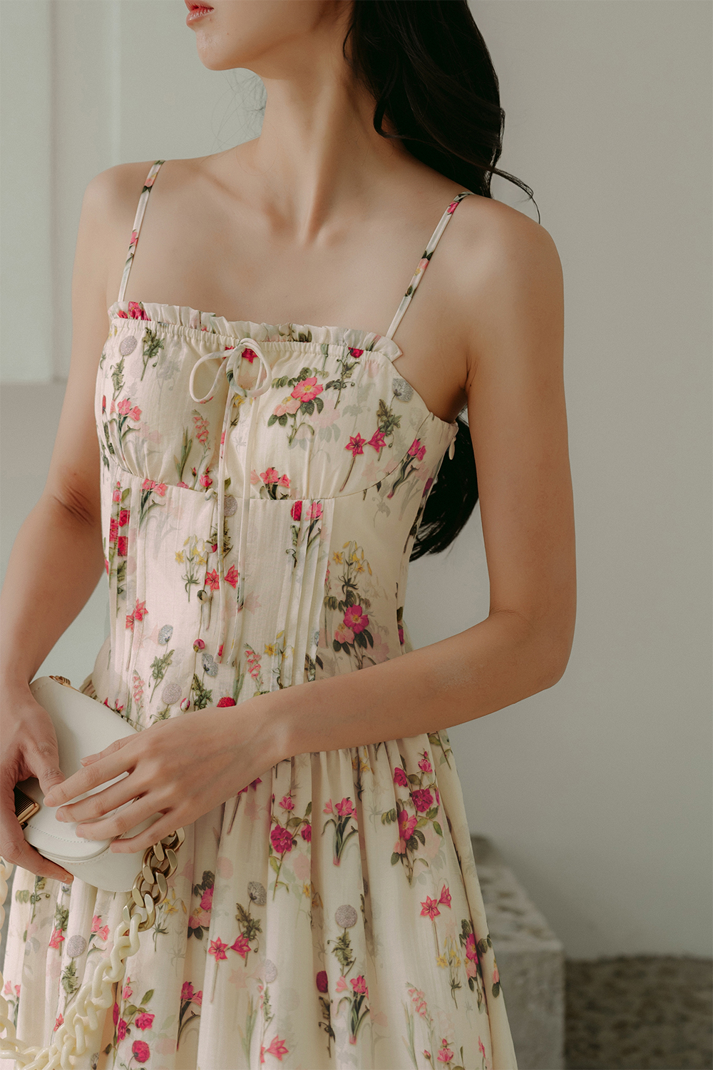 Elastic at front chest with ruffle details with functional and non-adjustable tie details.