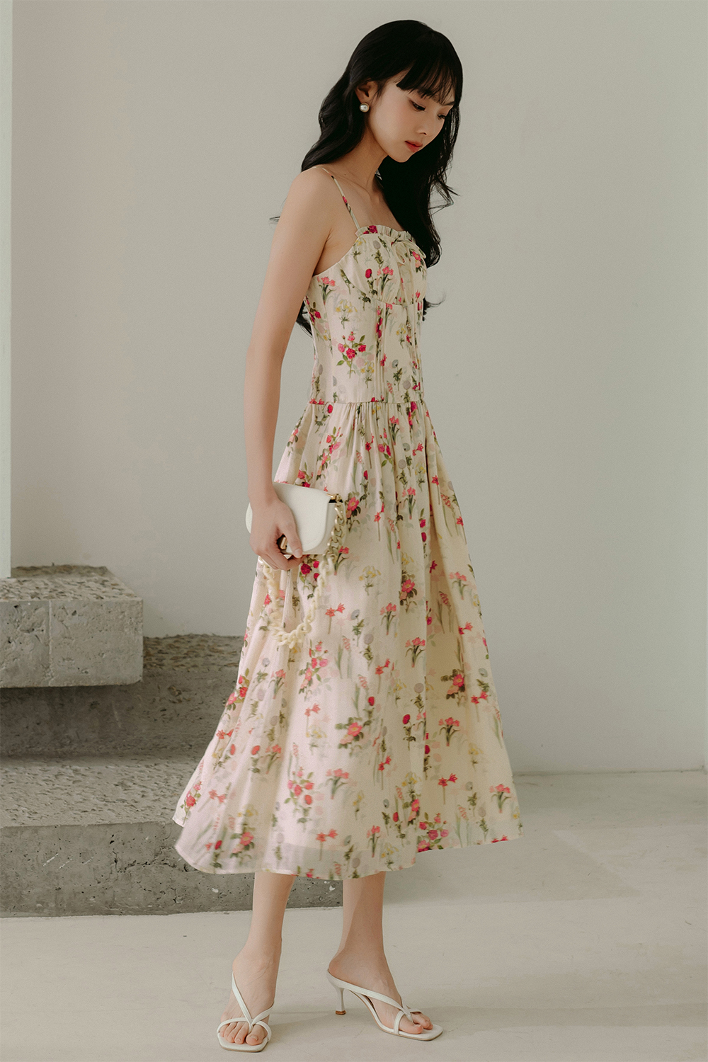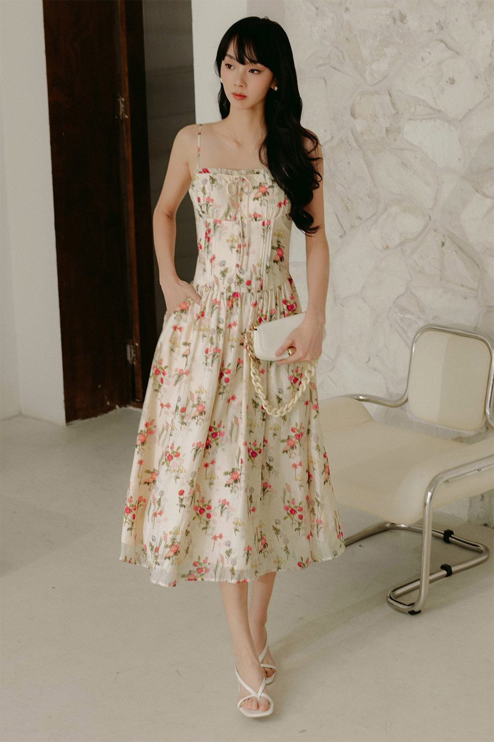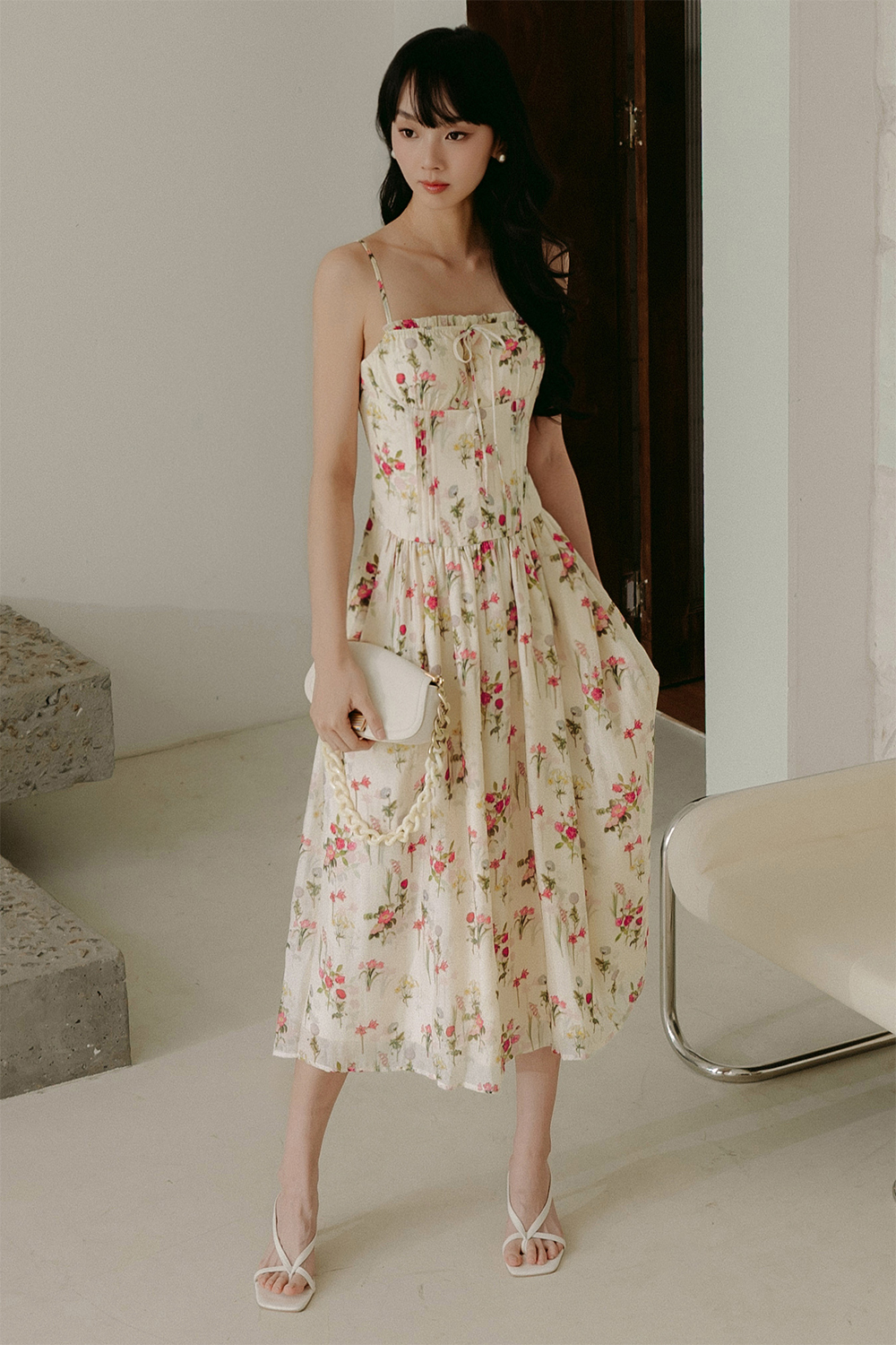 Elastic at front chest with ruffle details with functional and non-adjustable tie details.