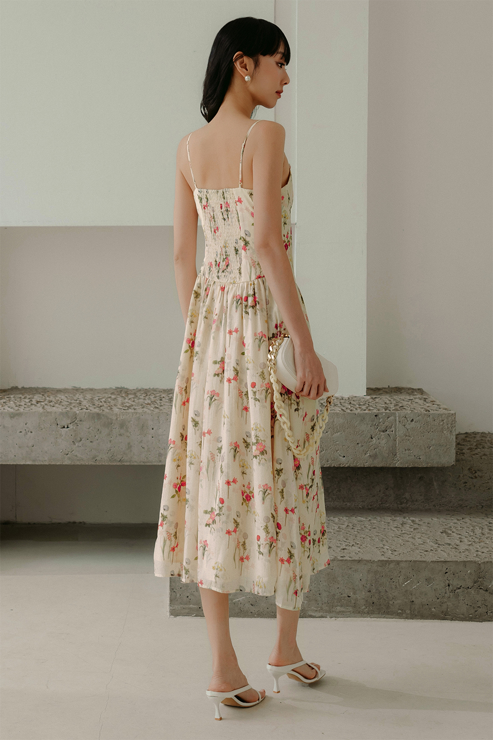 Elastic smocked at middle back. Adjustable shoulder straps.
