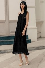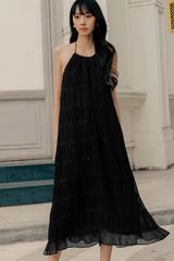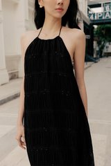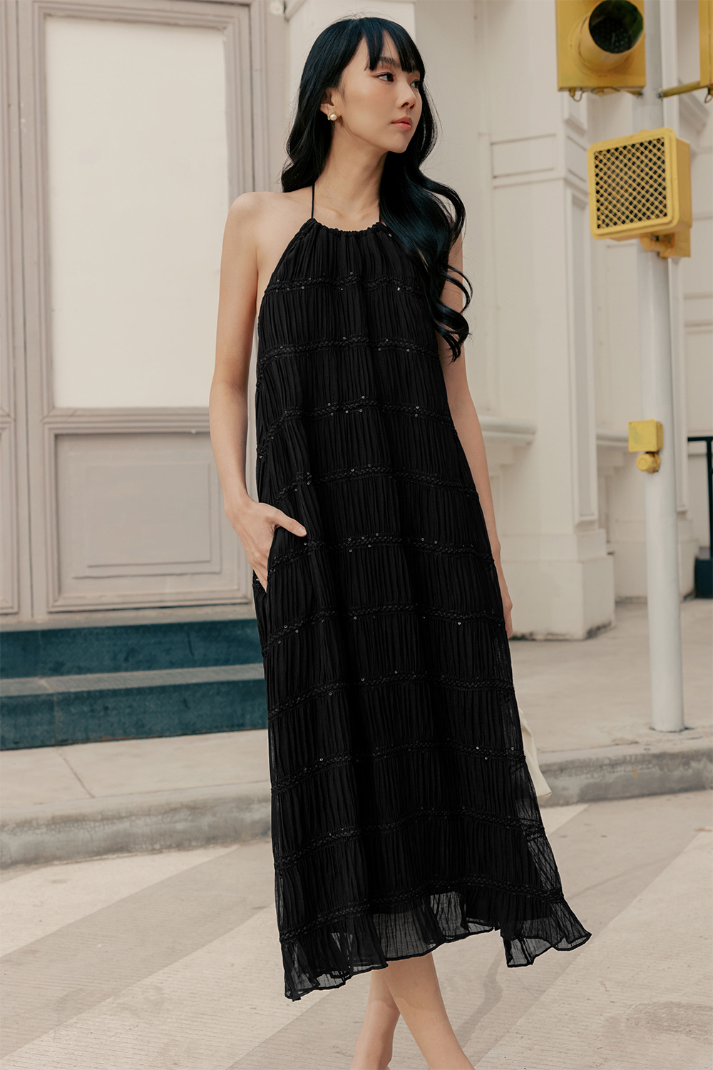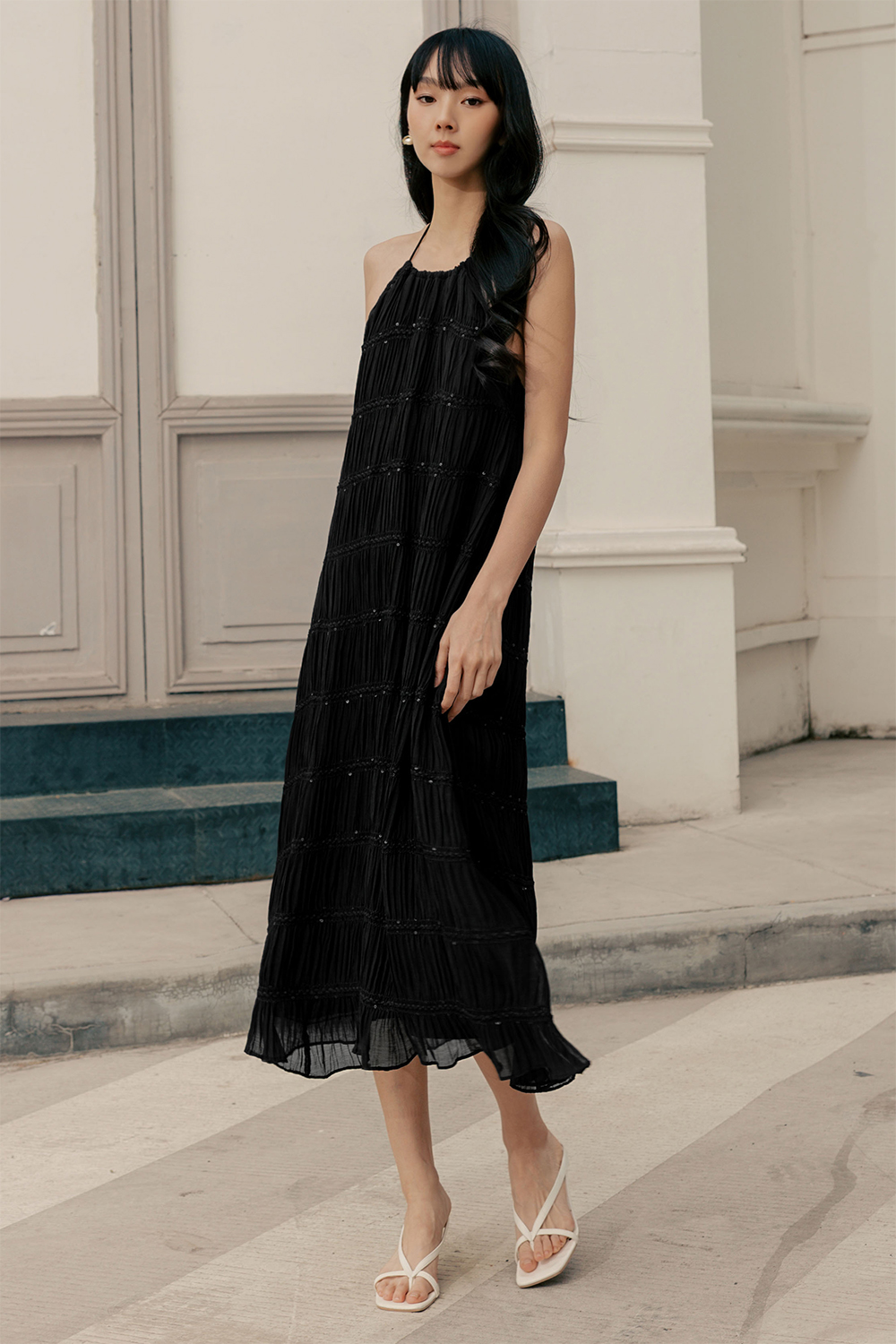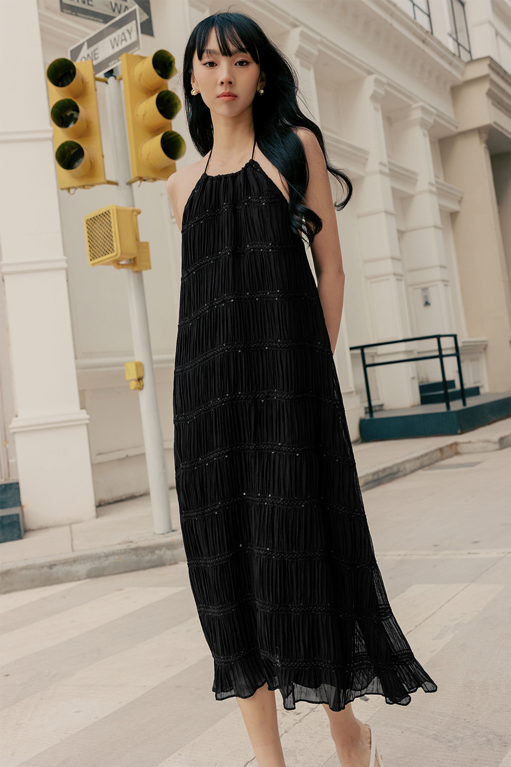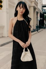 Features pleating crinkled texture and pom-pom lace trims tiers on fabric.