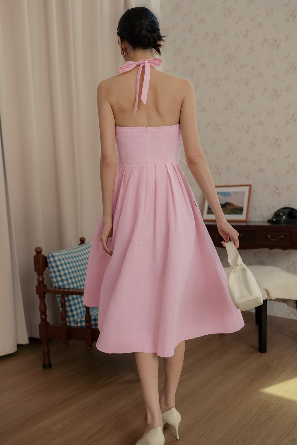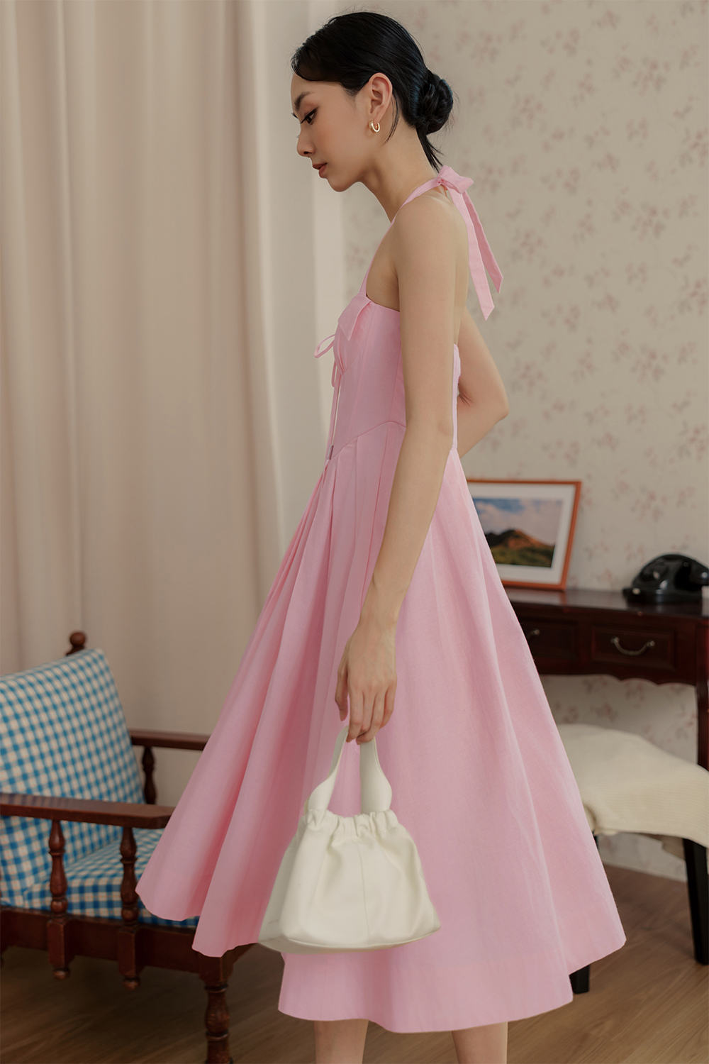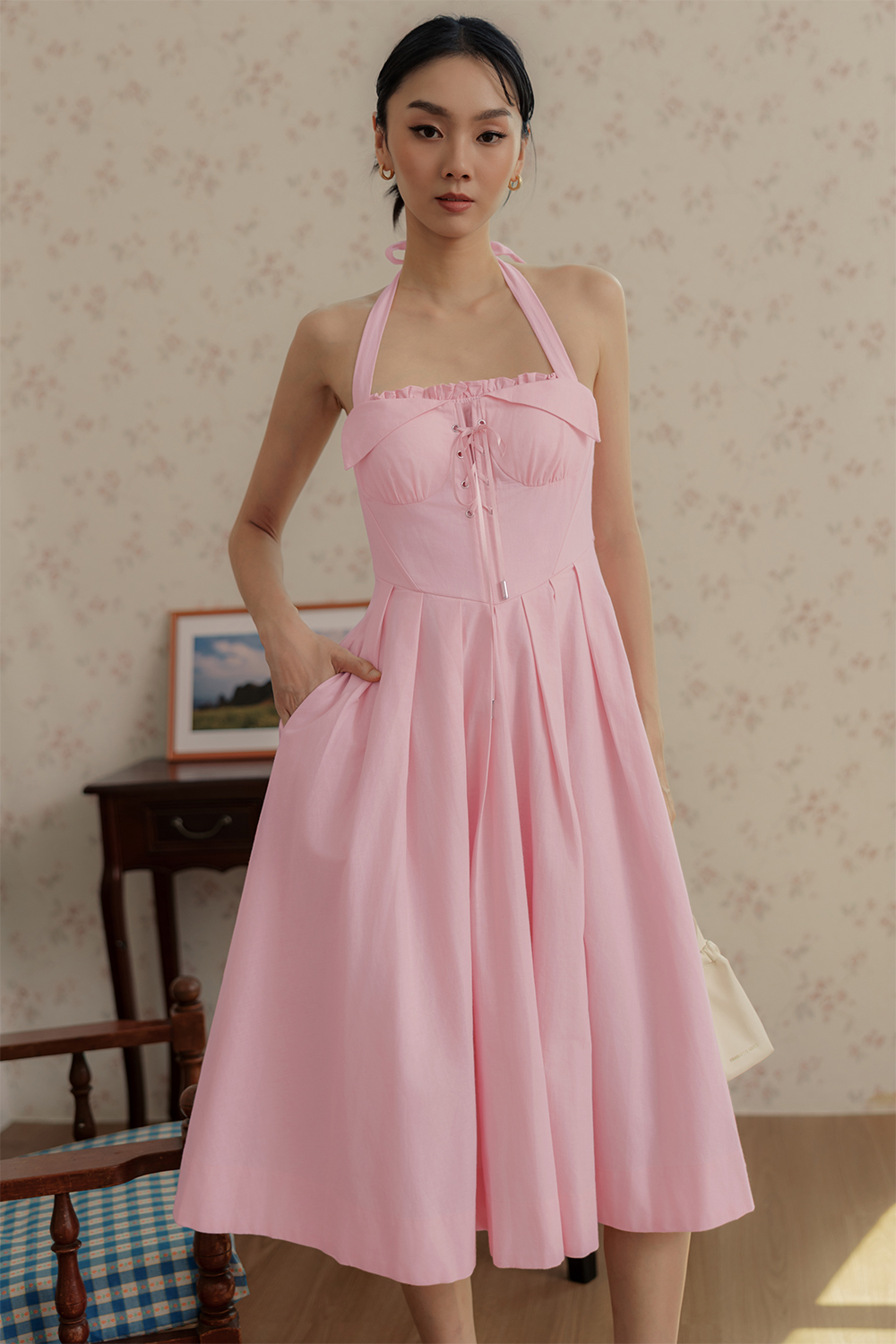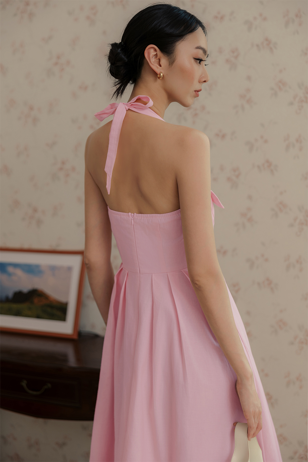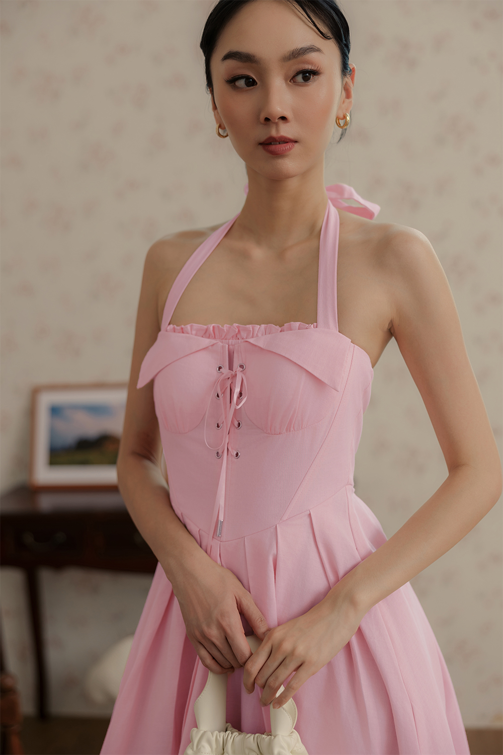 Functional halter tie details around neck. Non-detachable padding at chest.