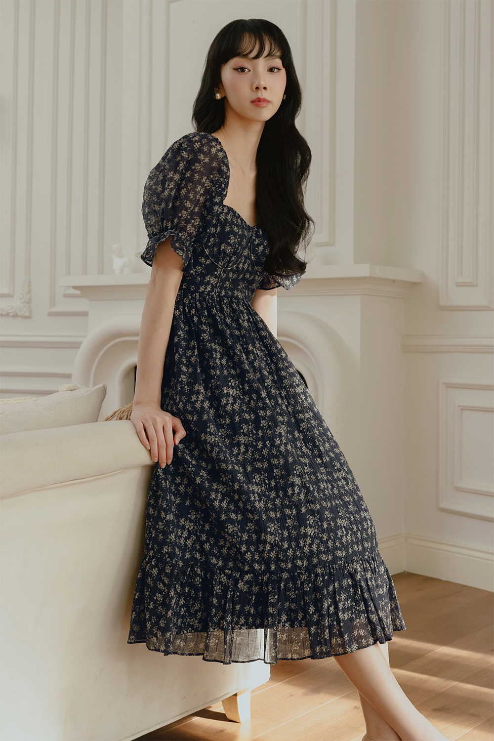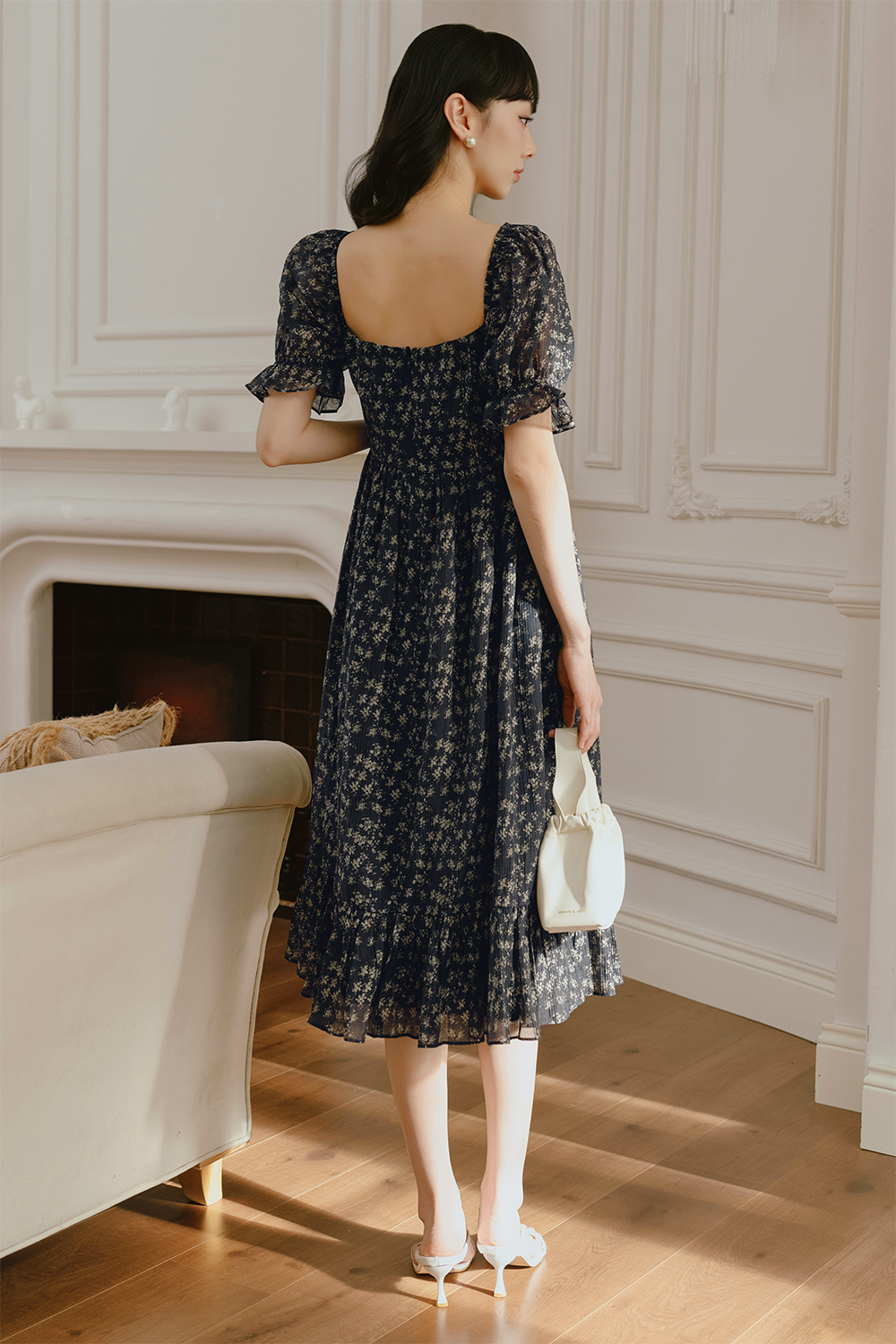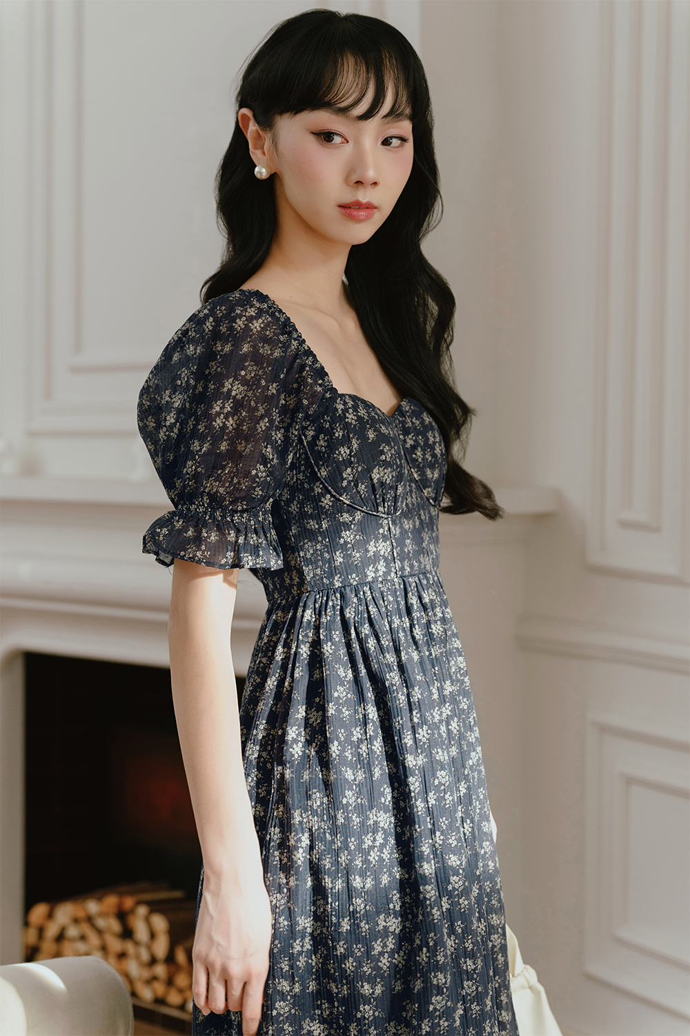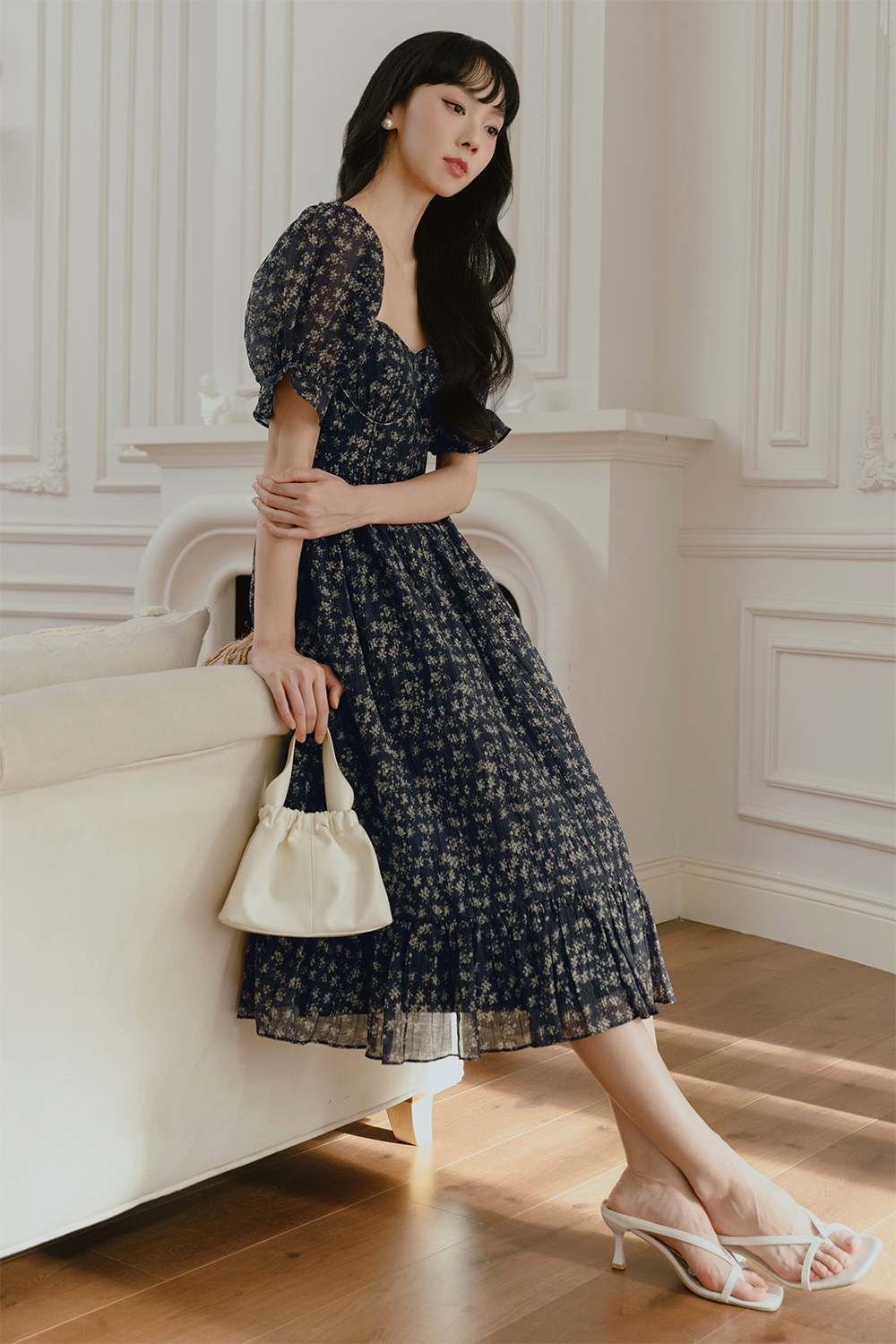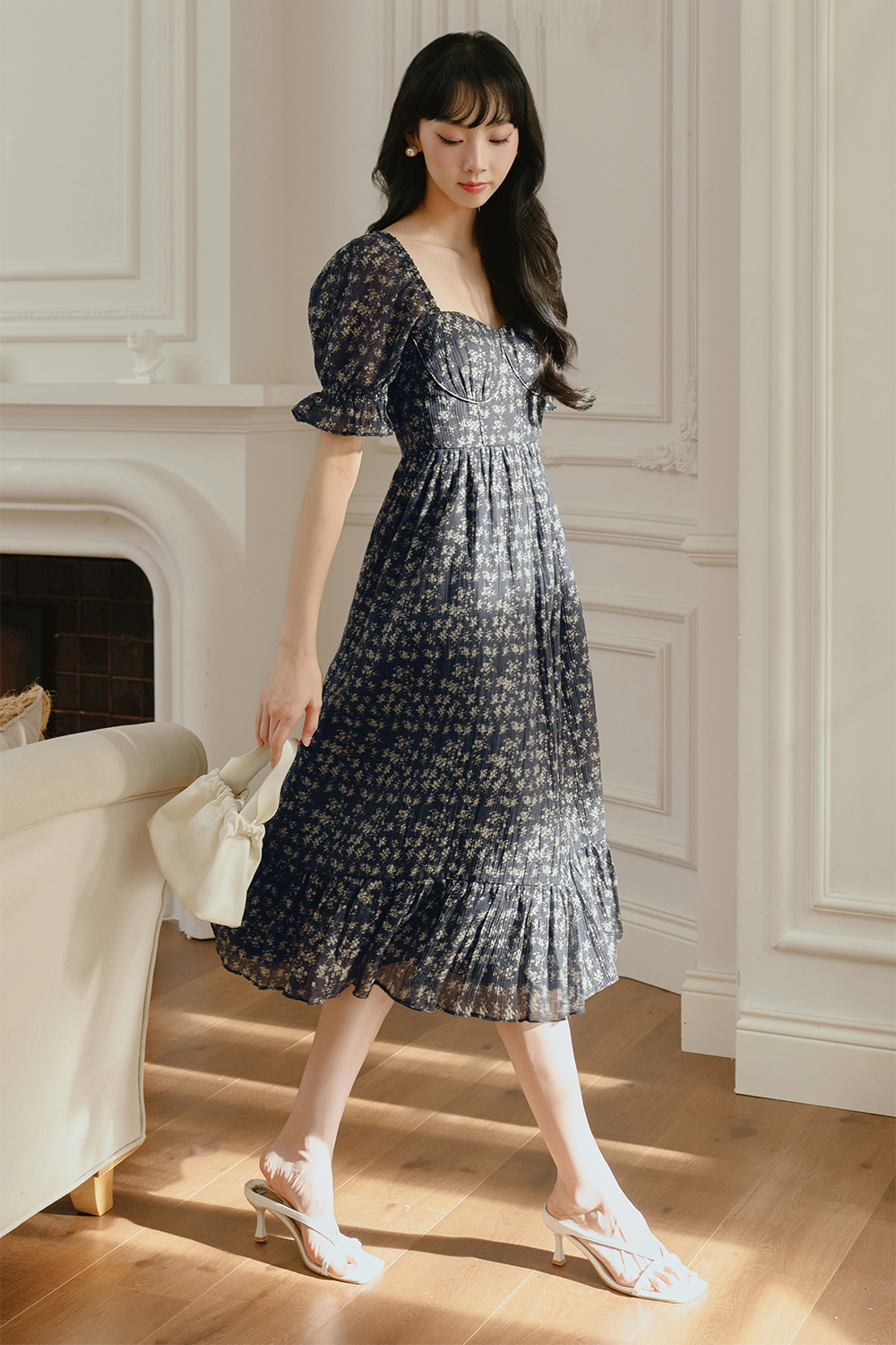 Features dainty floral abstracts printed on naturally crinkled pleated fabric.