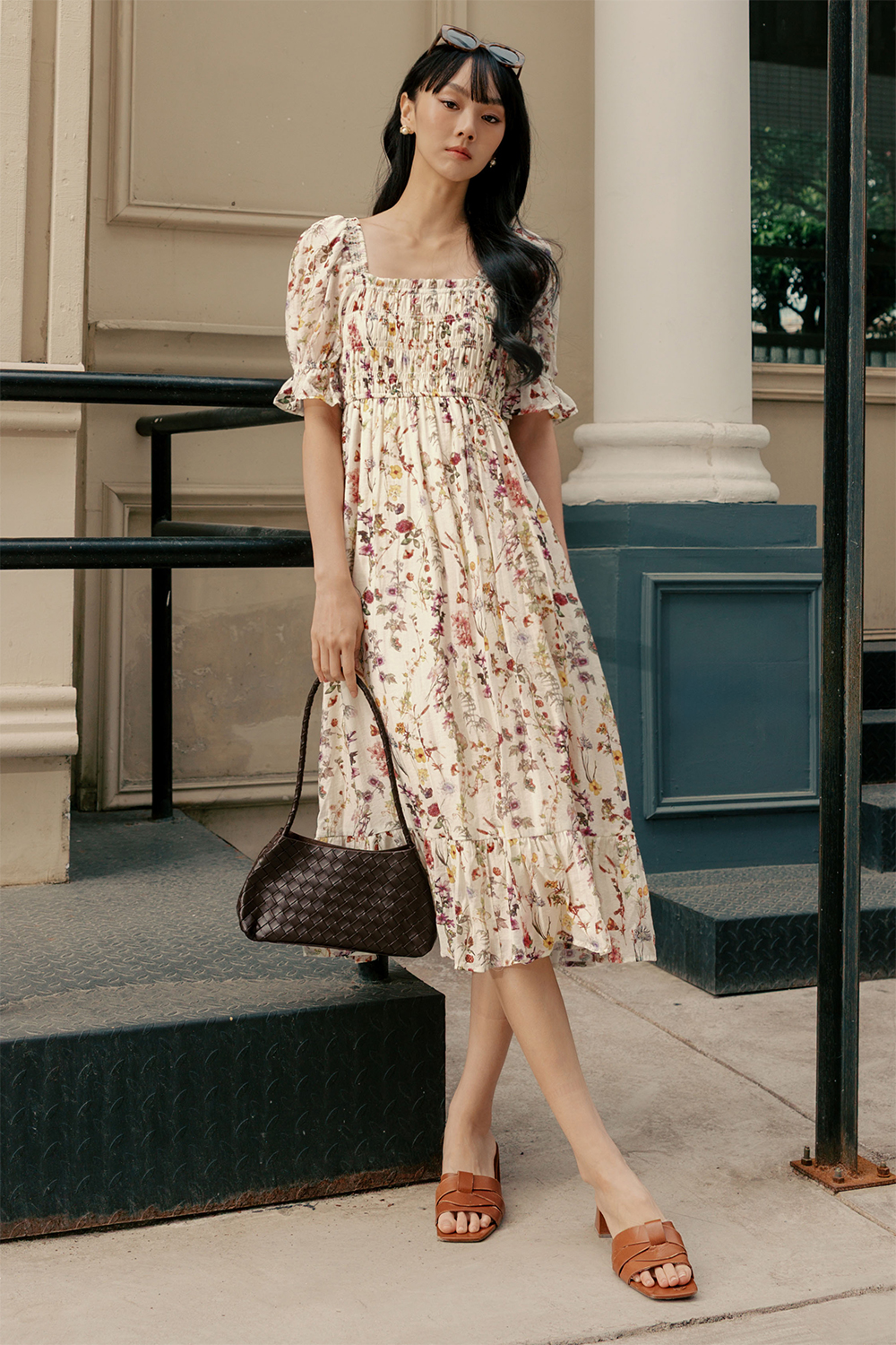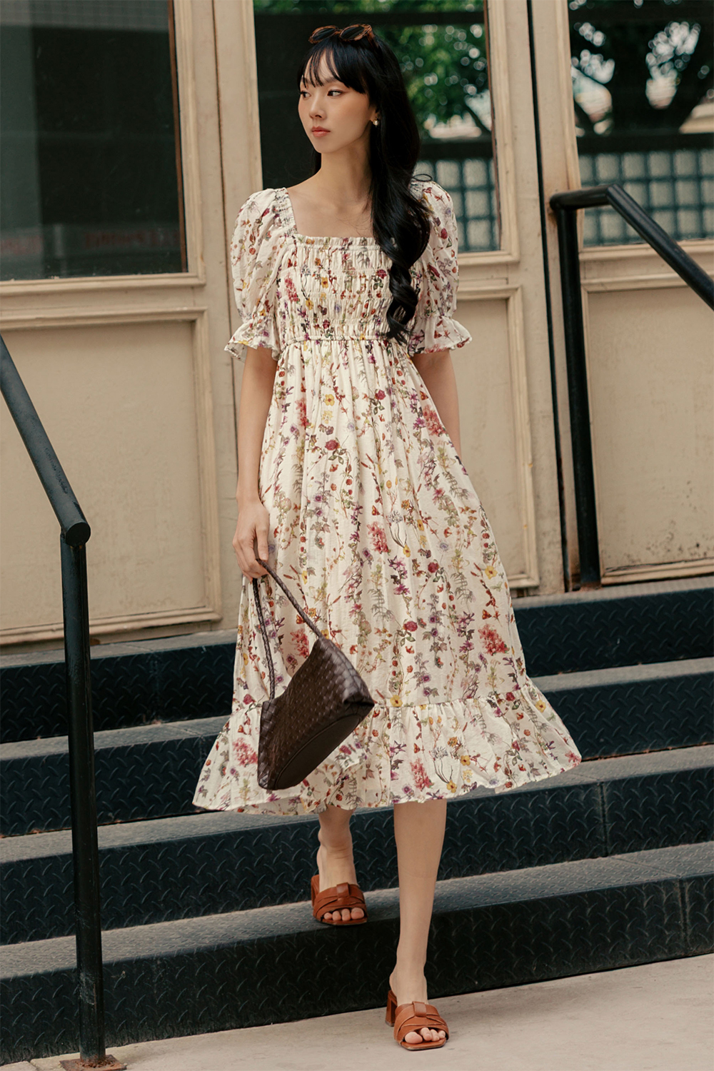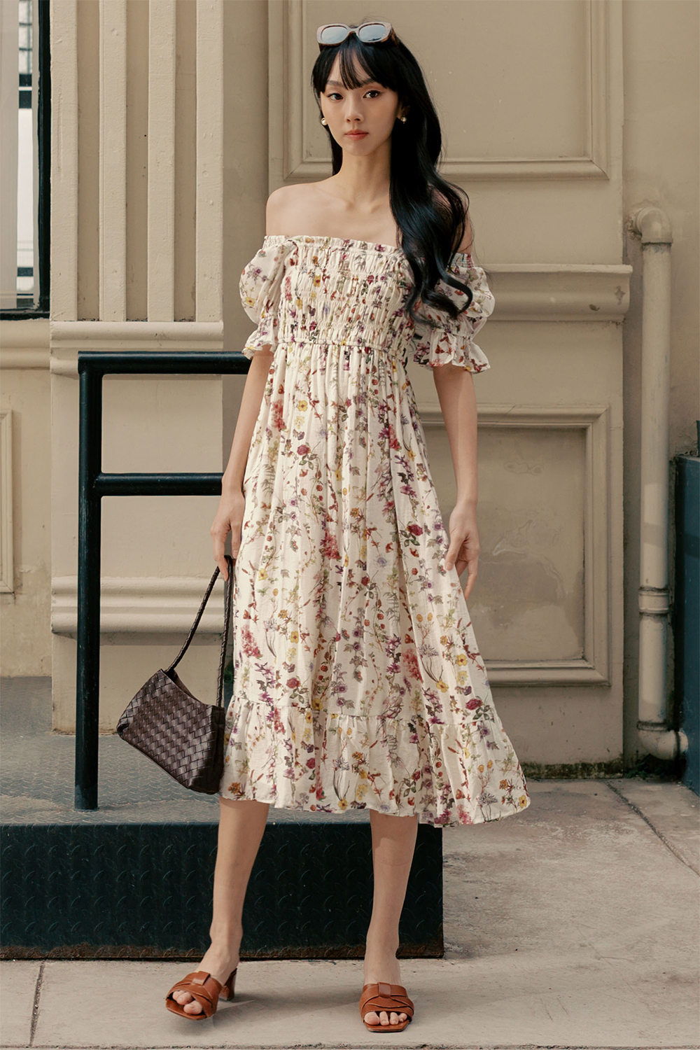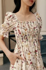 Elastic at sides of shoulders. Puffed sleeves with elastic ruffled hems.