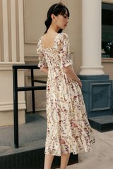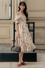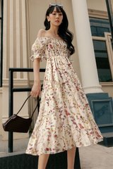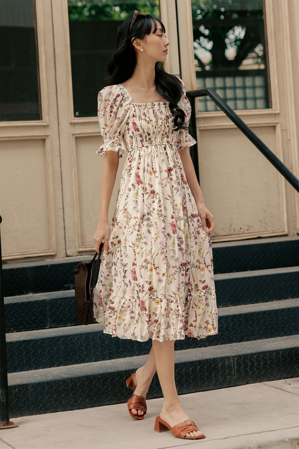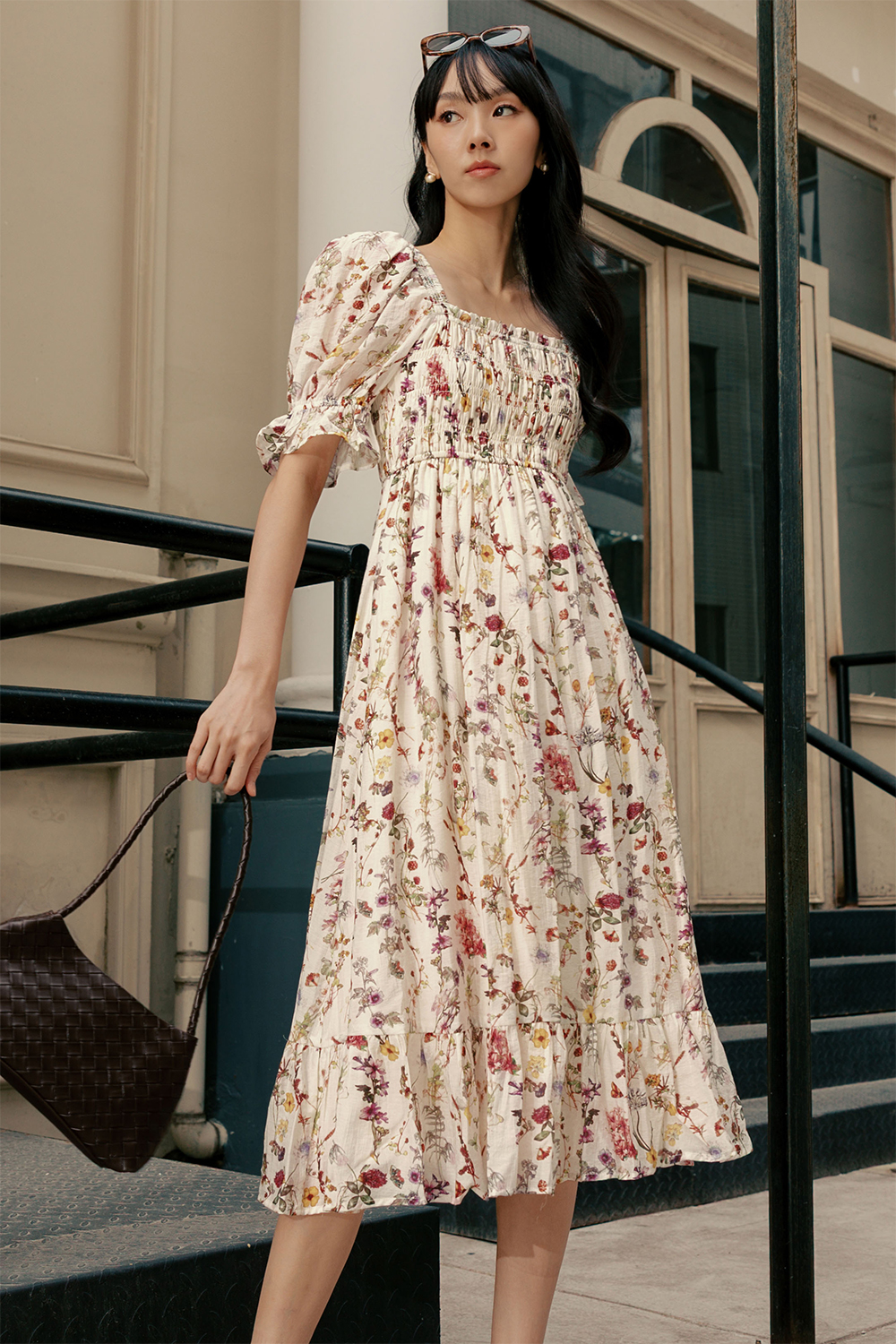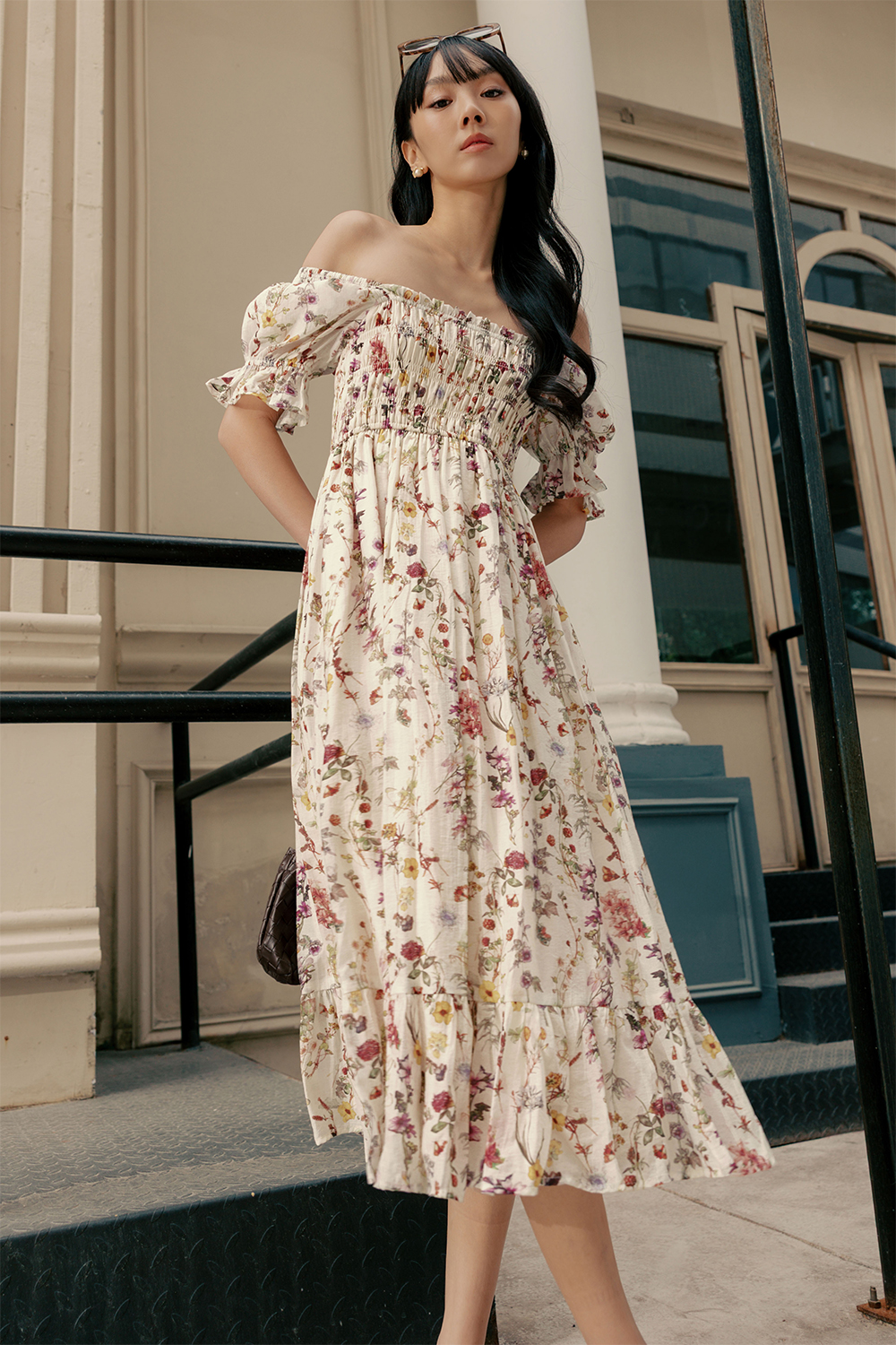 Elastic at sides of shoulders. Puffed sleeves with elastic ruffled hems.