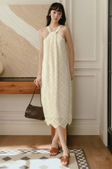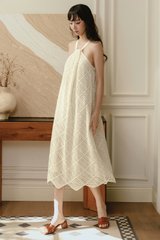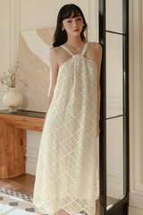 Halter neckline with draping fold details at top middle front of chest.