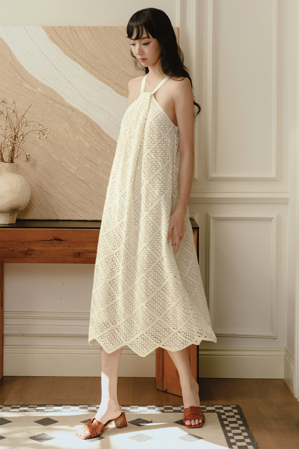 Made of crochet-knit blend.