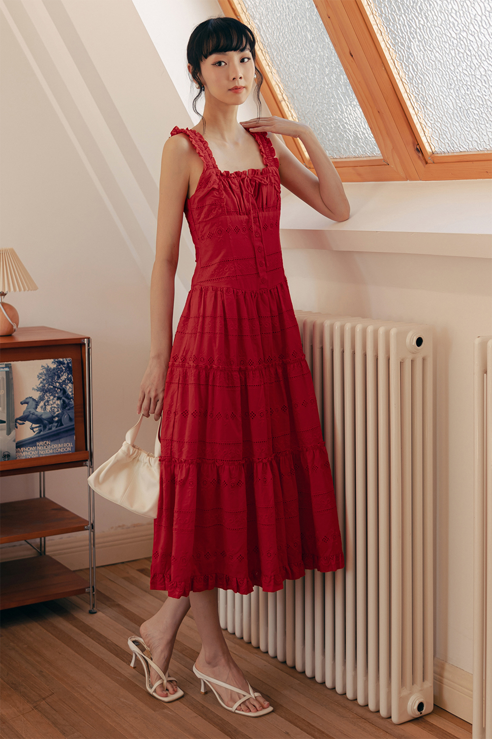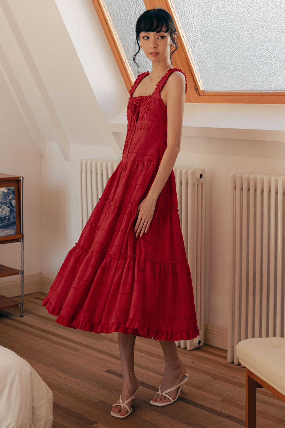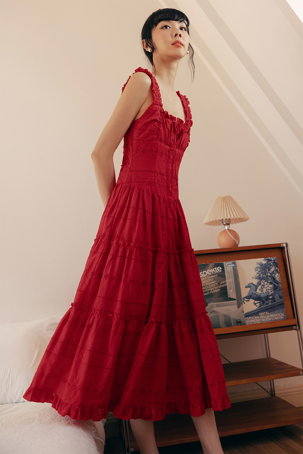 ZOIE BRODERIE EMBROIDERY TIERED MAXI IN RED