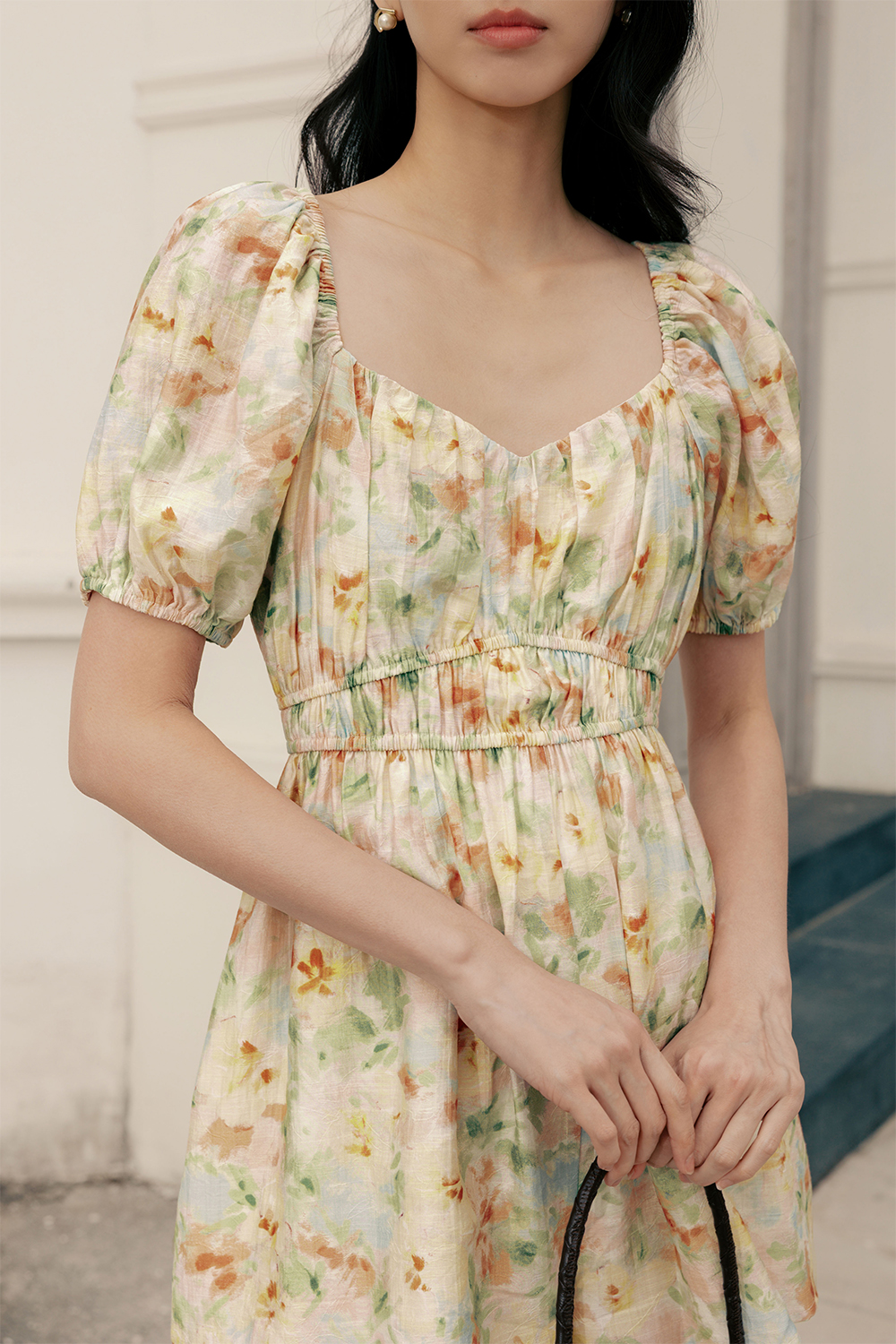 Gathered details around neckline and waist.