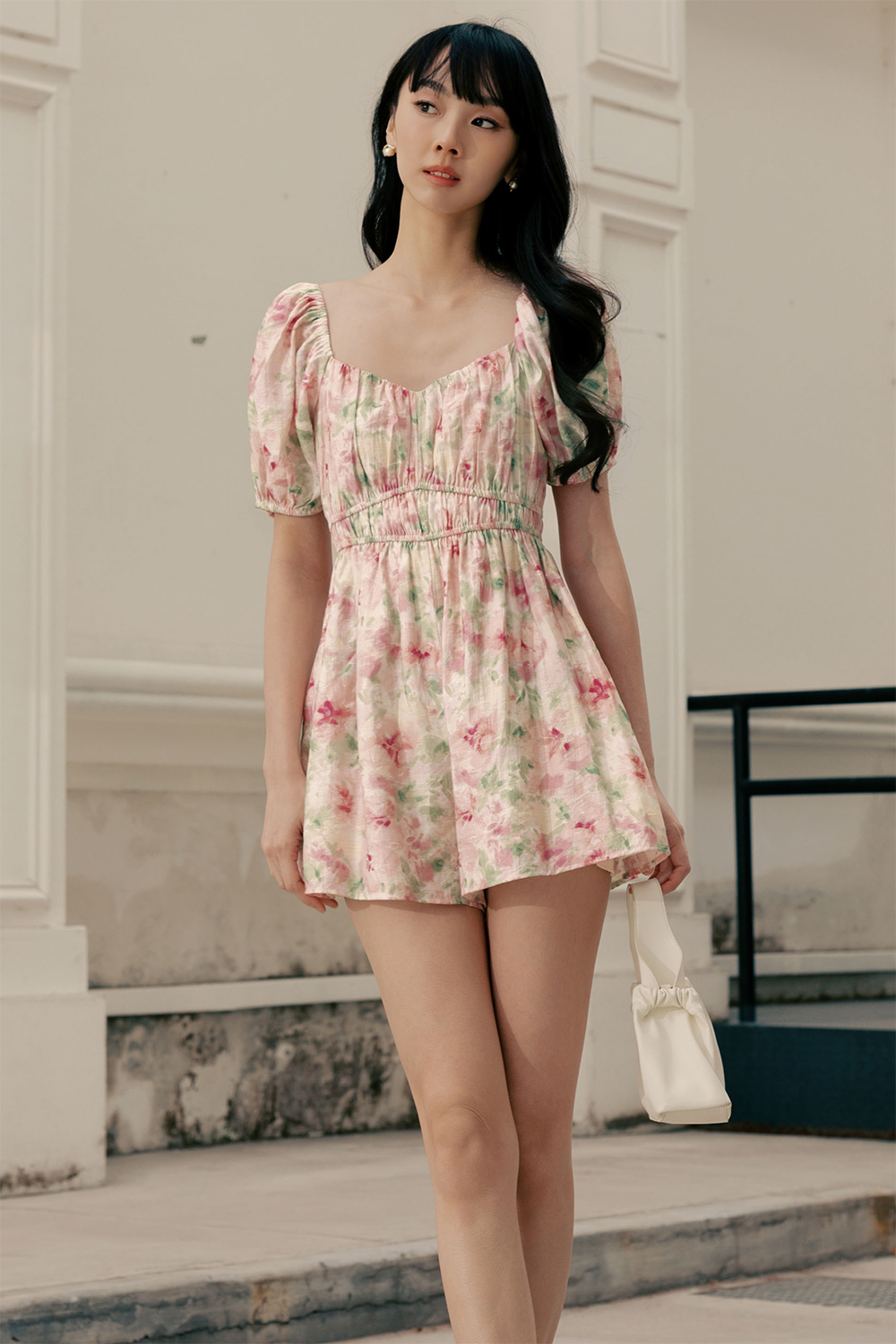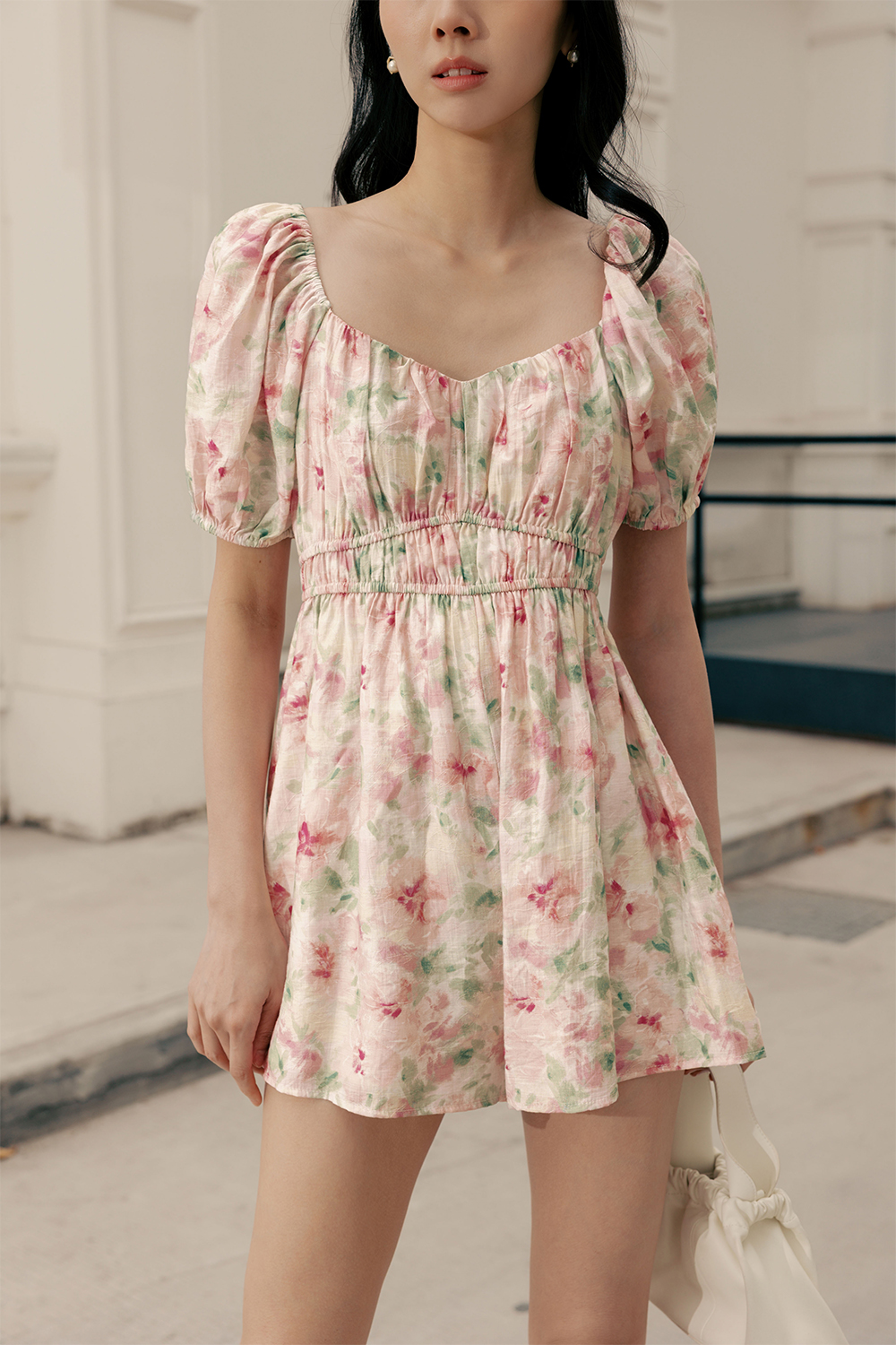 Gathered details around neckline and waist.