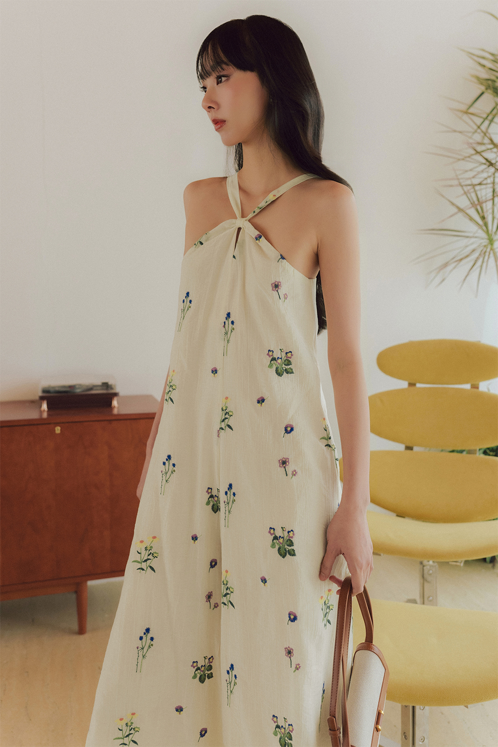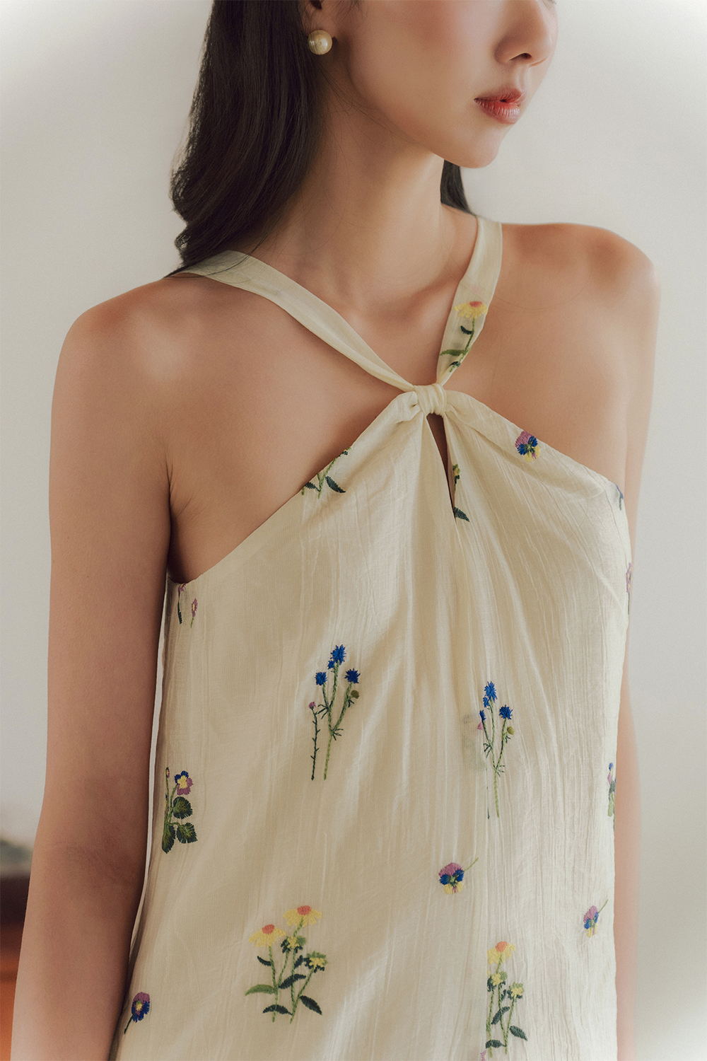 Halter neckline with slit at top middle front of chest.
