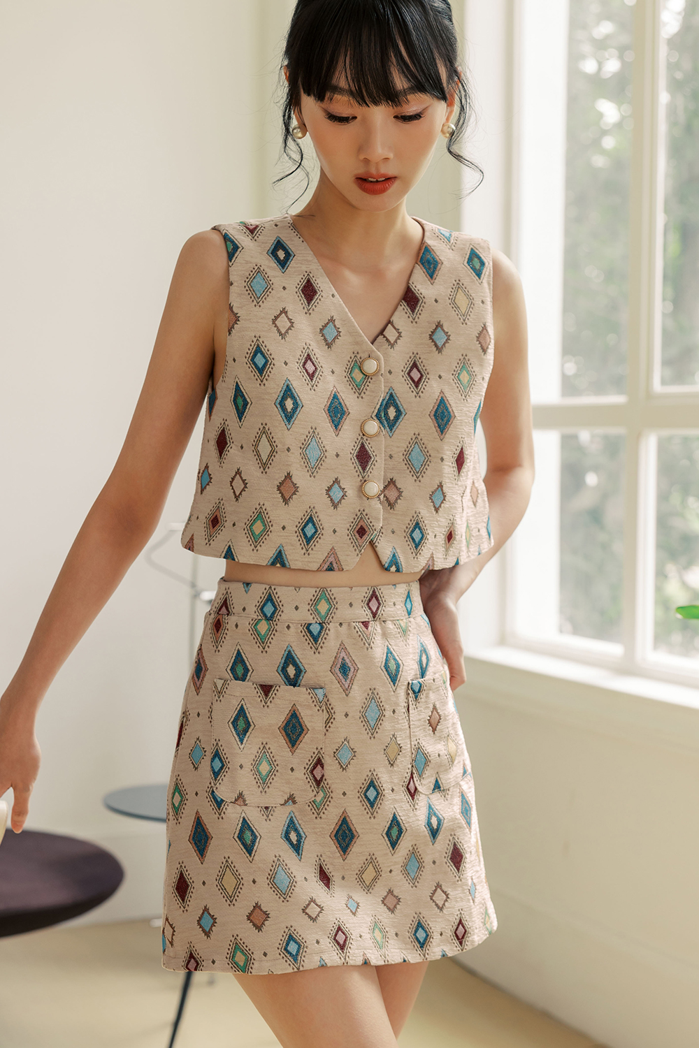 Features multi-colour geometric abstracts woven on fabric.