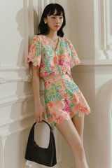 Features intricate floral embroidery and laser cut details on watercolour printed fabric.