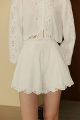 Features intricate embroidery appliqué and cut-out details around hem of shorts.
