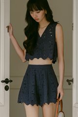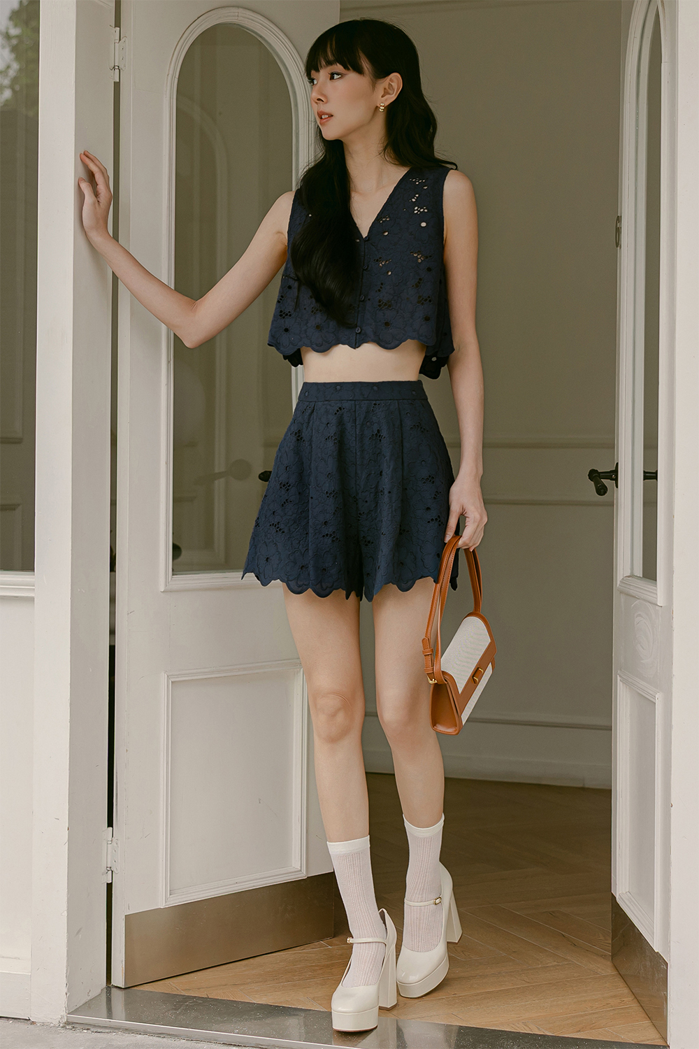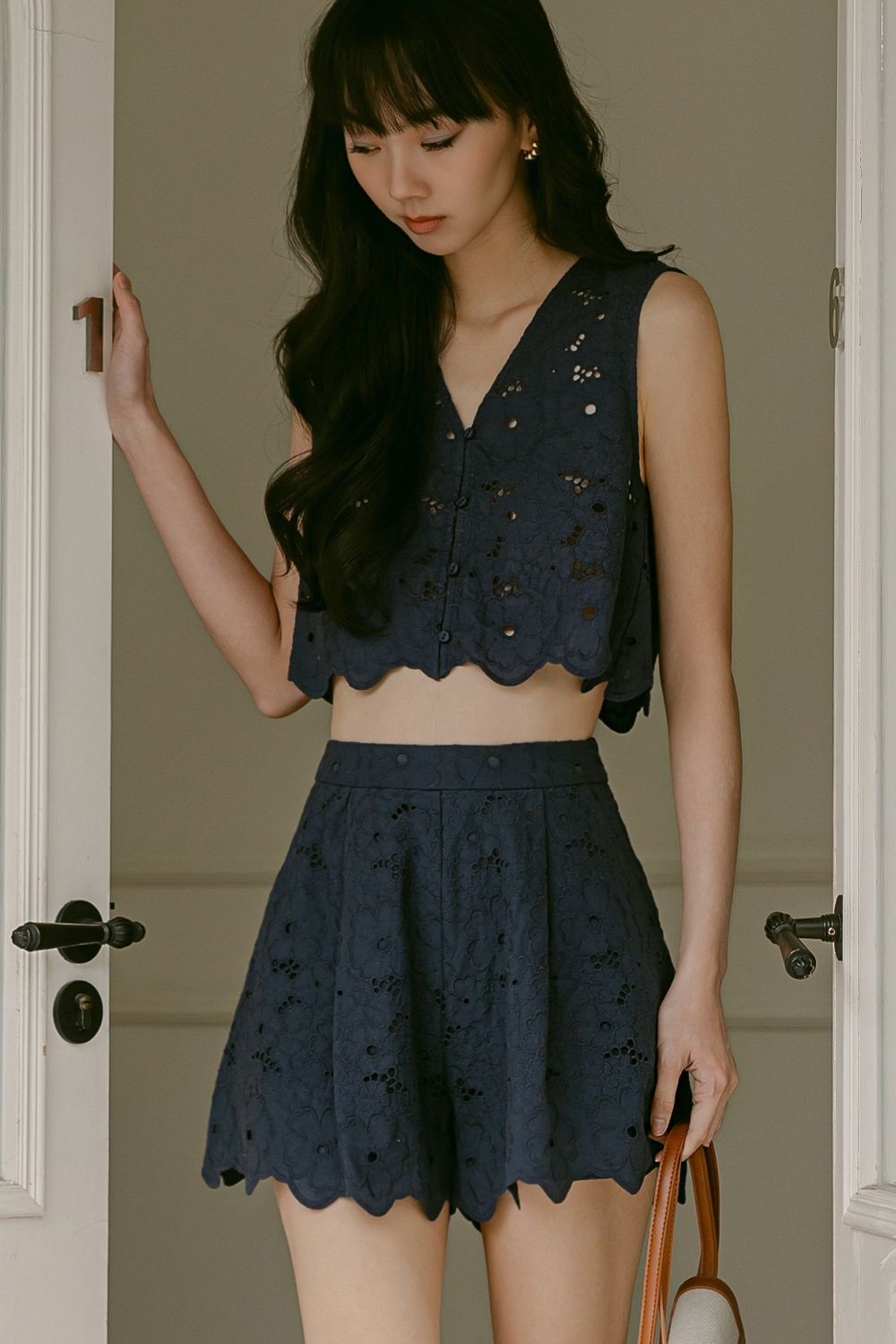 Functional side pockets. Embroidered scalloped hems around bottom hems.