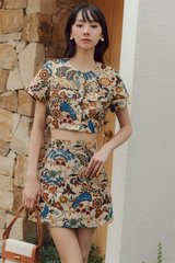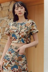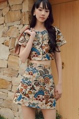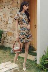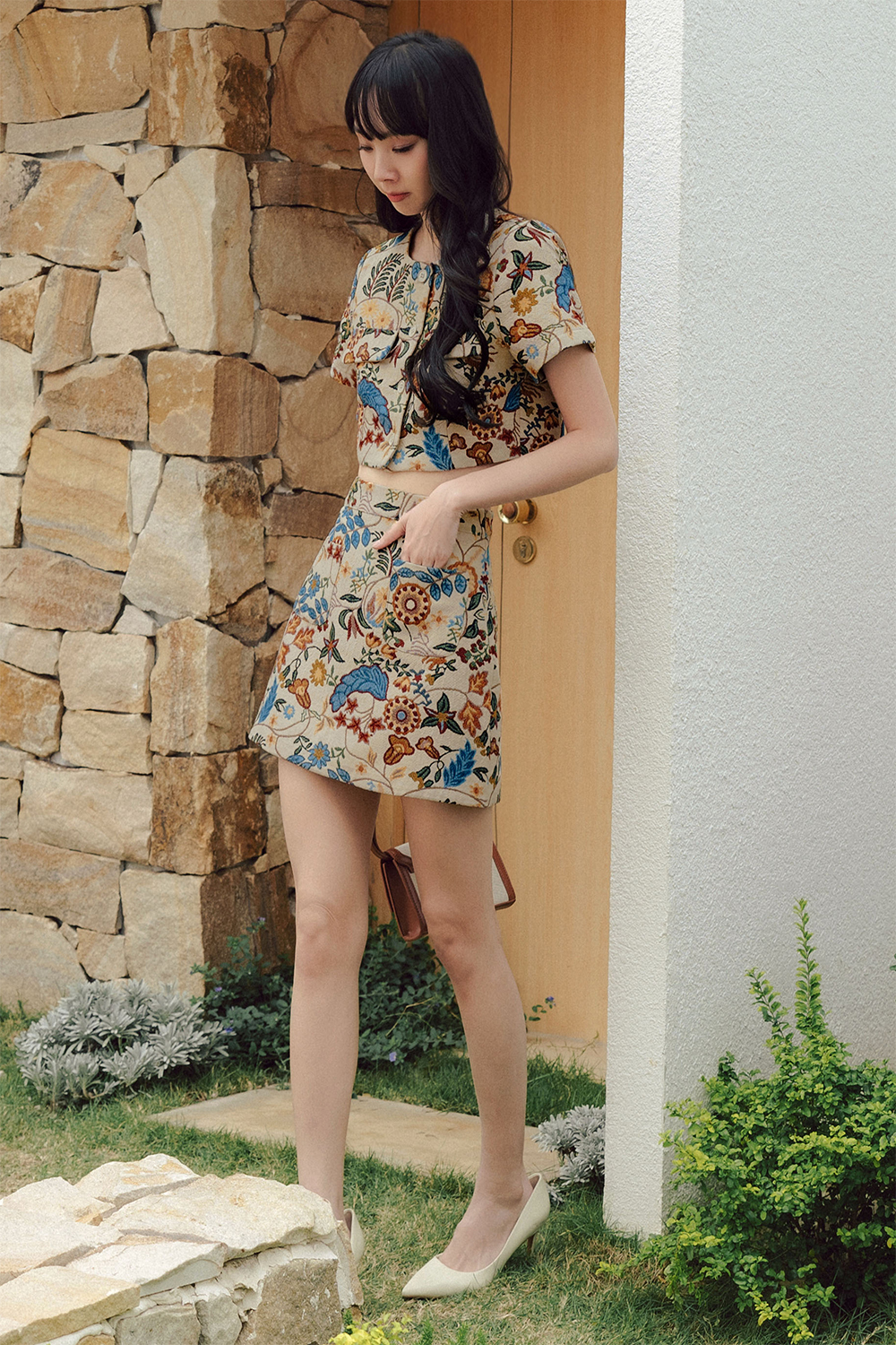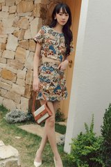 Features multi colour leaves and floral abstracts woven on textured fabric.