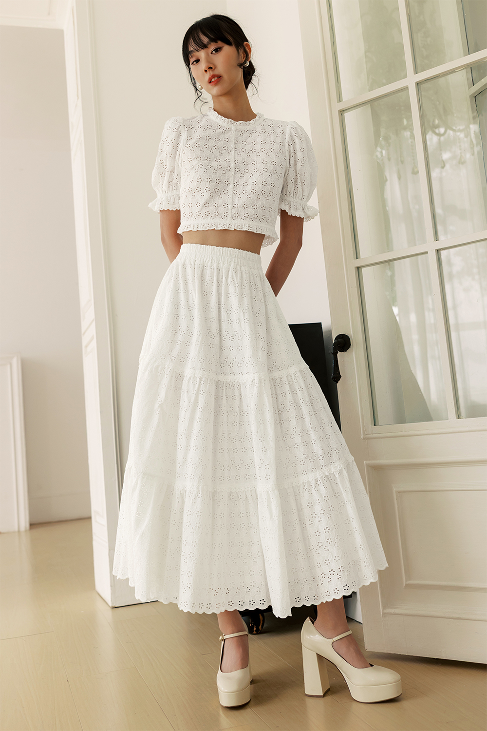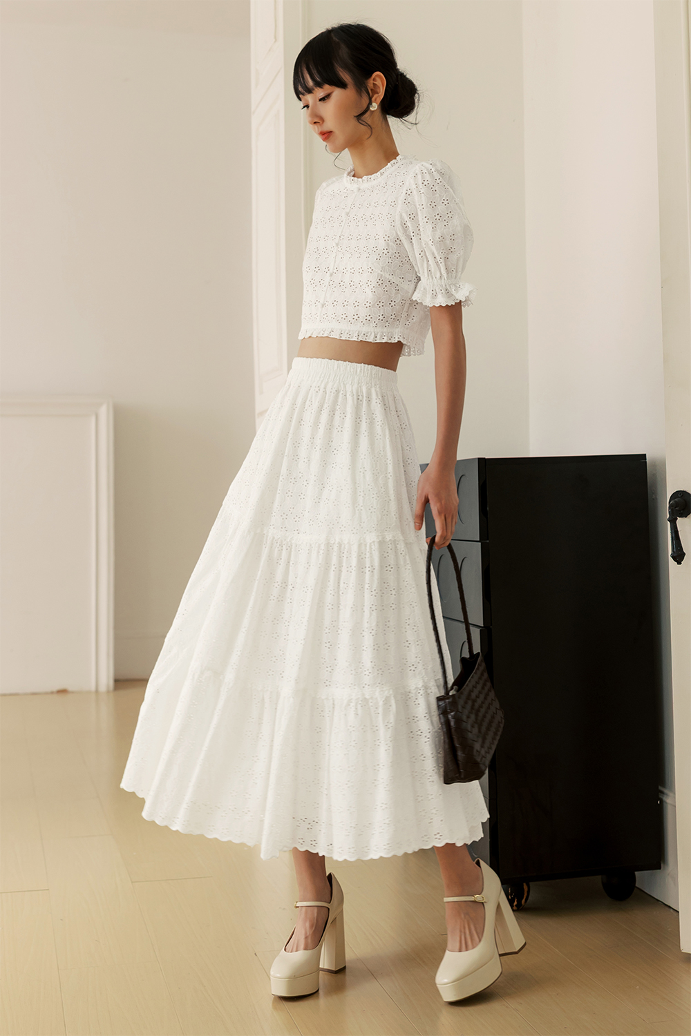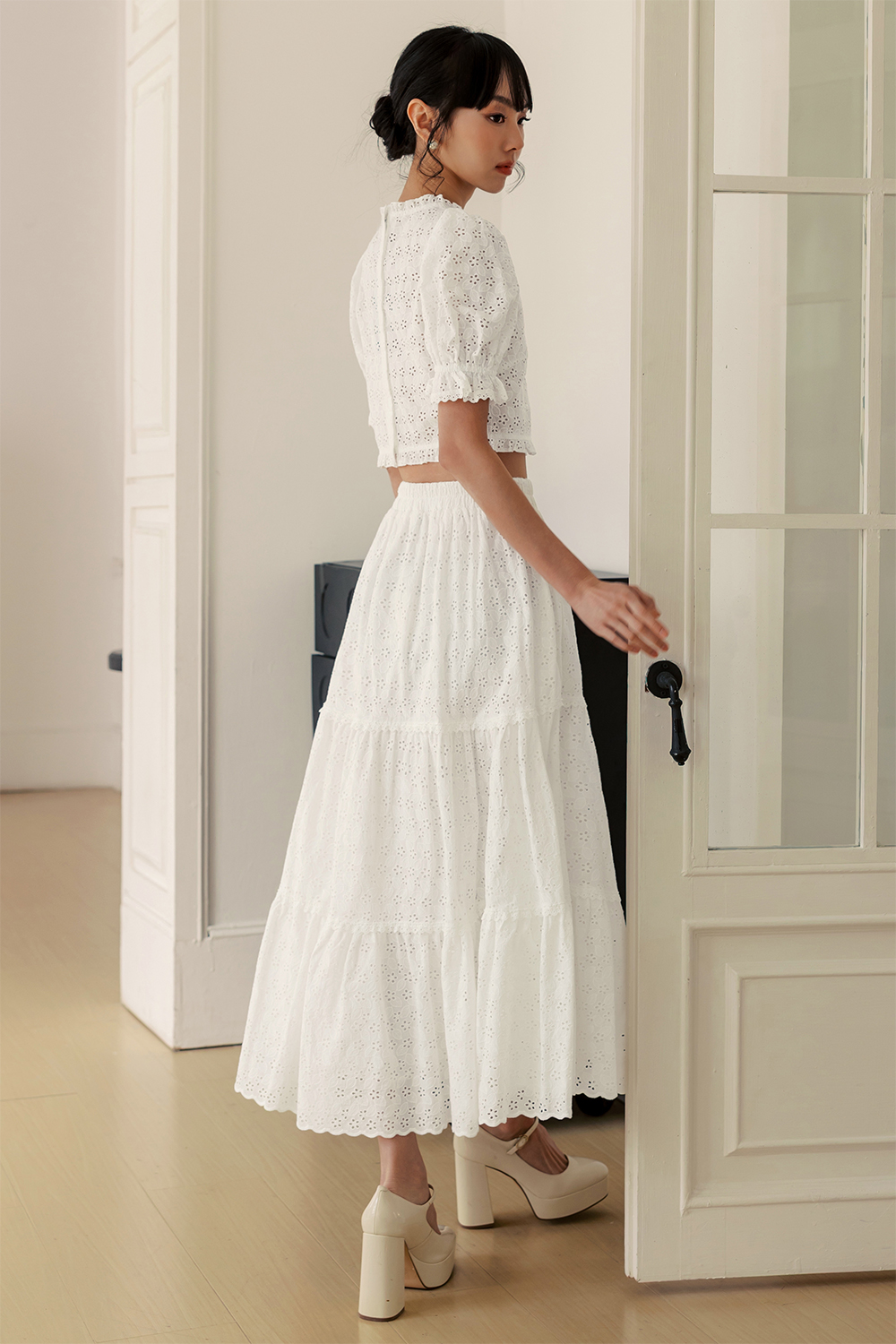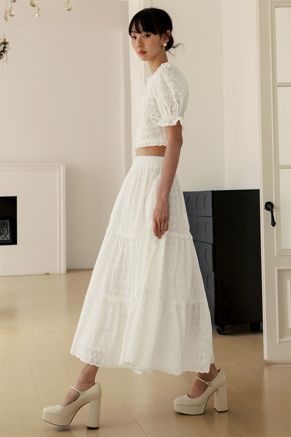 Features intricate floral abstracts embroidery and laser cut details on fabric.
