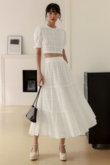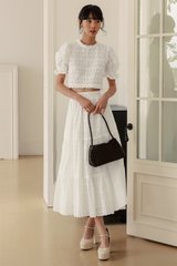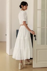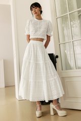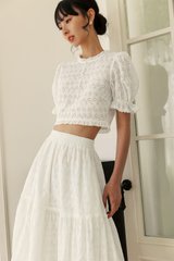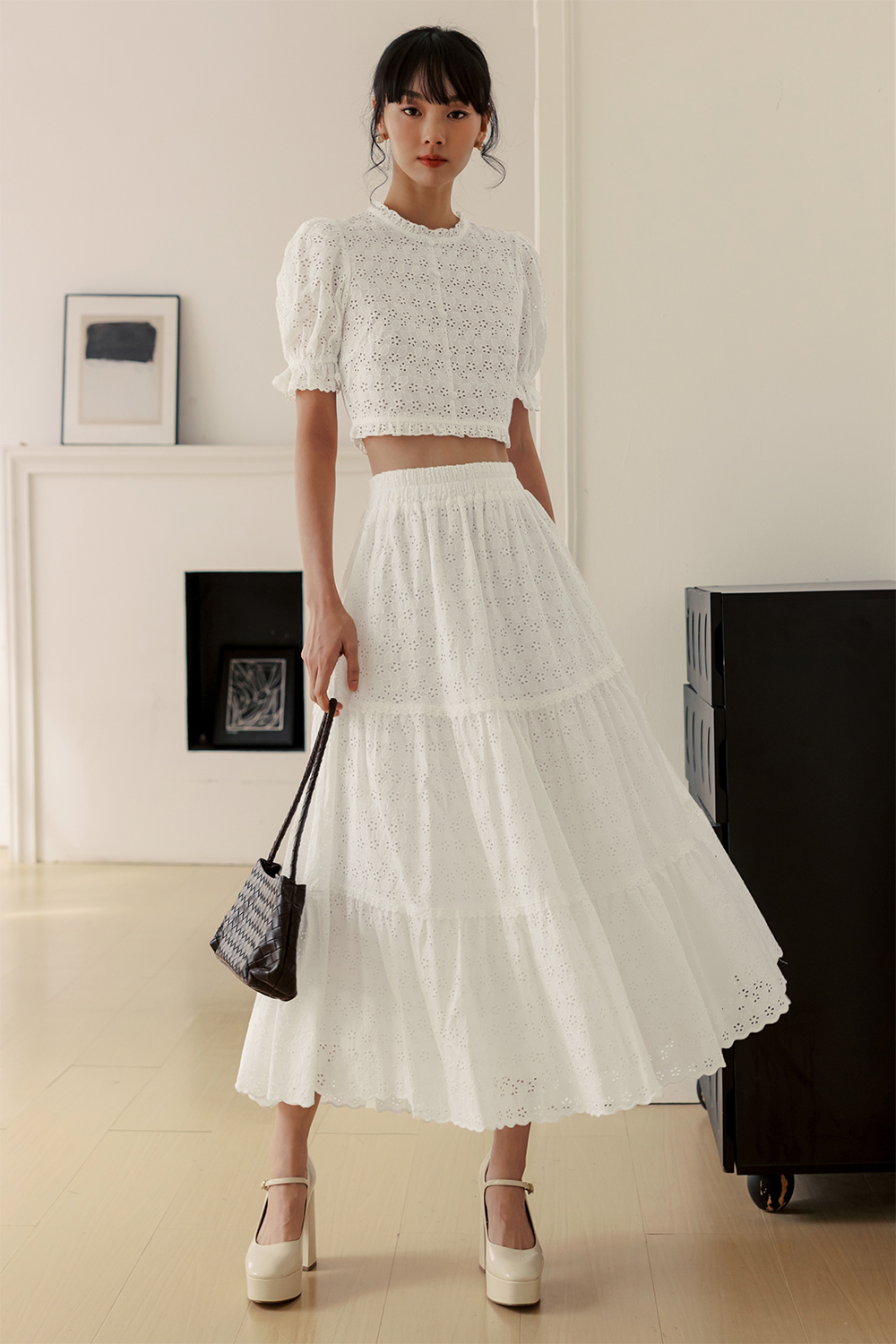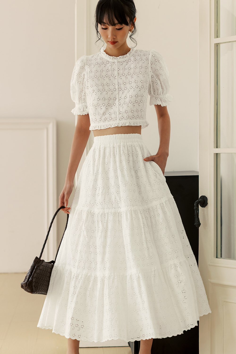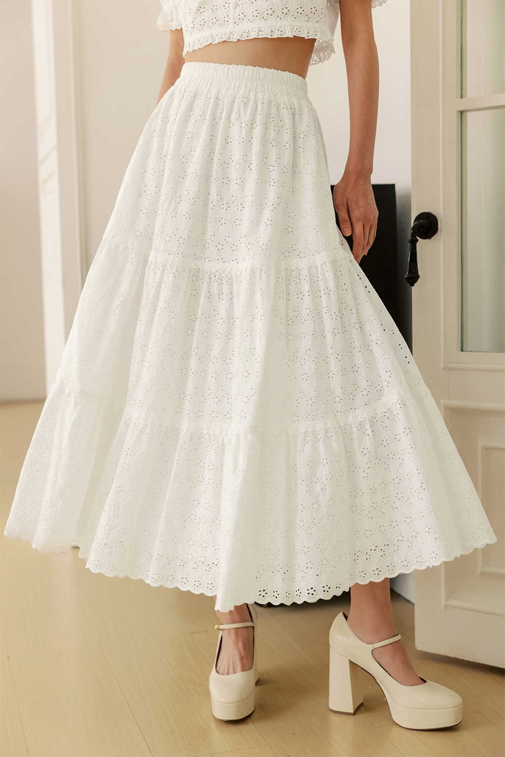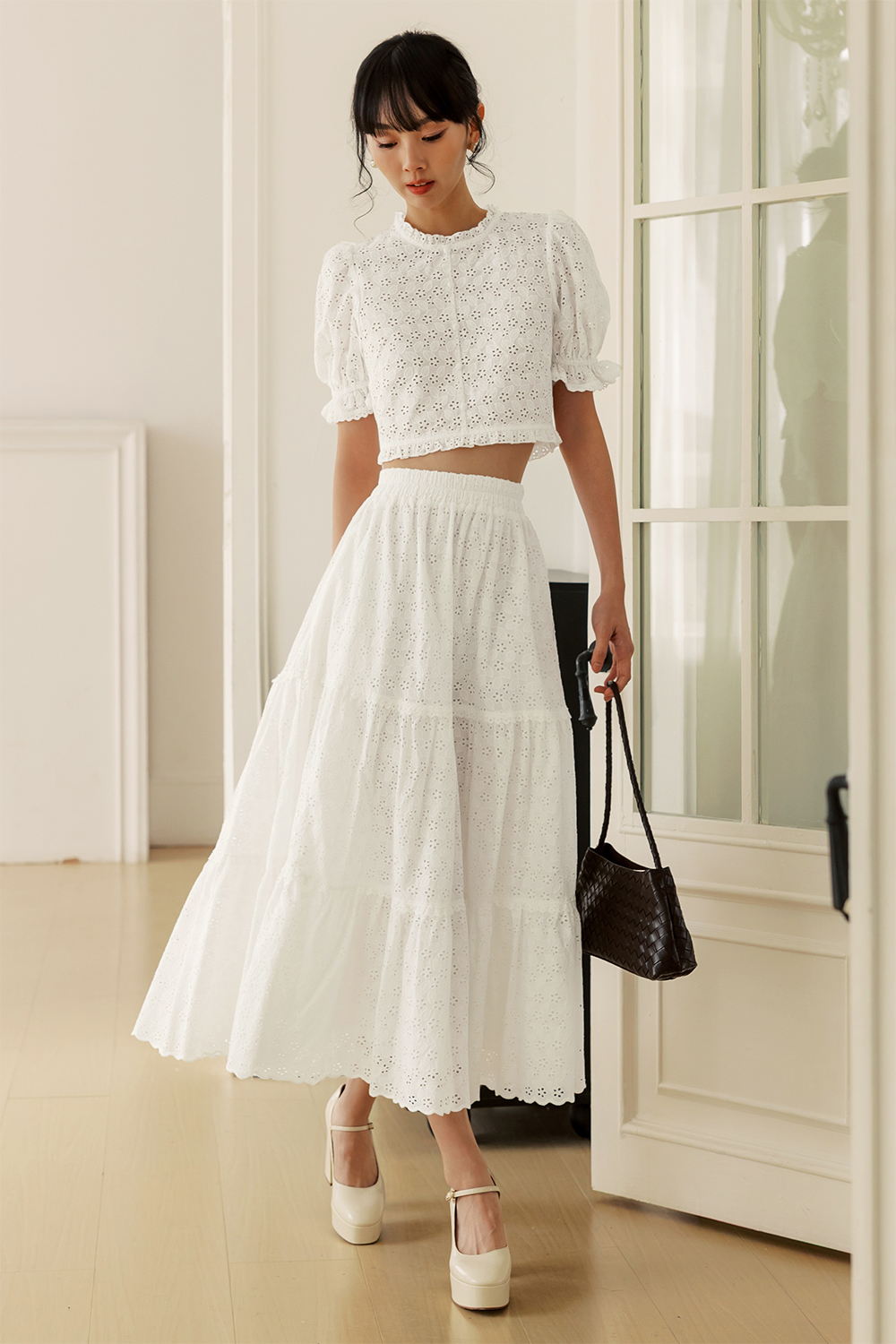 Features intricate floral abstracts embroidery and laser cut details on fabric.