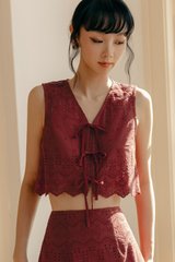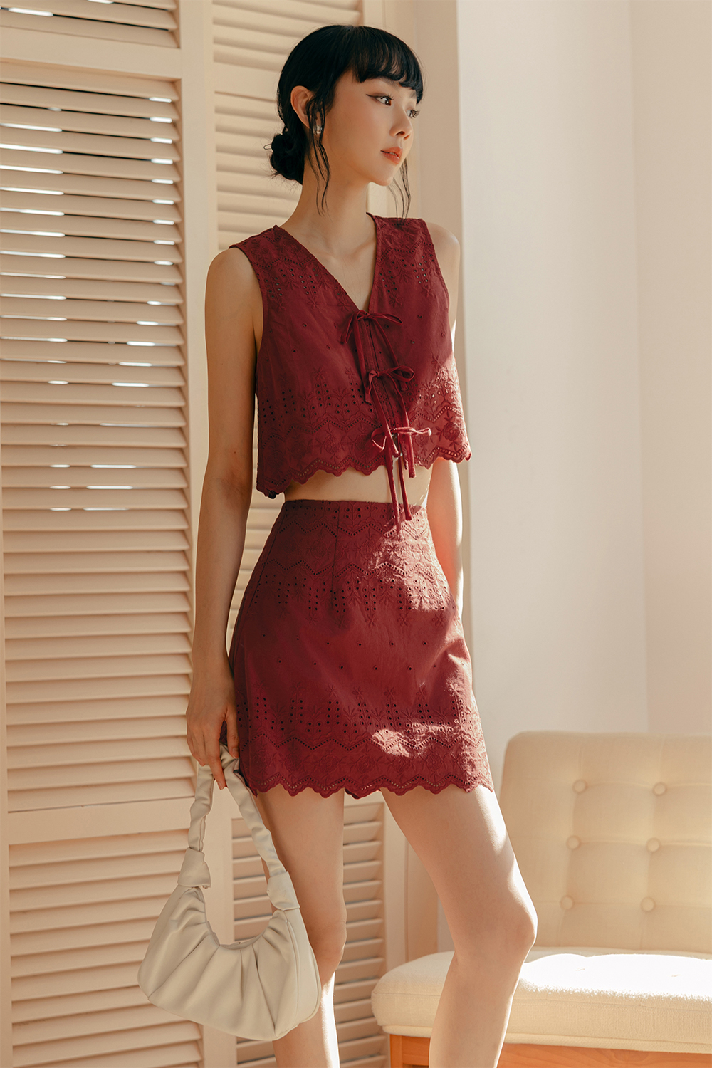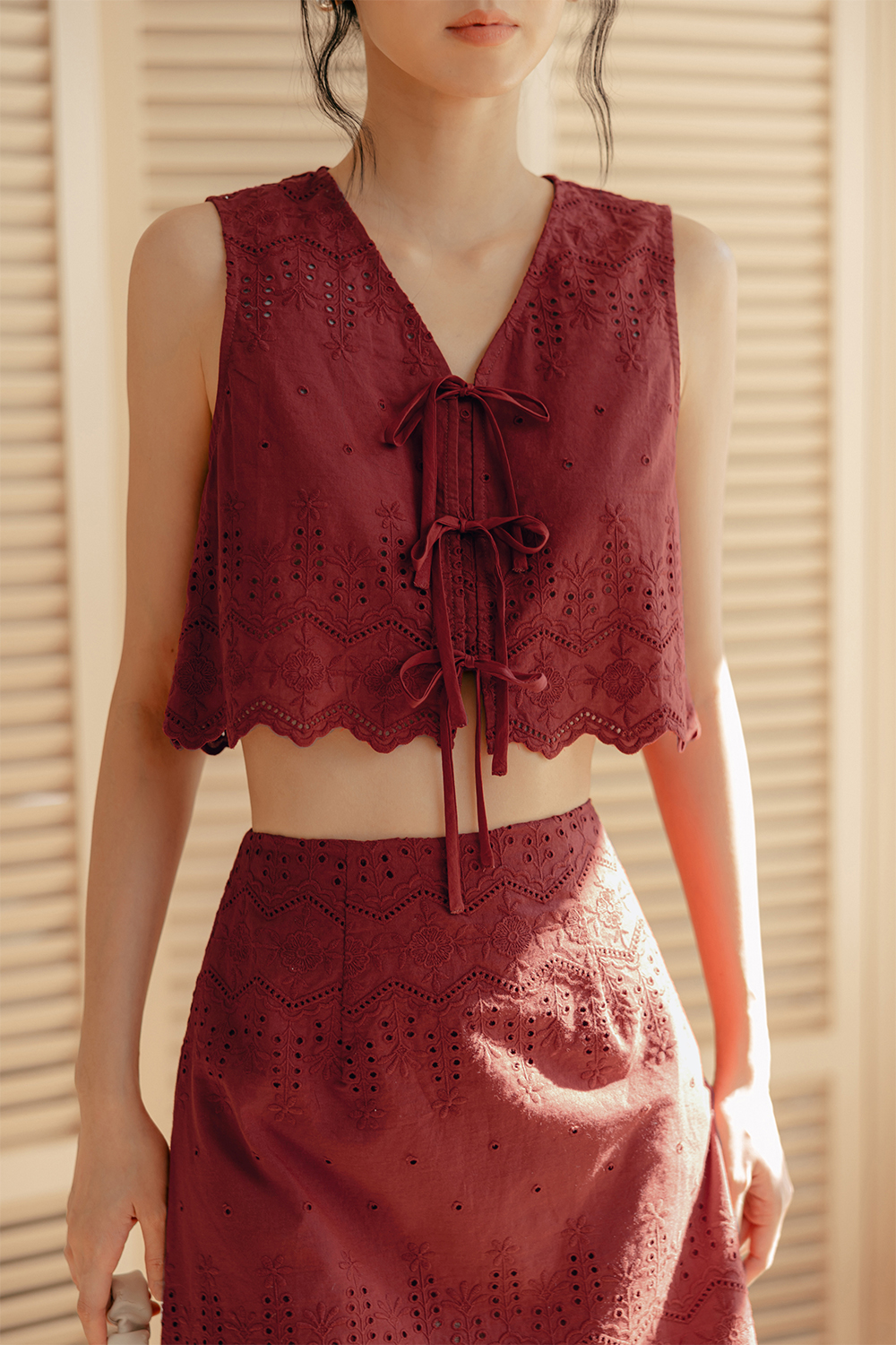 Scallop cut-out detail around hem of top.