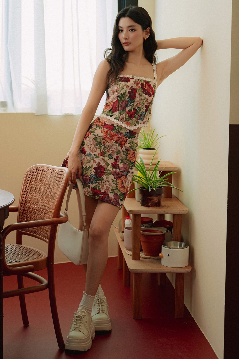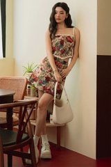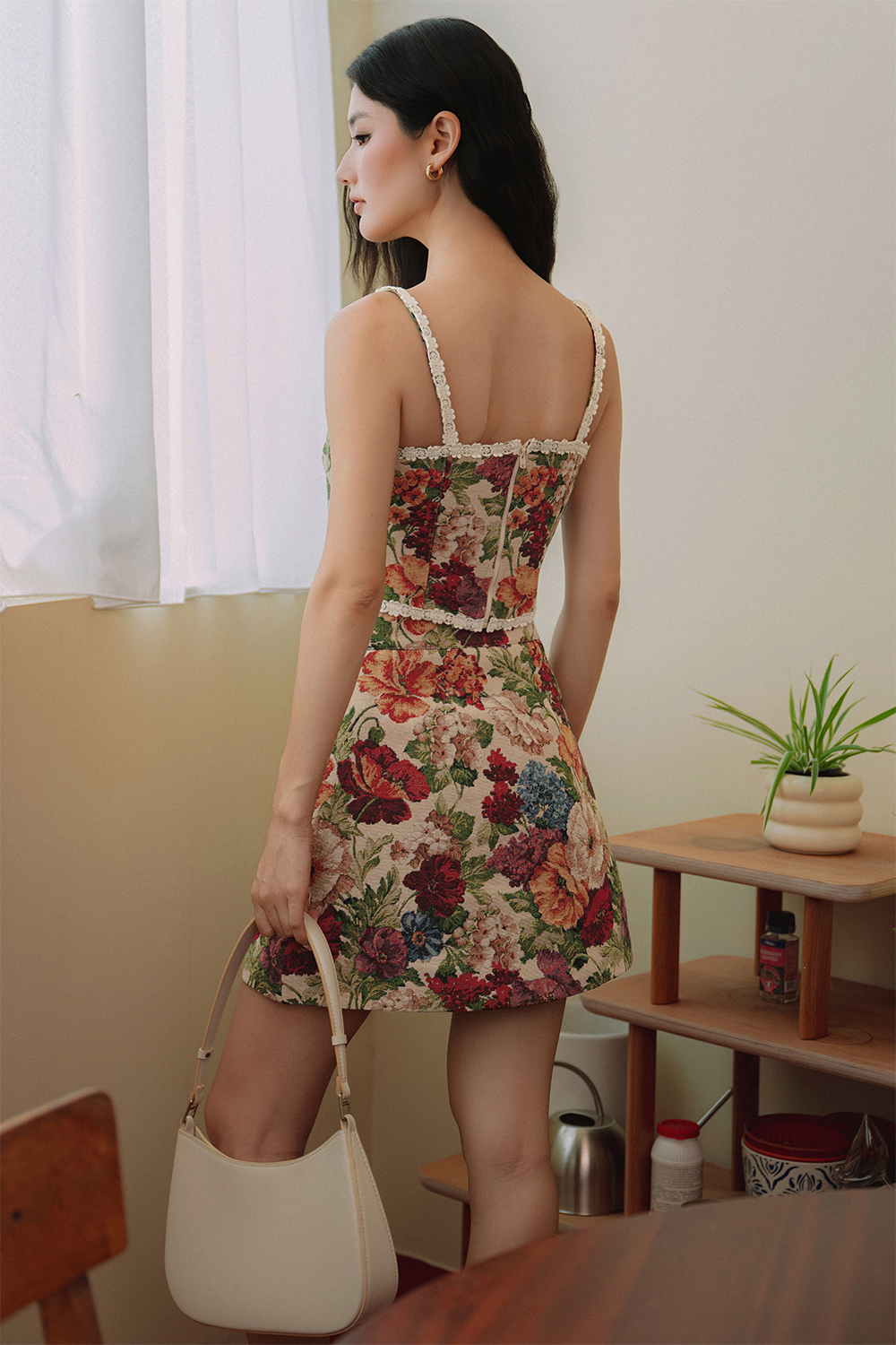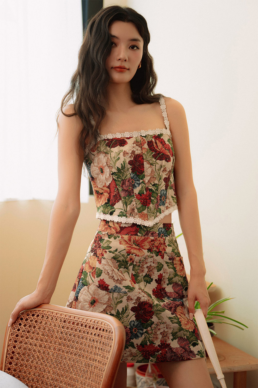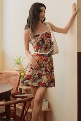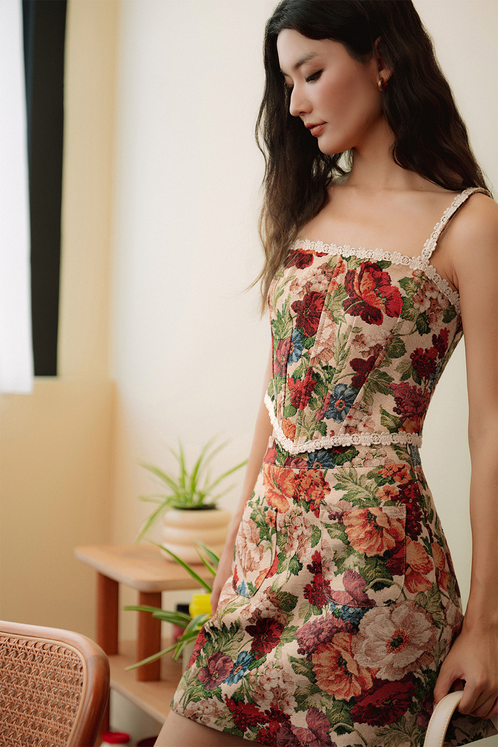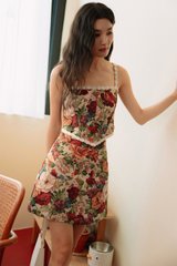 Crochet petals trimmings at straps, around neckline and hem of top.