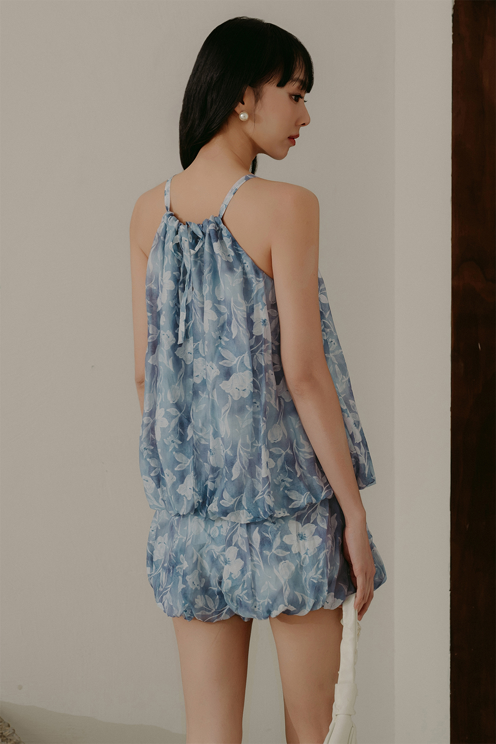 Gathered halter neckline with functional tie details at back.