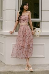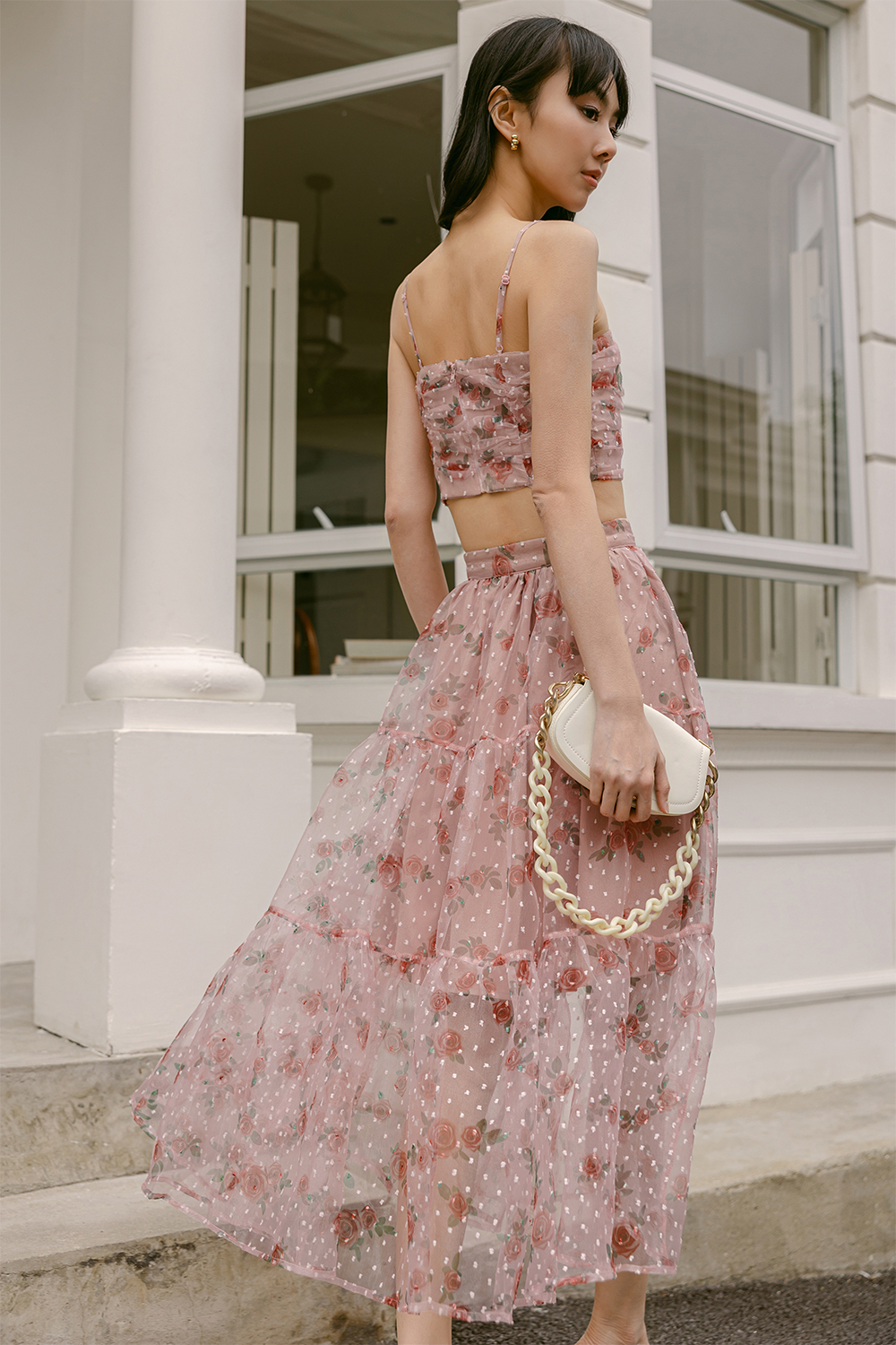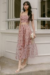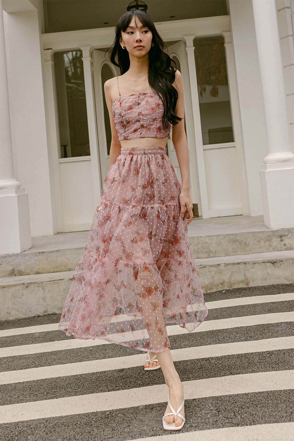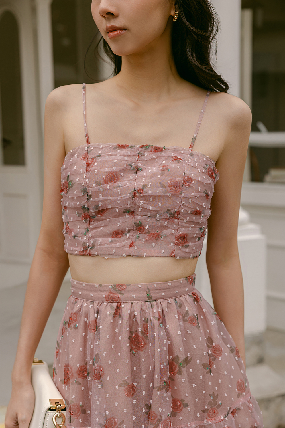 Features intricate rose abstracts printed on swiss dotted organza fabric.