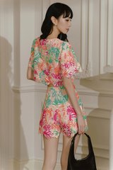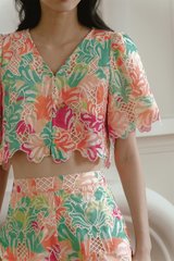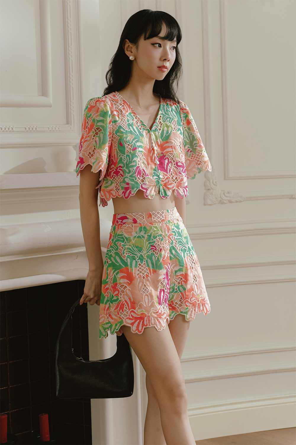 Features intricate floral embroidery and laser cut details on watercolour printed fabric.