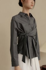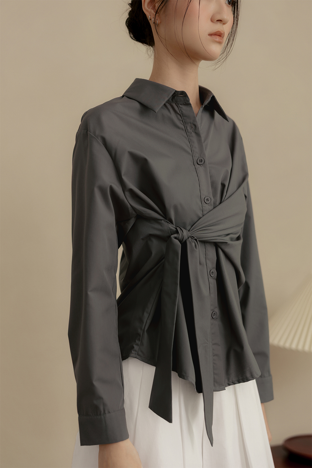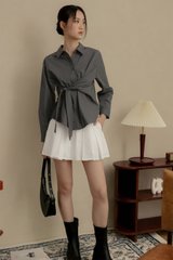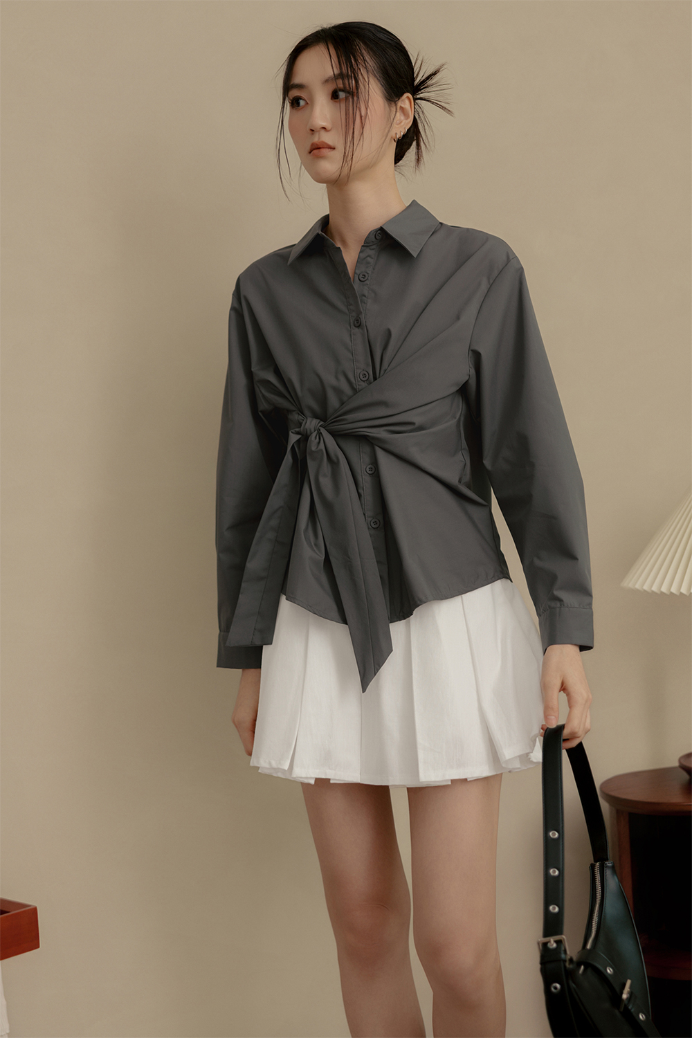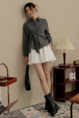 Non-detachable tie drape detail at waist.