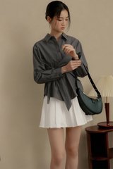 Functional button at sleeve hems. Curved hem.