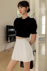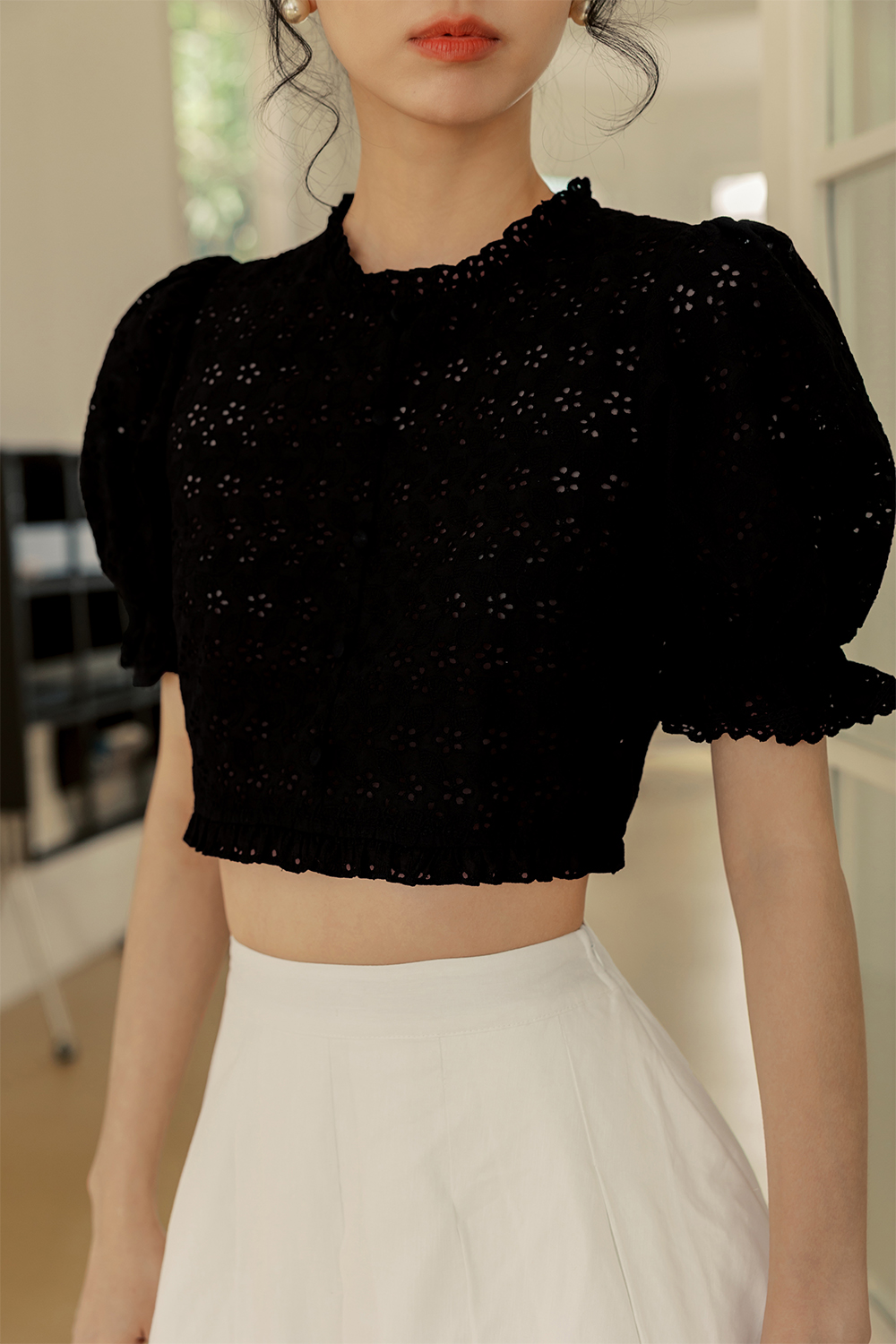 Puffed sleeves with elastic ruffled hems and broderie trims.
