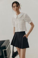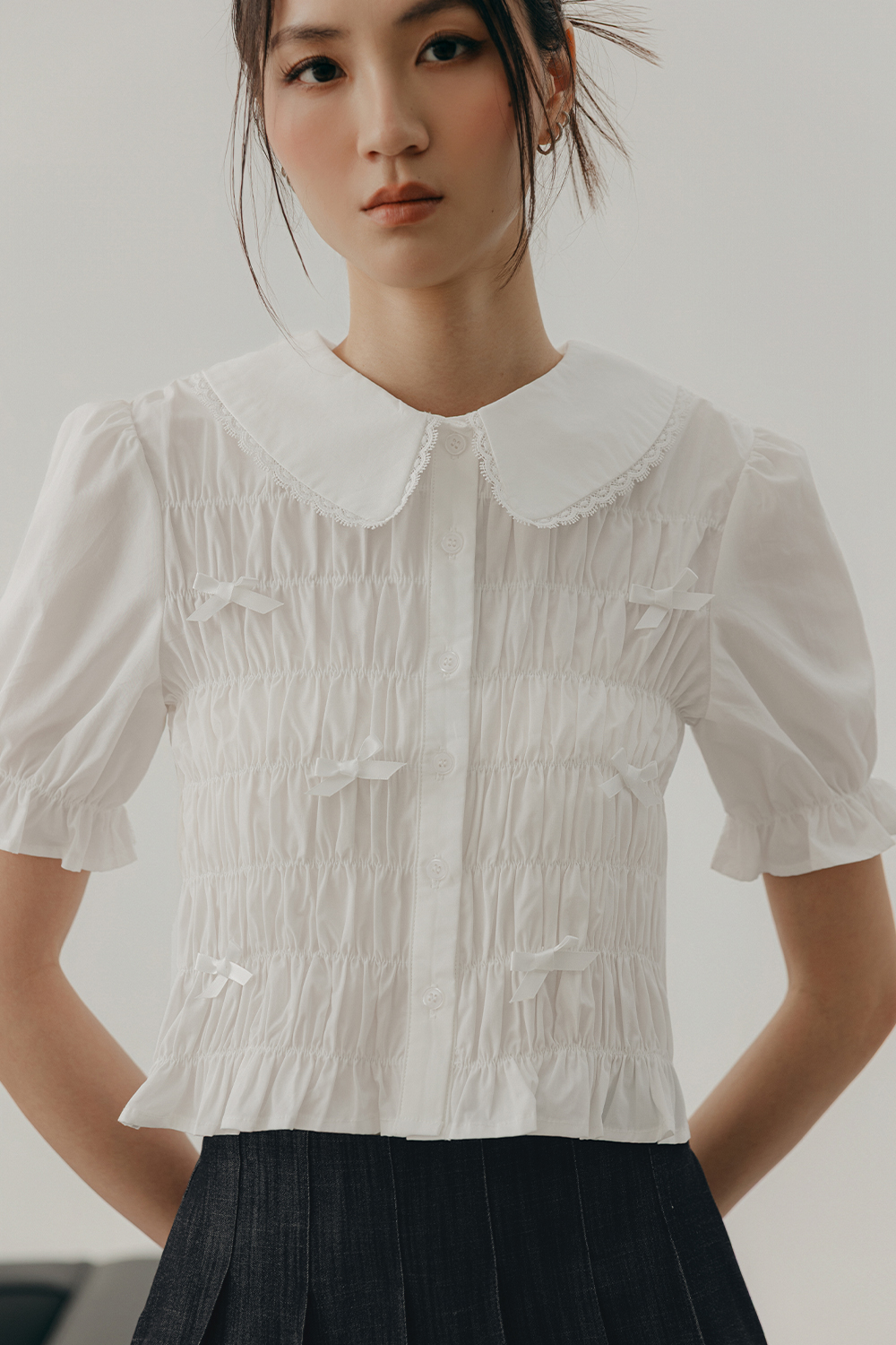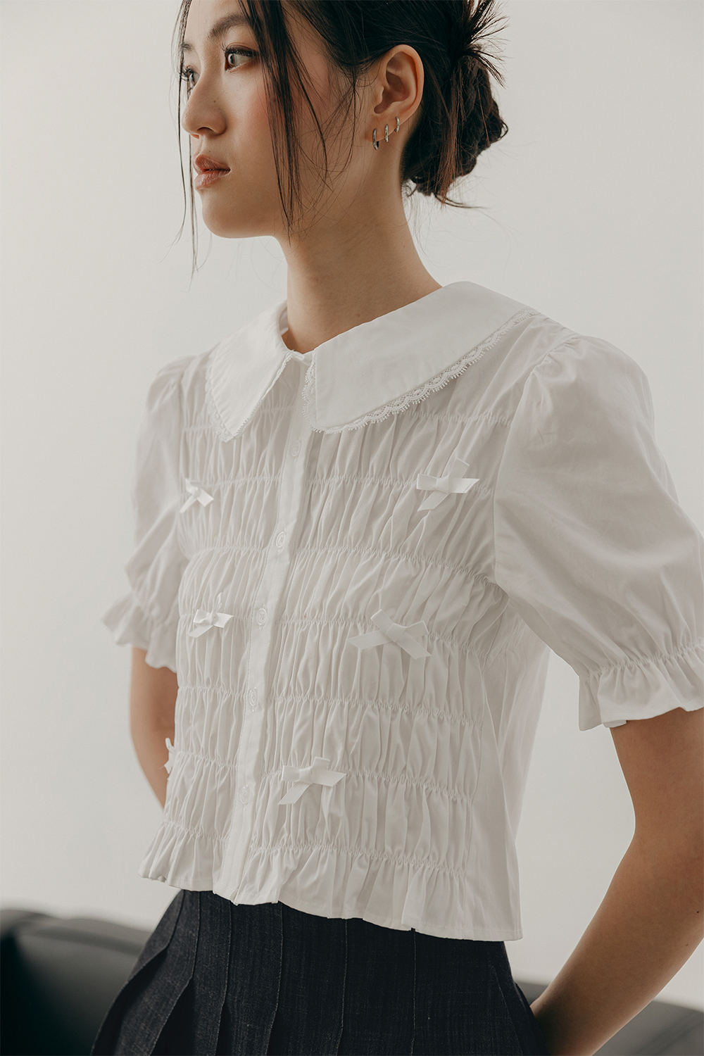 Puffed sleeves with elastic ruffled hems.