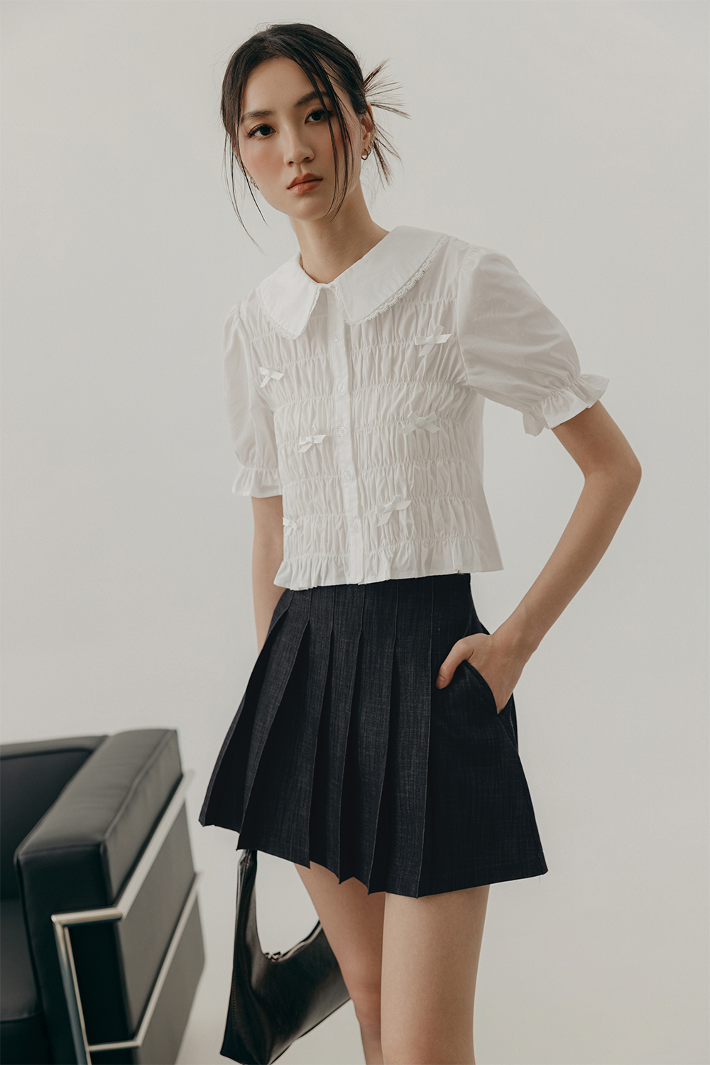 Features non-symmetrical and non-detachable ribbons at front.