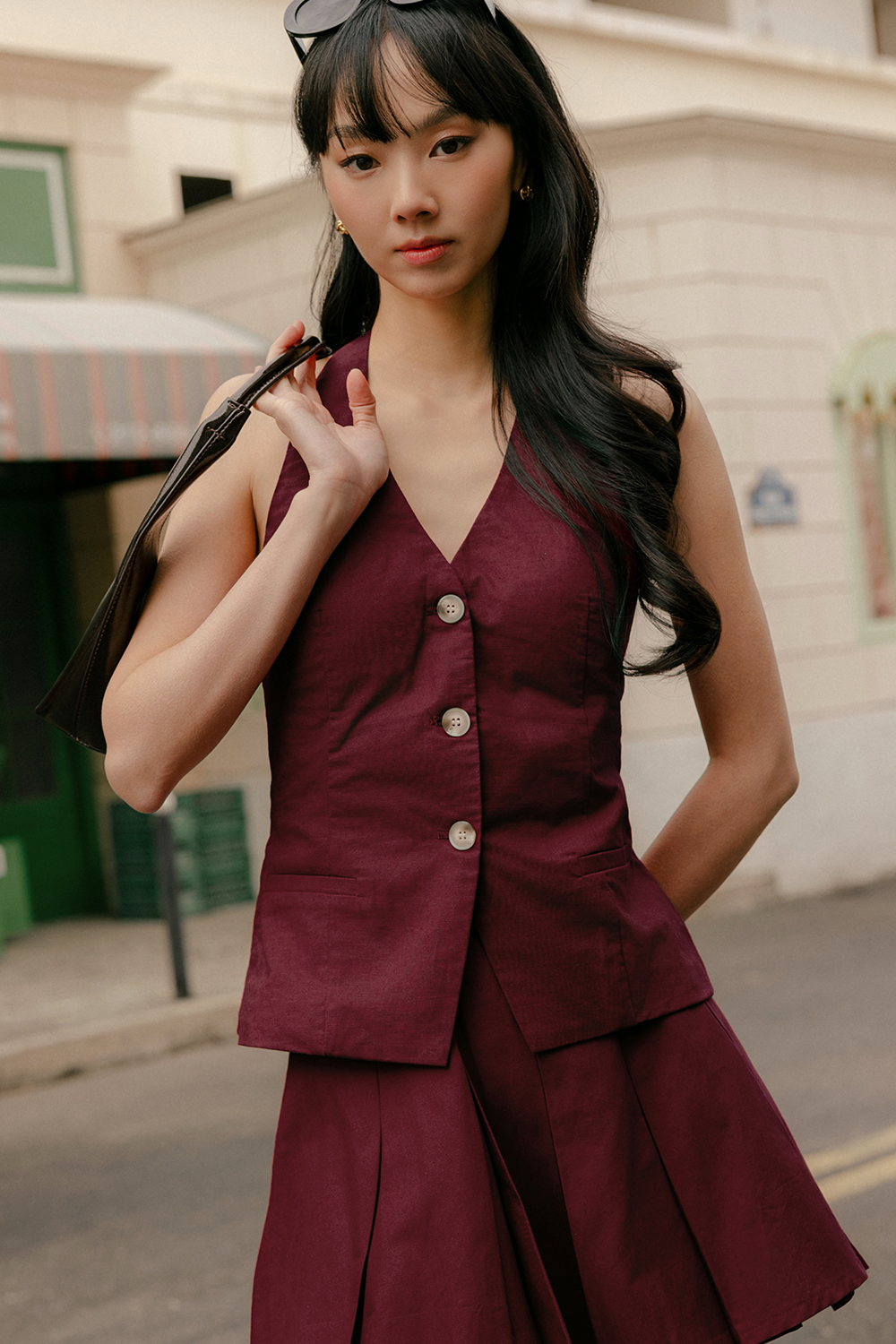 Adjustable halter neck with functional buttons down middle front.