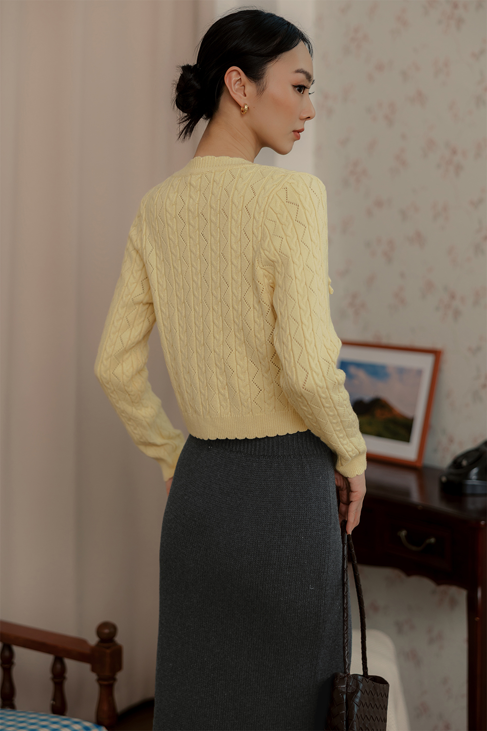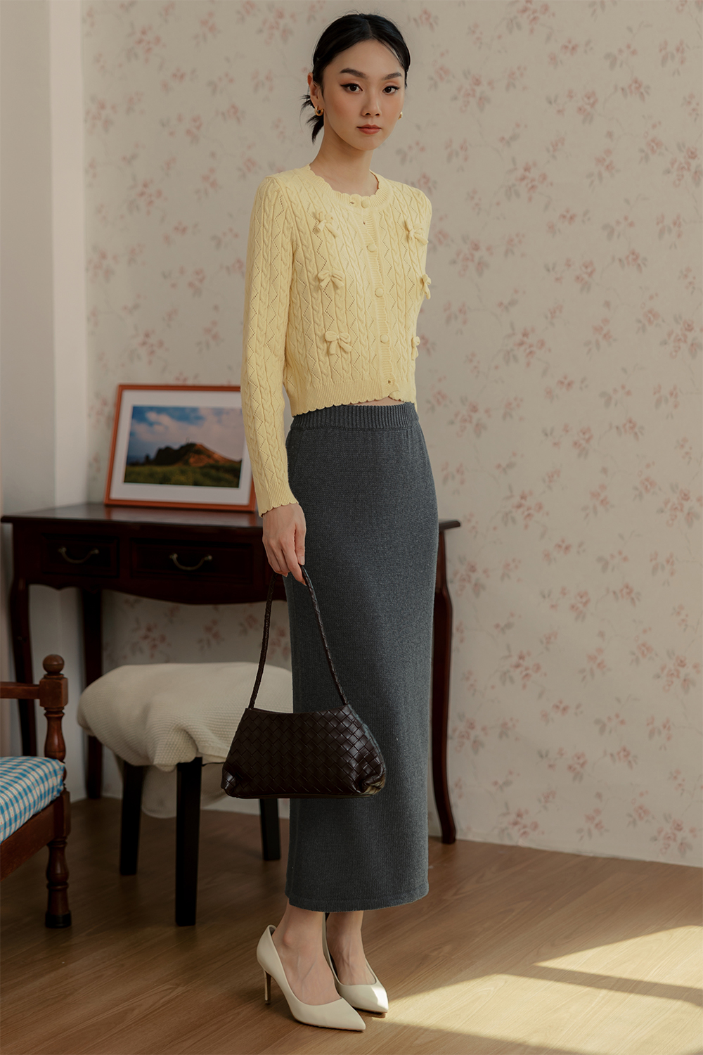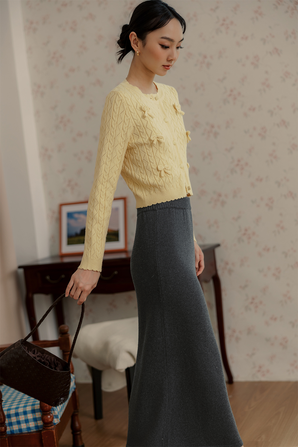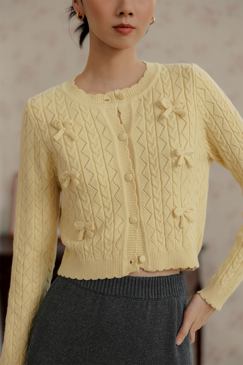 Ribbed texture with scallop hems around neckline, sleeves and hems.