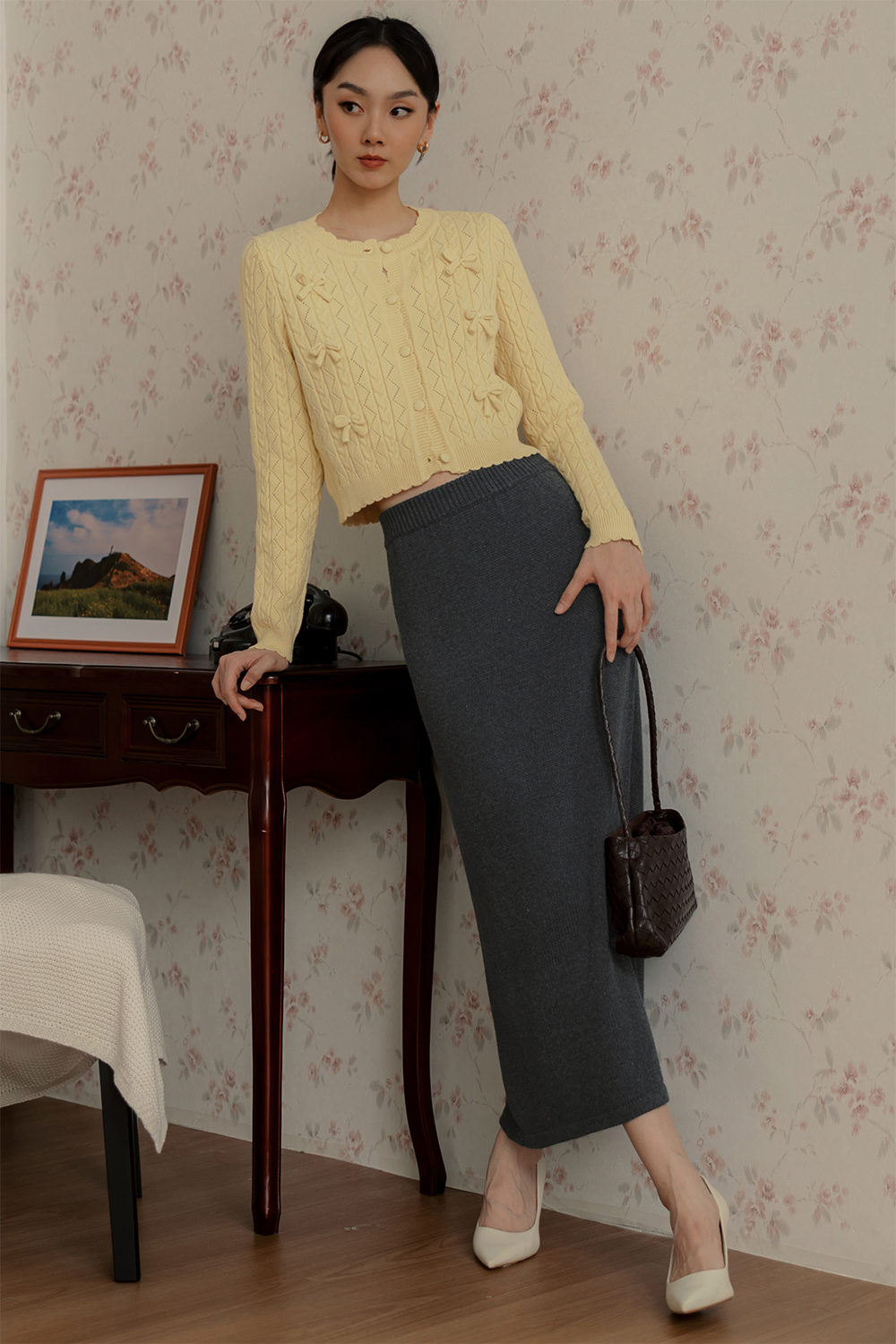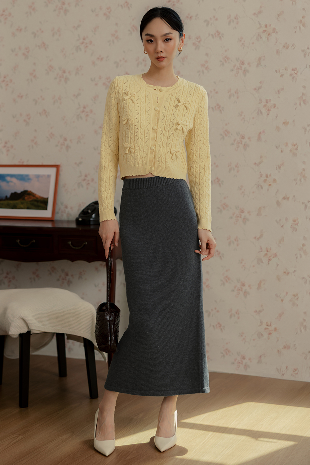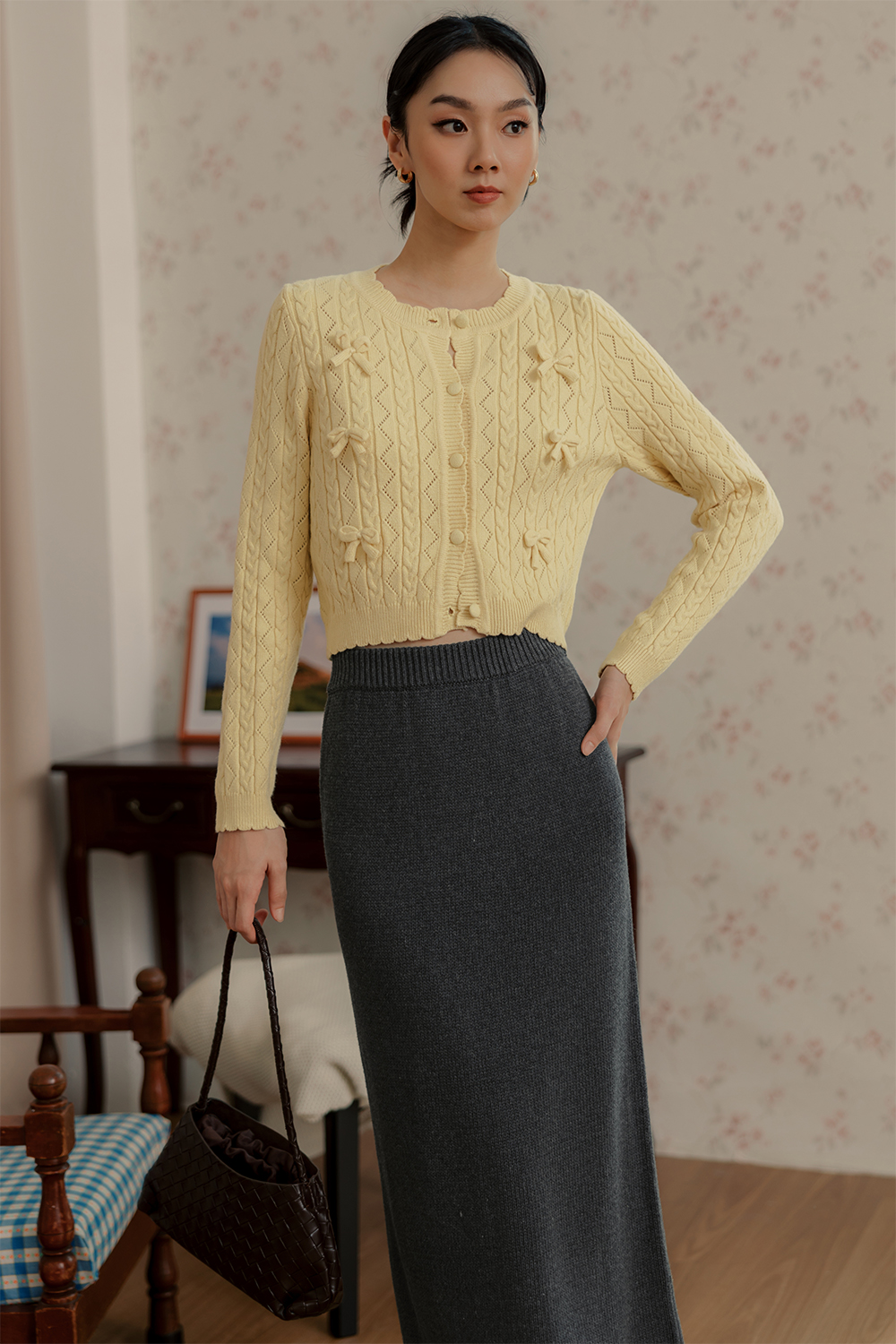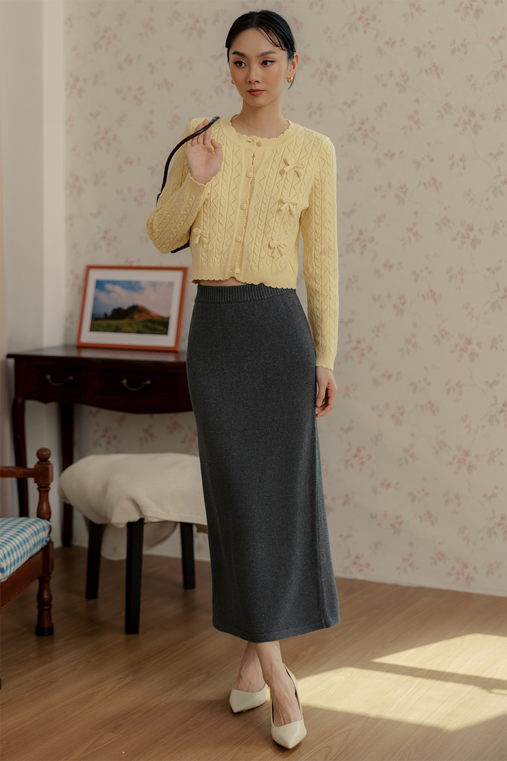 Ribbed texture with scallop hems around neckline, sleeves and hems.