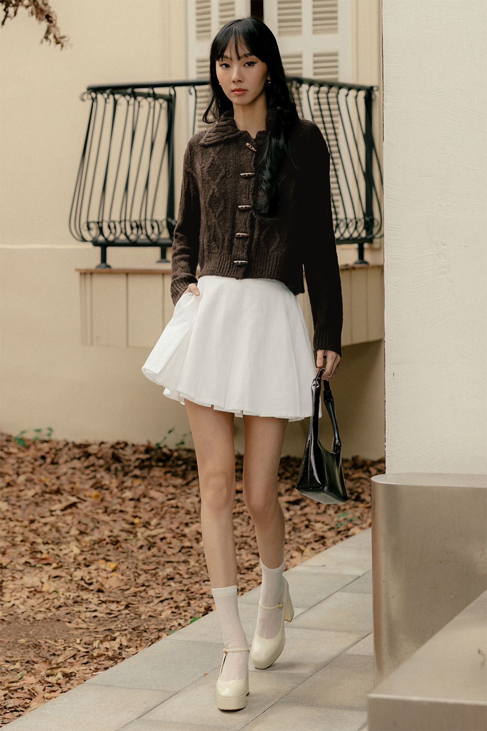 Features cable tie woven pattern on knitted fabric.