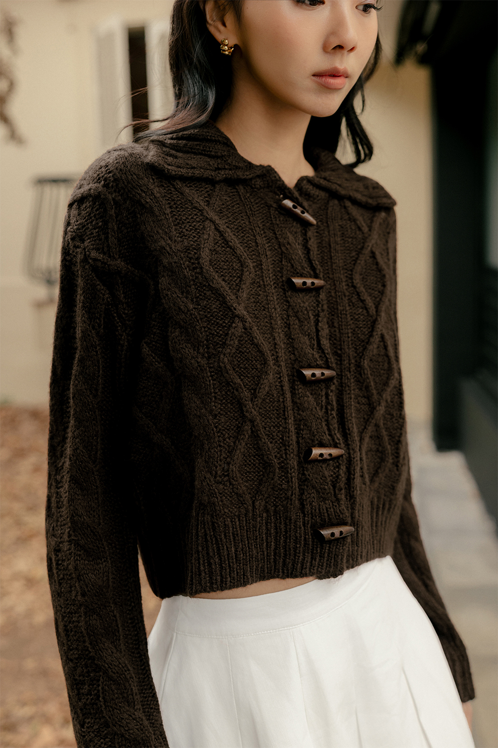 Functional statement wooden buttons down middle front.