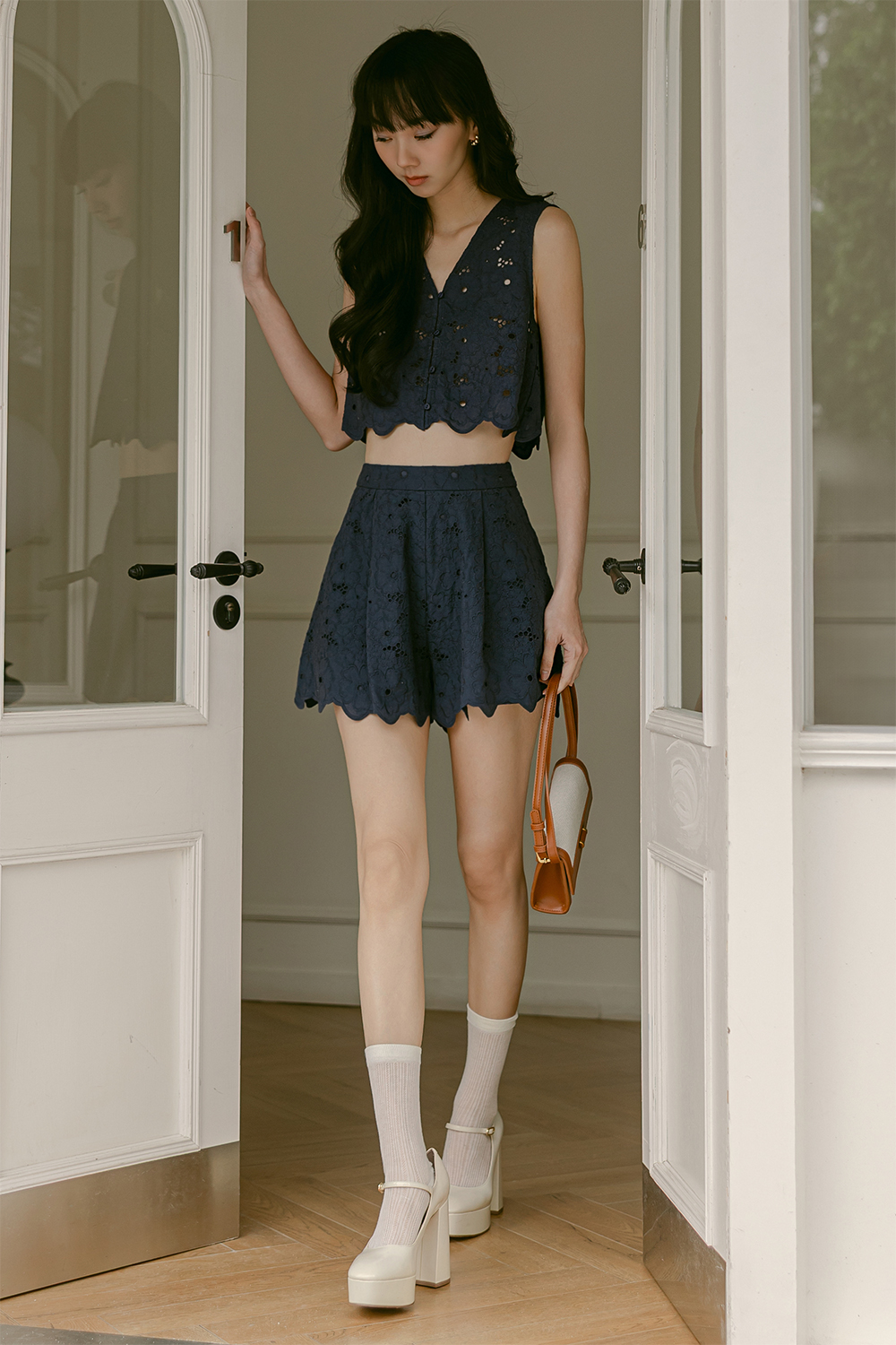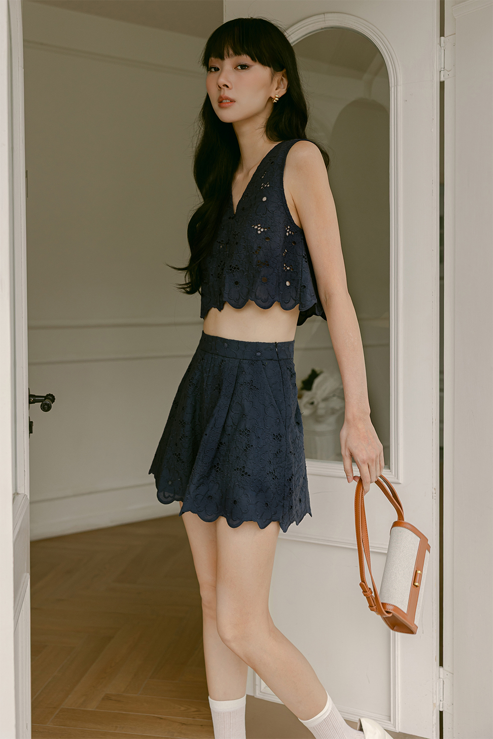 Features intricate floral embroidery and laser cut details on fabric.
