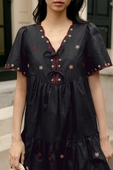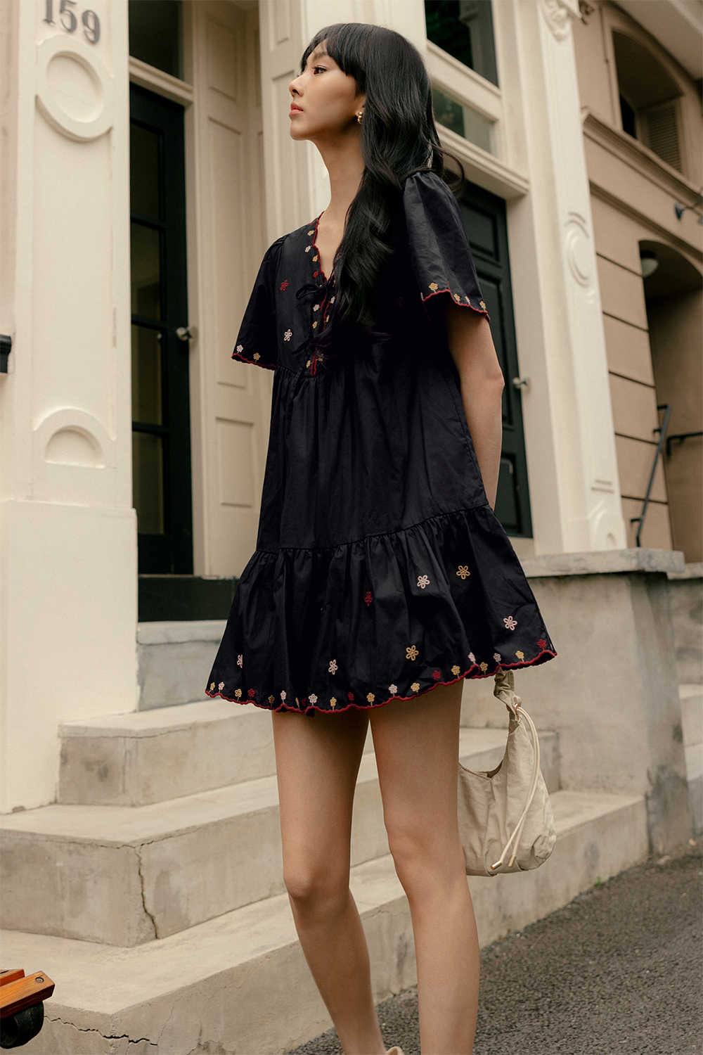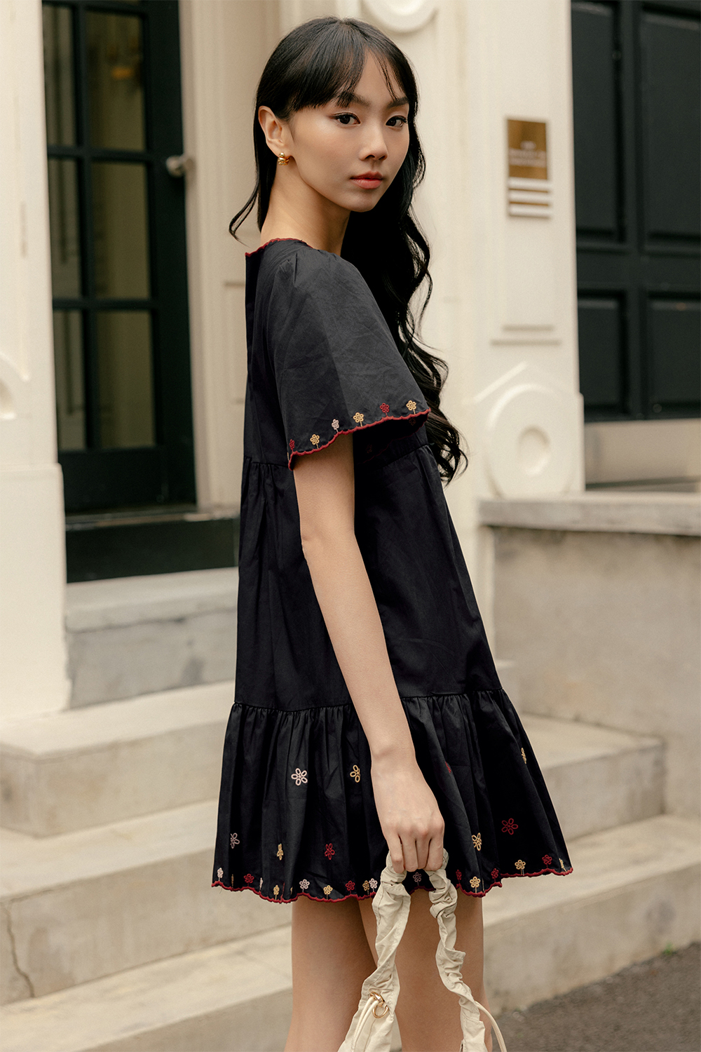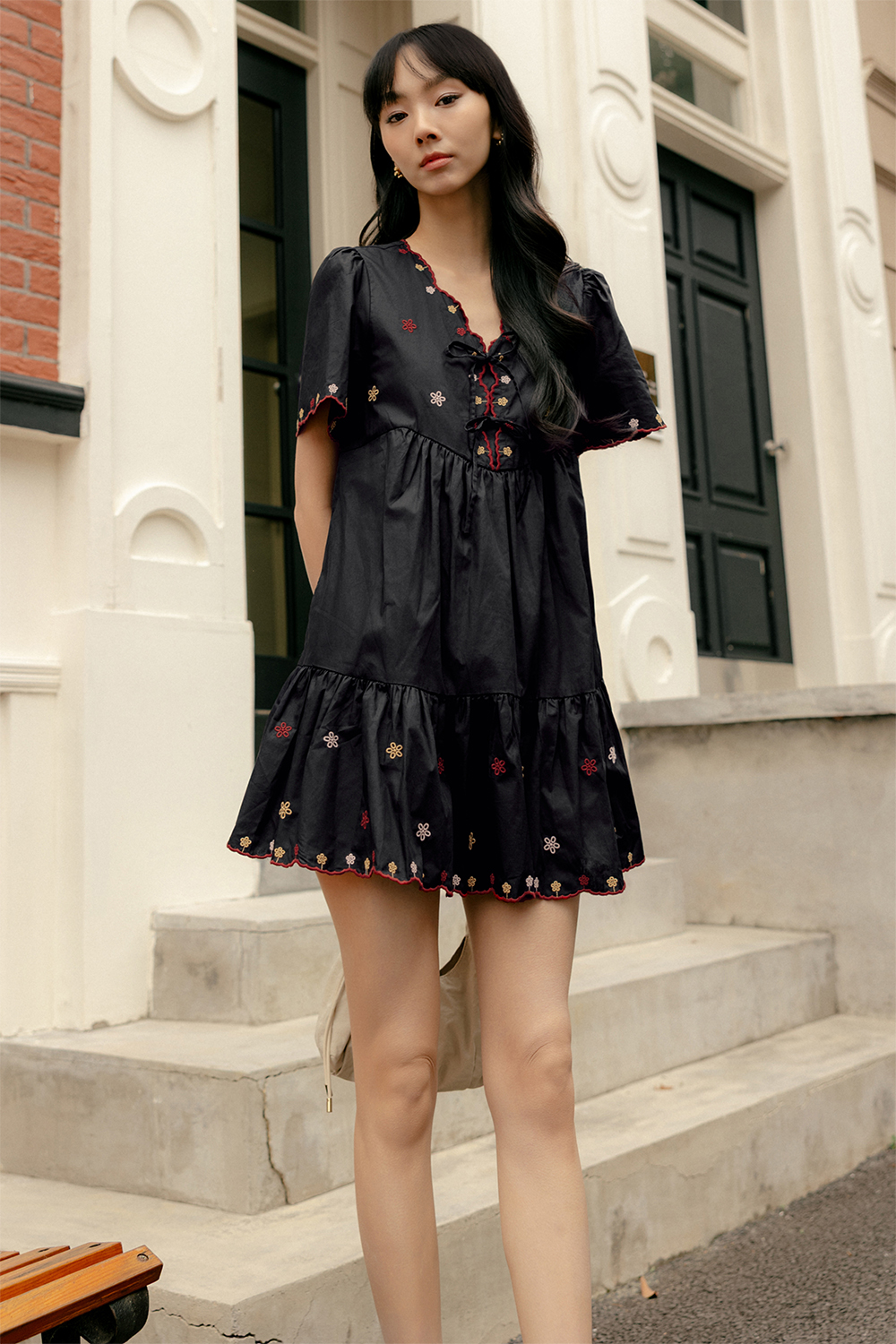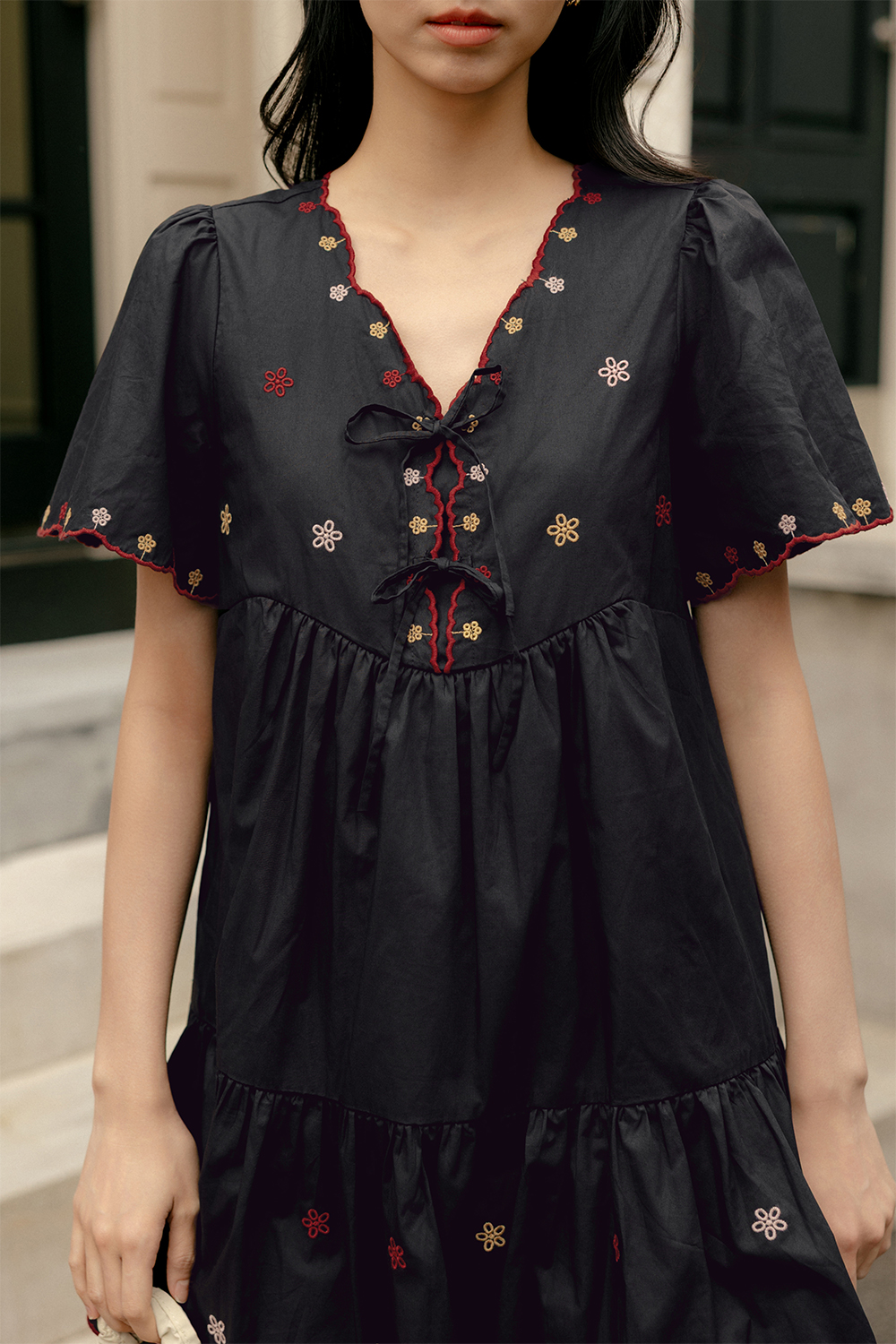 Slight babydoll flare tiered skirting with non-fitted waist.